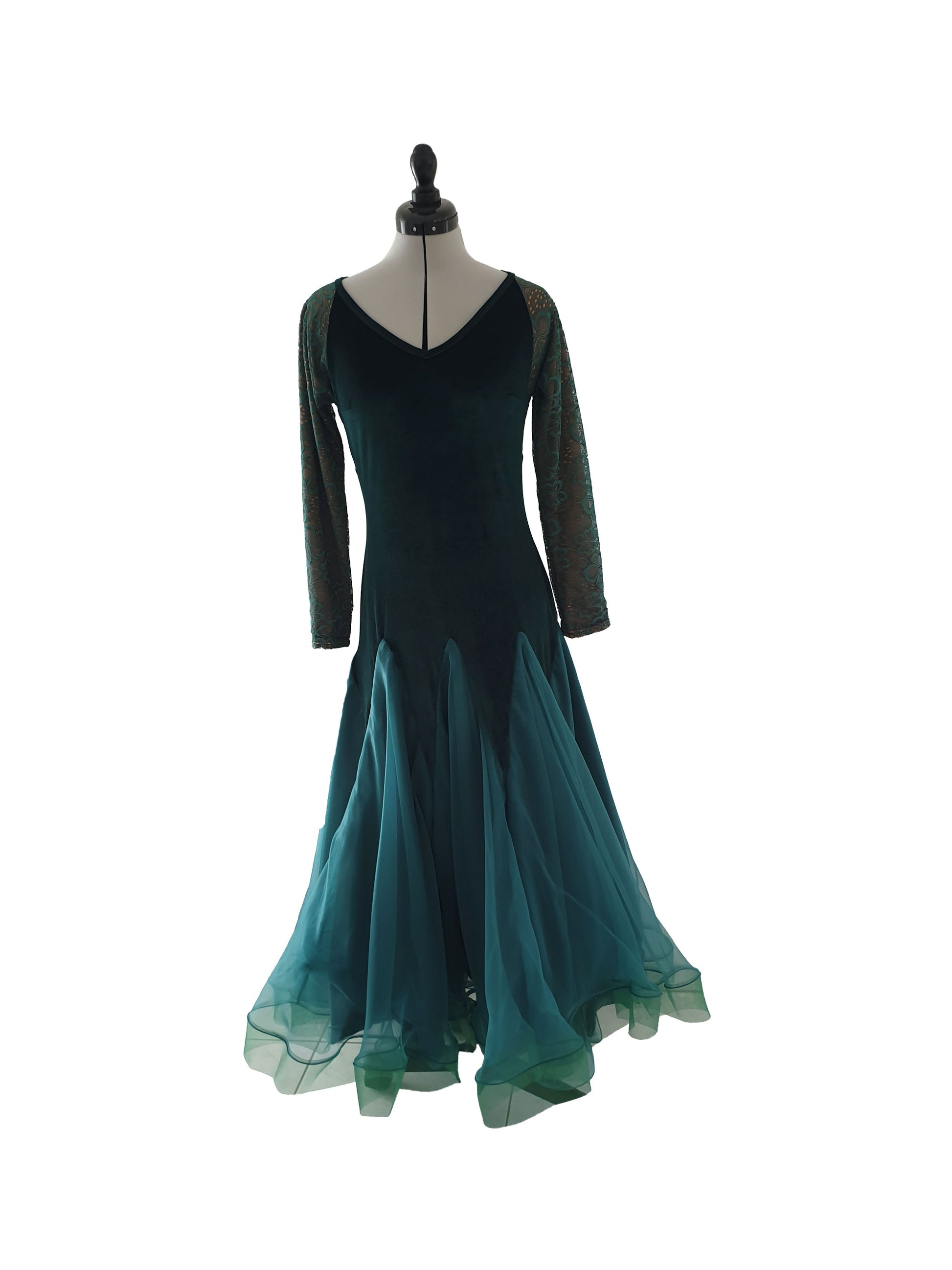Ab der Hüfte entfaltet sich das Kleid in prächtigen Spitzenmustern und geht in eine voluminöse Meerjungfrauen-Silhouette über. Das Oberteil aus weichem Stoff sorgt für ein angenehmes Tragegefühl auf der Haut. In der tiefen, tannengrünen Farbe, die an die Ruhe eines Waldes erinnert. Das Material ist aus Polyester und Tüll und dank des 3-lagigen Stoffes ist das Kleid eher schwer.