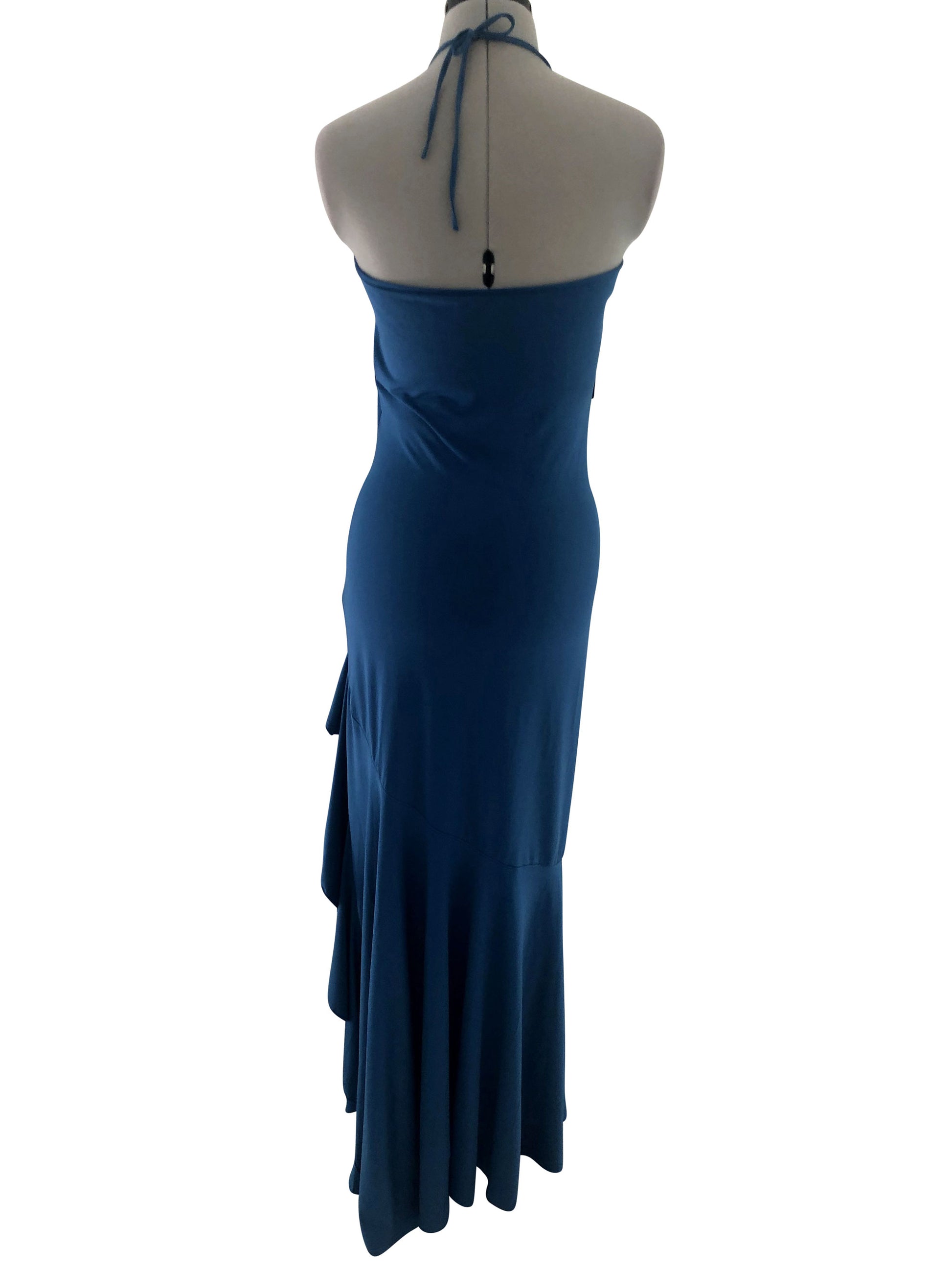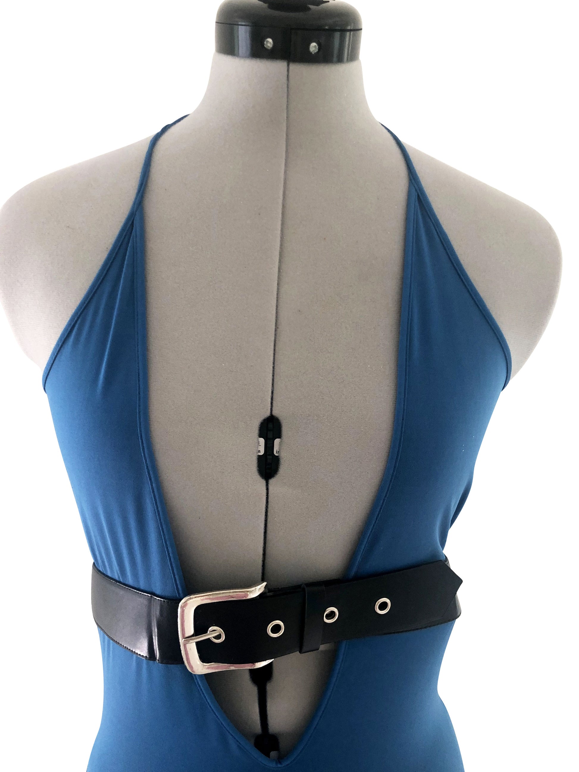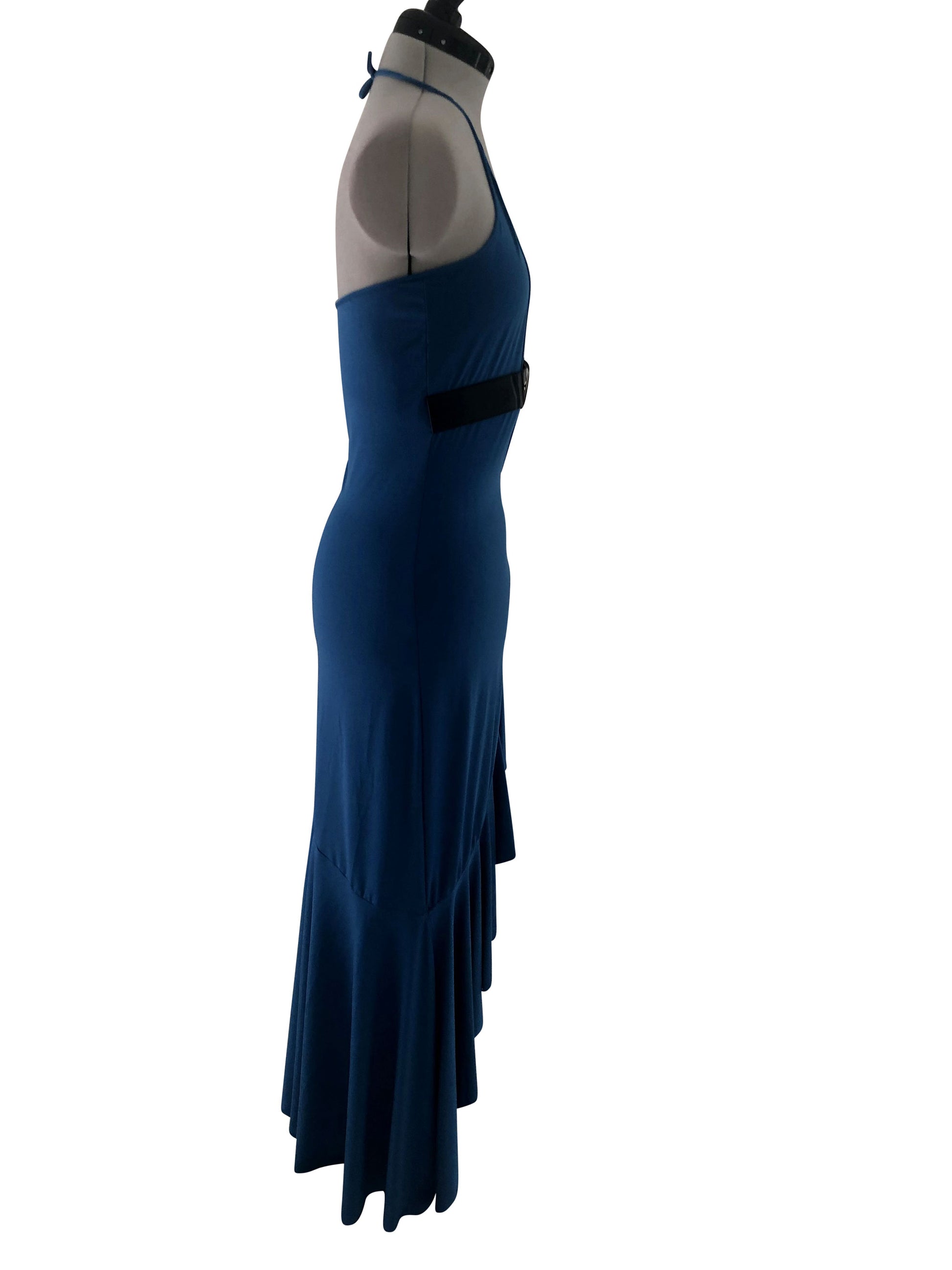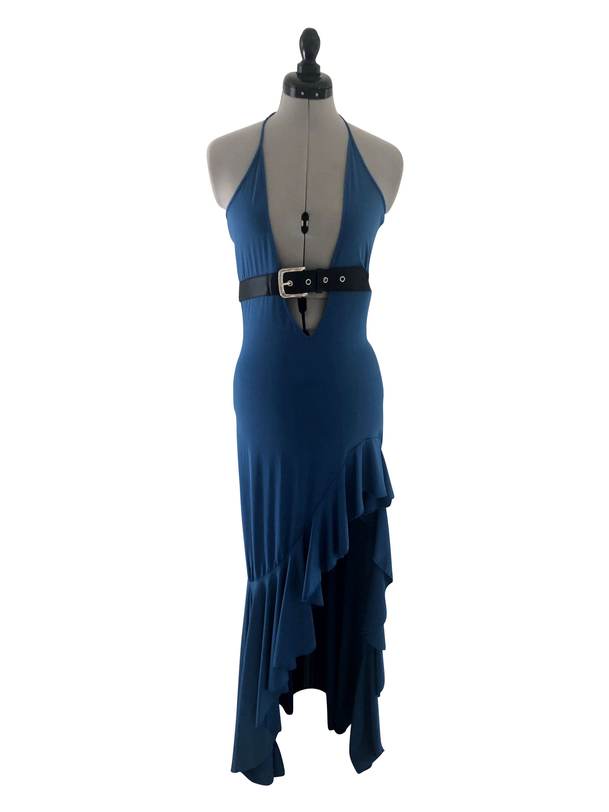 Dieses Abendkleid in blau ist ideal für die Grössen 34-36. Der tiefe V-Ausschnitt wird durch einen breiten schwarzen Gürtel akzentuiert, der der Taille eine definierte Struktur verleiht. Ab dem linken Oberschenkel verläuft das Kleid leicht abgeschrägt, was der Silhouette eine verspielte und dynamische Note verleiht.