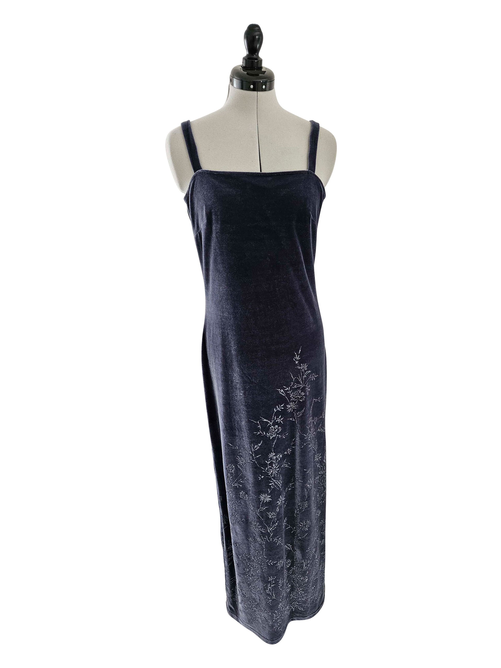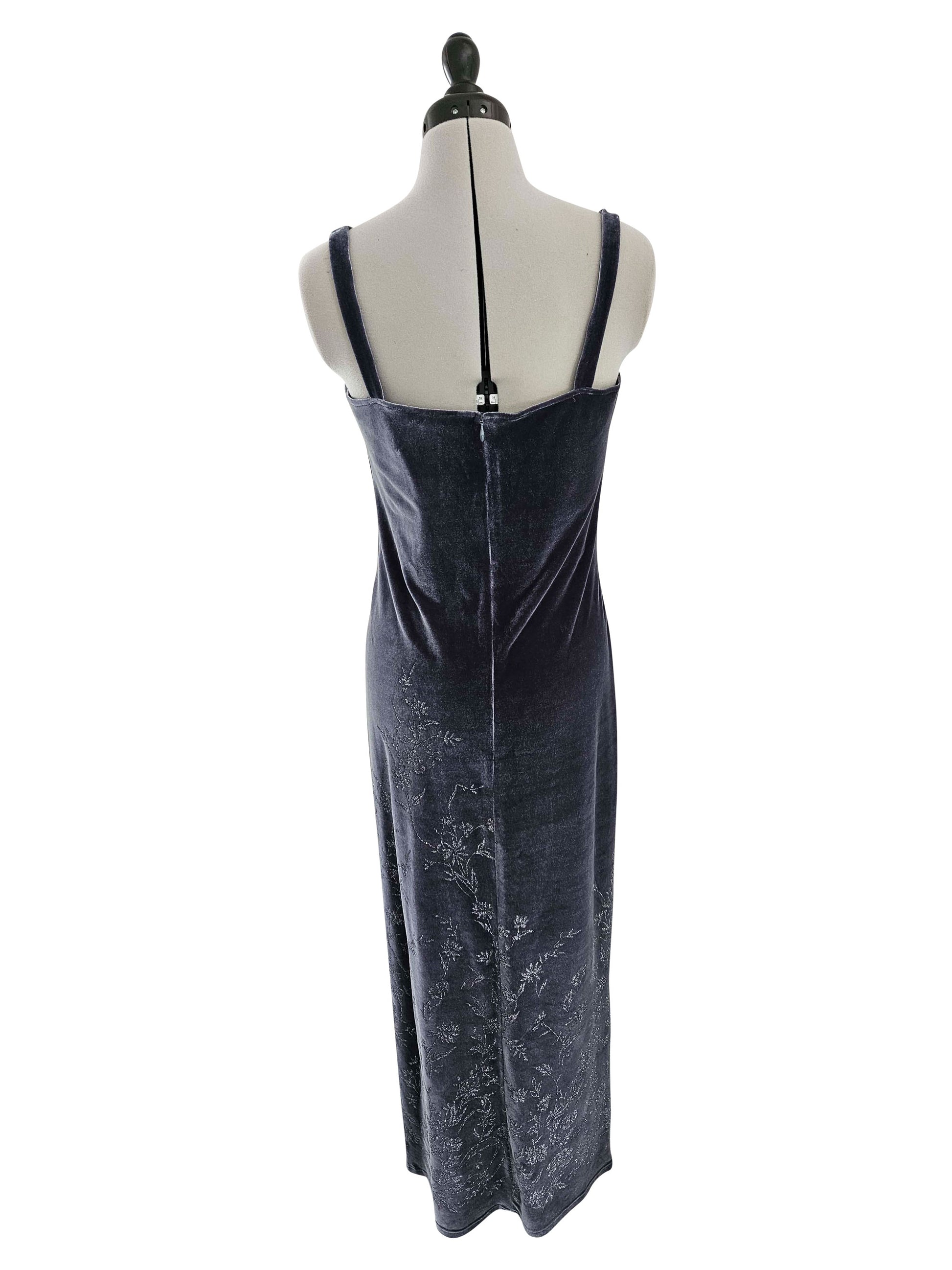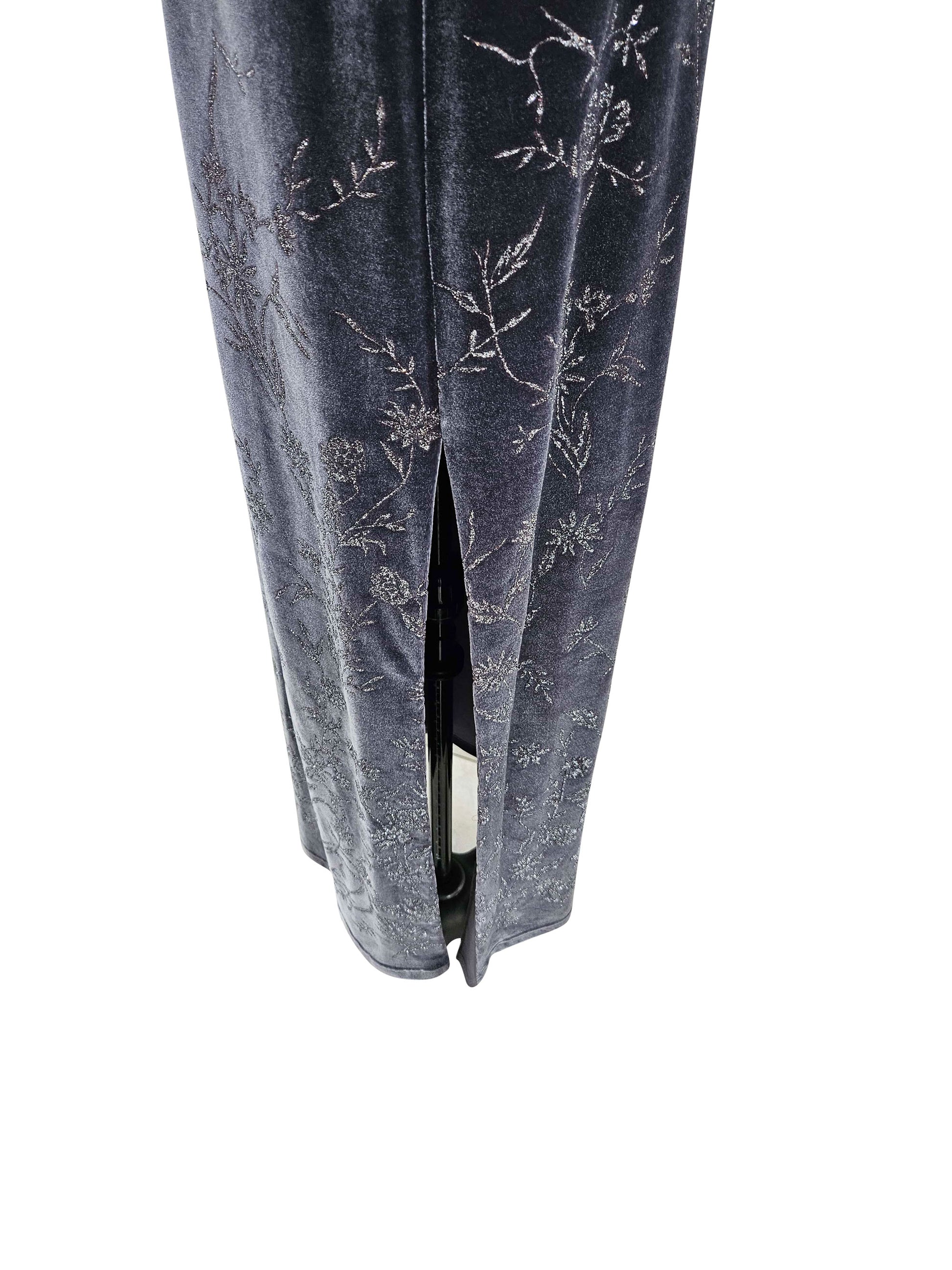 Dieses schlichte Etuikleid in tiefem Anthrazit wird durch glitzernde Stickereien am unteren Teil akzentuiert. Mit den breiten, nicht verstellbaren Trägern bietet es zuverlässigen Halt und Komfort, ideal für lange Abende. Das Kleid hat auf der linken Seite einen Schlitz.