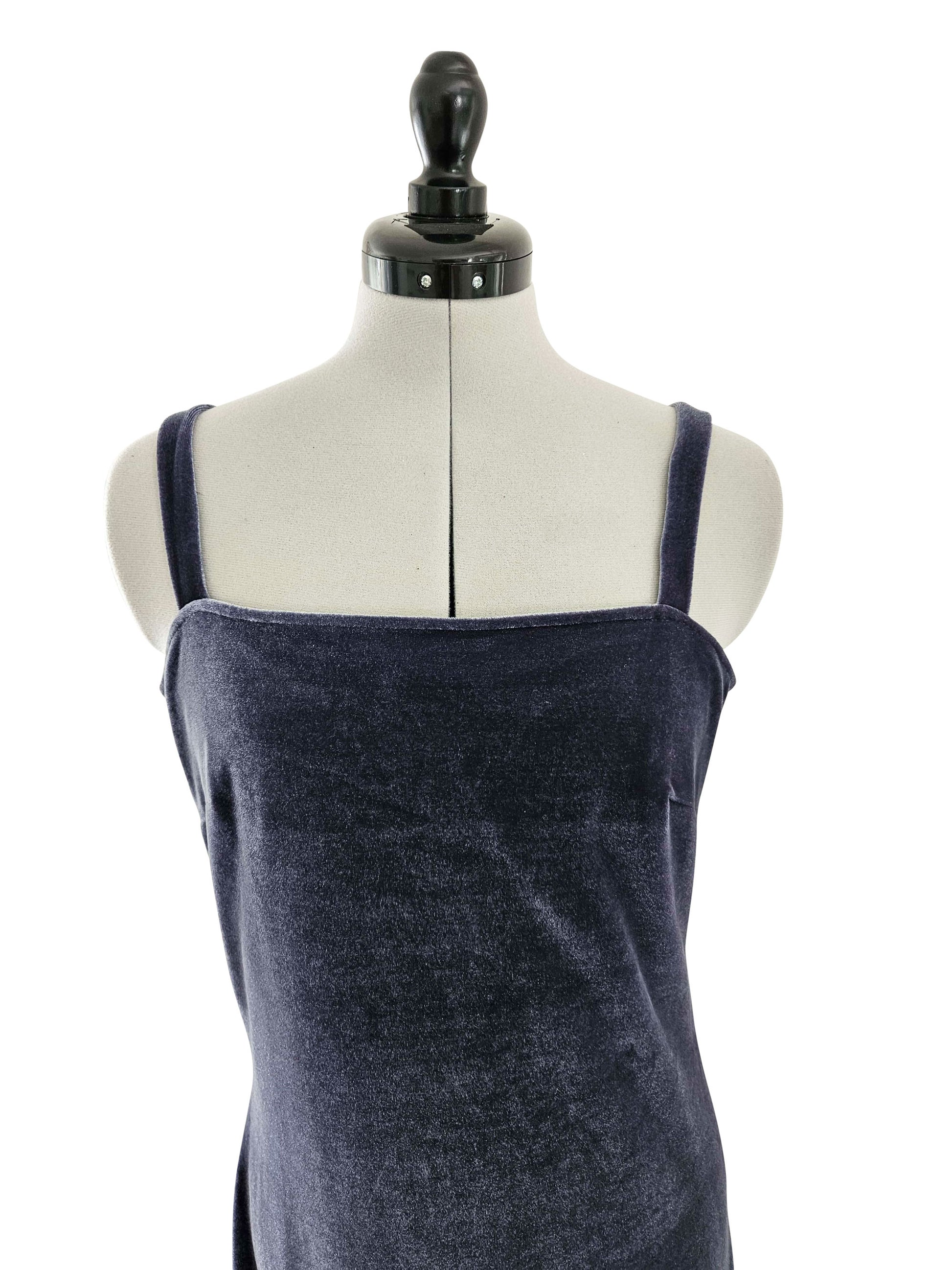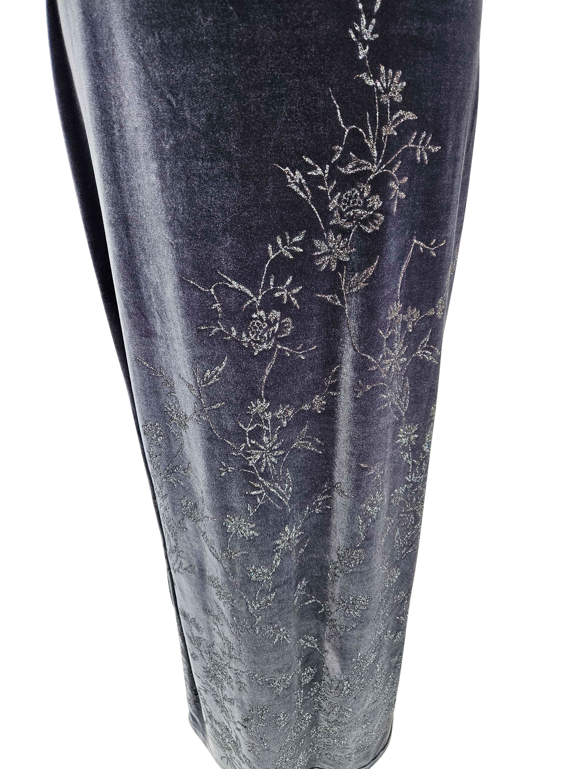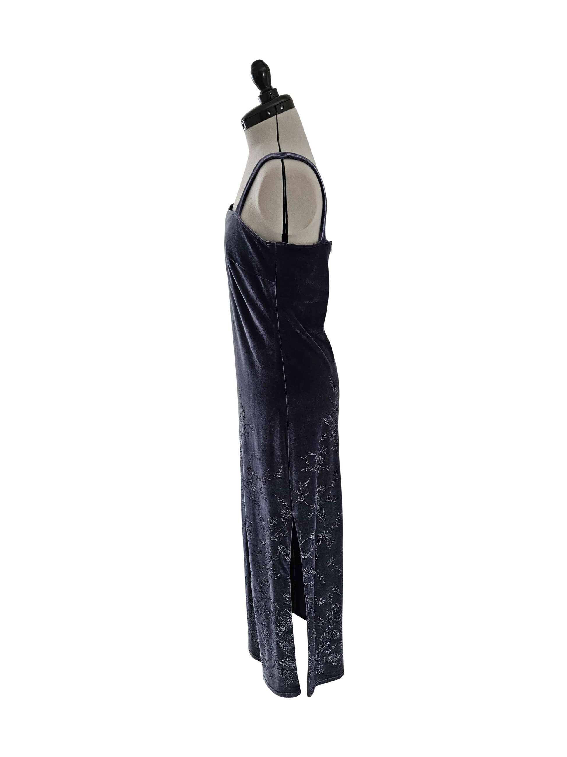 Dieses schlichte Etuikleid in tiefem Anthrazit wird durch glitzernde Stickereien am unteren Teil akzentuiert. Mit den breiten, nicht verstellbaren Trägern bietet es zuverlässigen Halt und Komfort, ideal für lange Abende. Das Kleid hat auf der linken Seite einen Schlitz.
