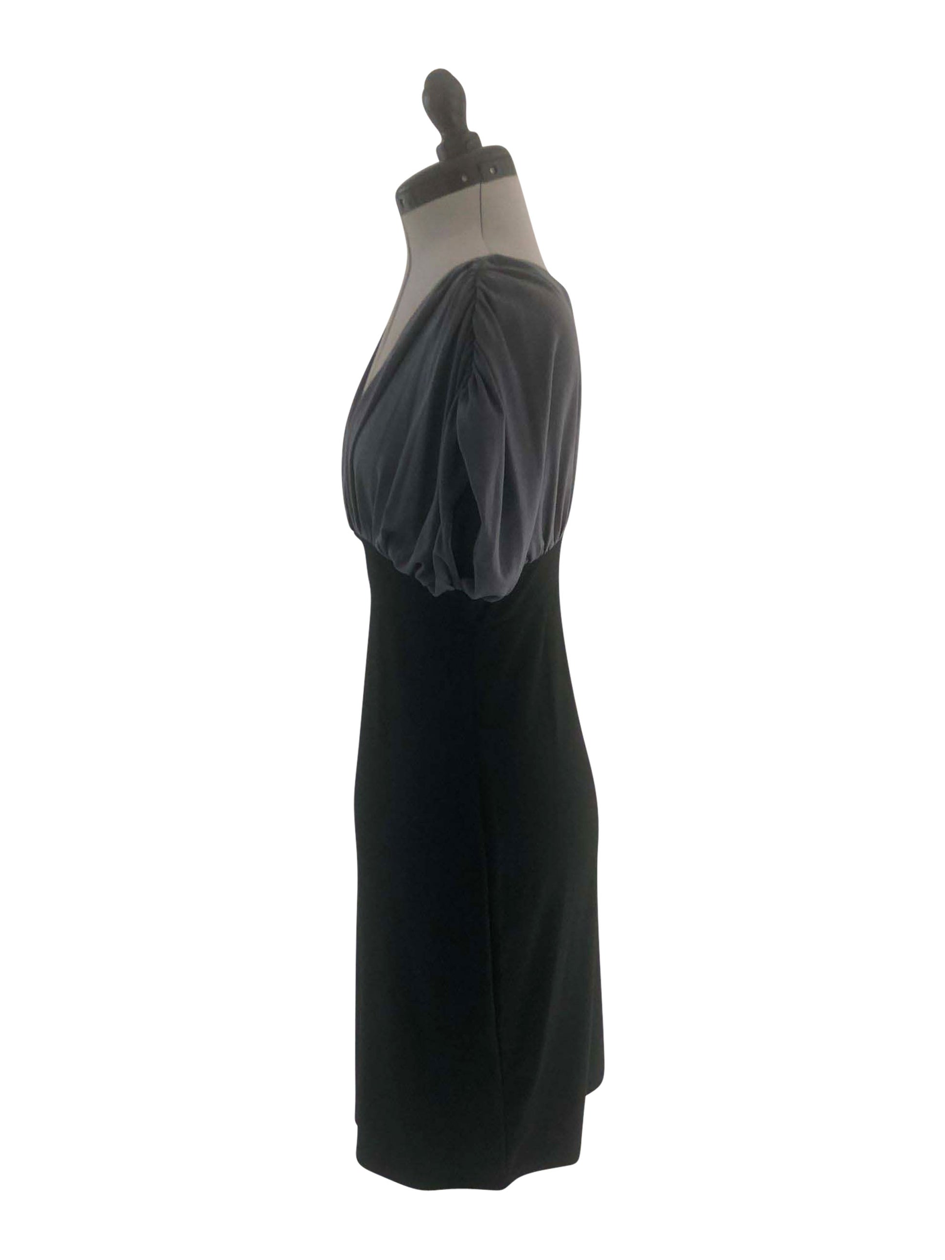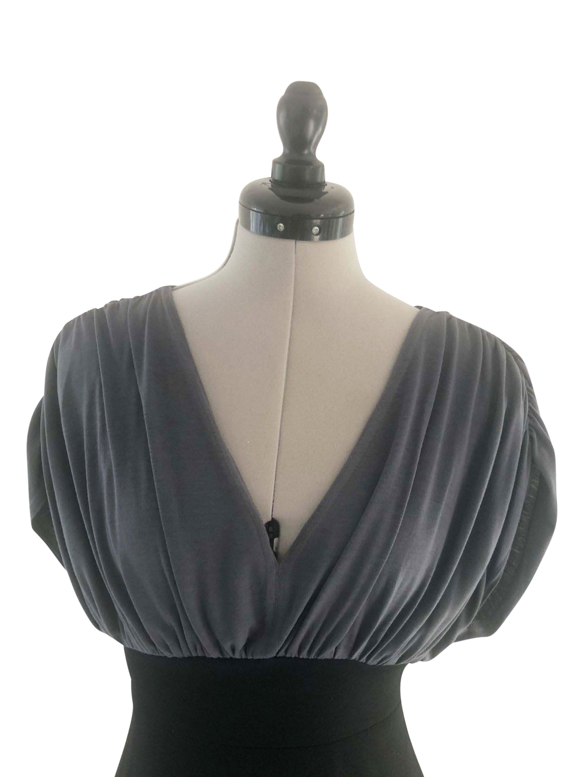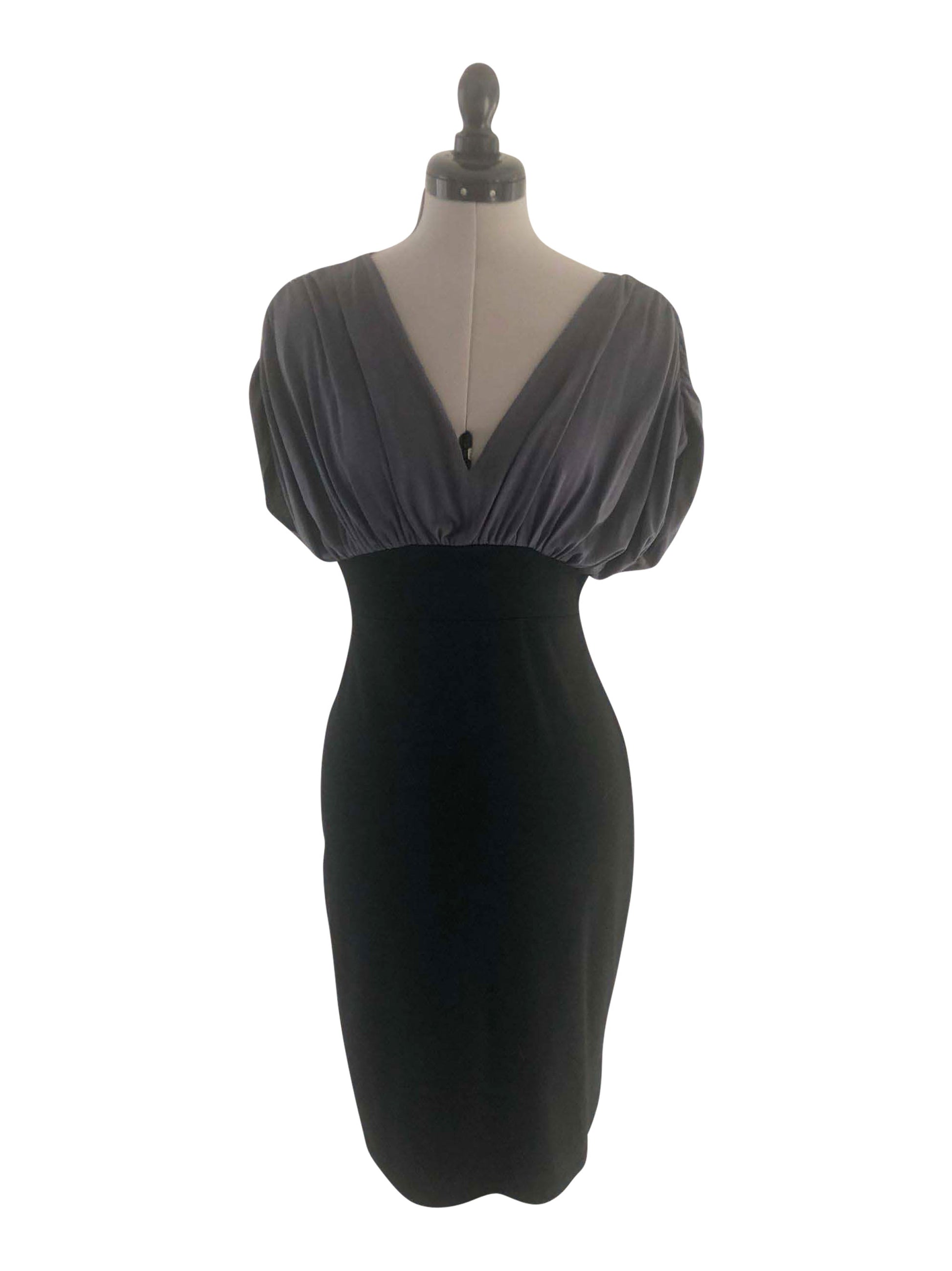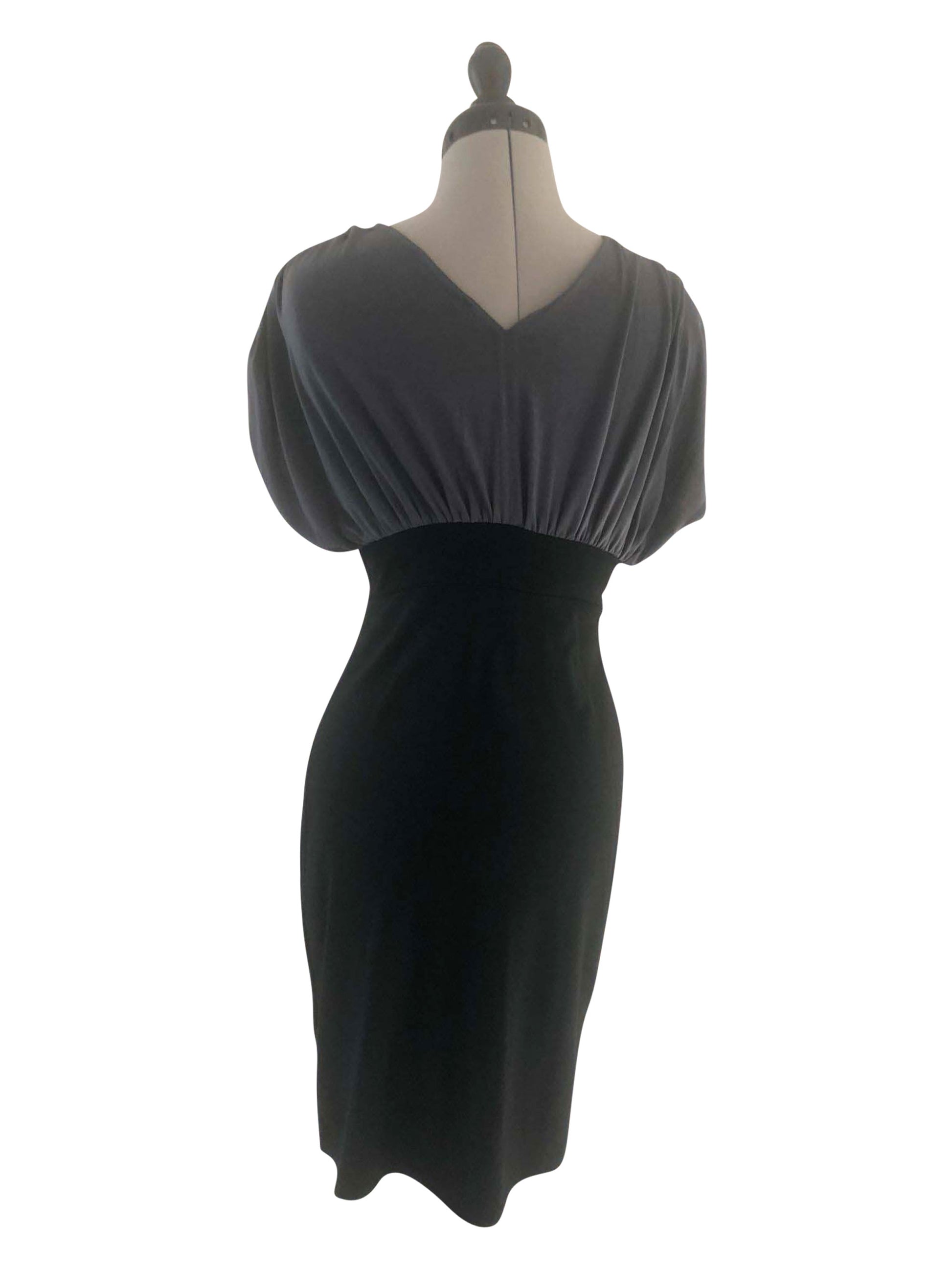 Entdecke die Eleganz des modernen Minimalismus mit diesem kurzen, ärmellosen Cocktailkleid. Das graue Oberteil ist drapiert, die nahtlos in den eng anliegenden schwarzen Rock übergeht. Perfekt für Größen 36-38 und gefertigt aus bequemem Jersey, bietet dieses Kleid mit V-Ausschnitt sowohl Stil als auch Komfort. Der gerade Schnitt und die schlichte, zweifarbige Gestaltung machen es zu einem vielseitigen Stück für jeden Anlass.