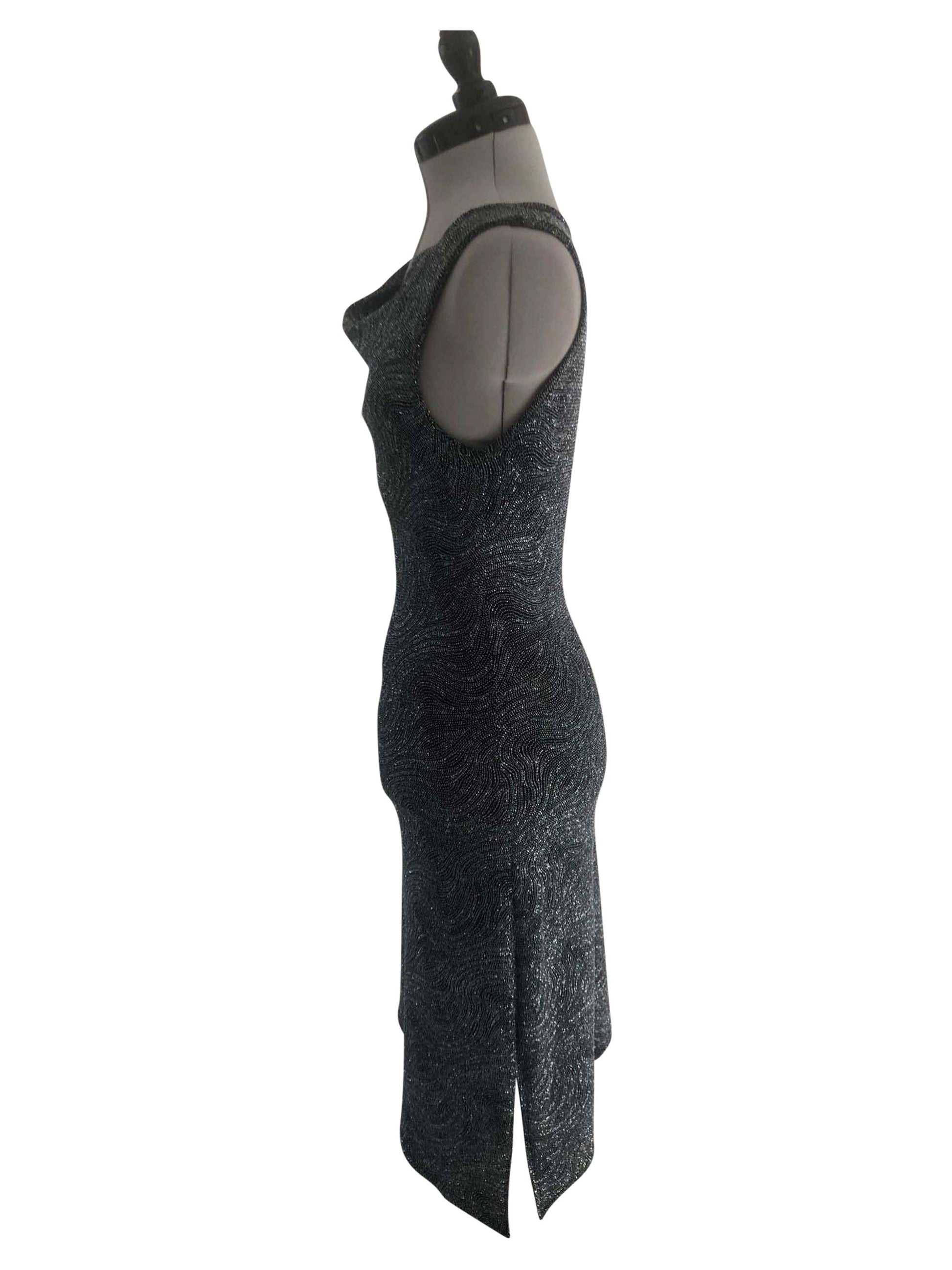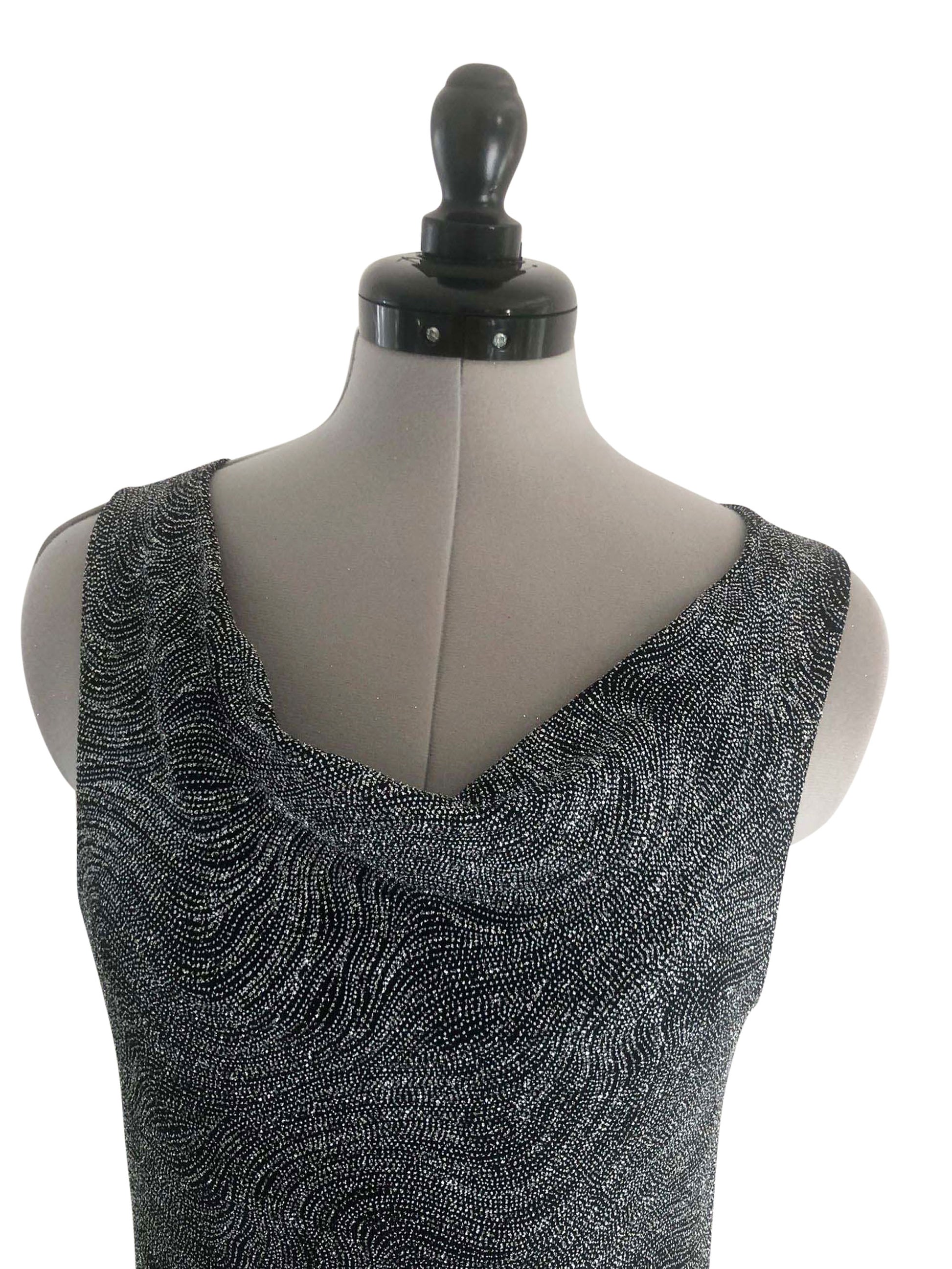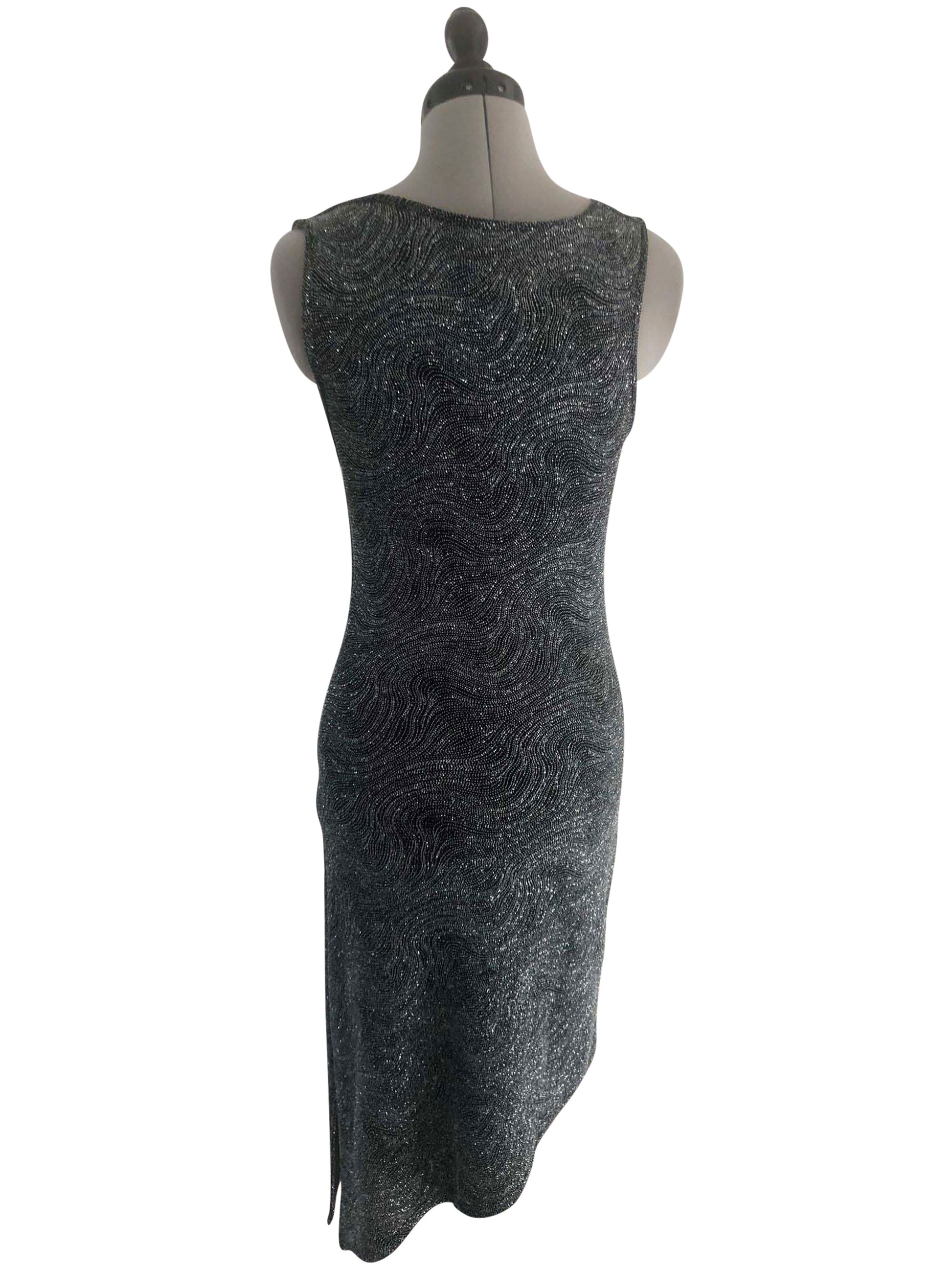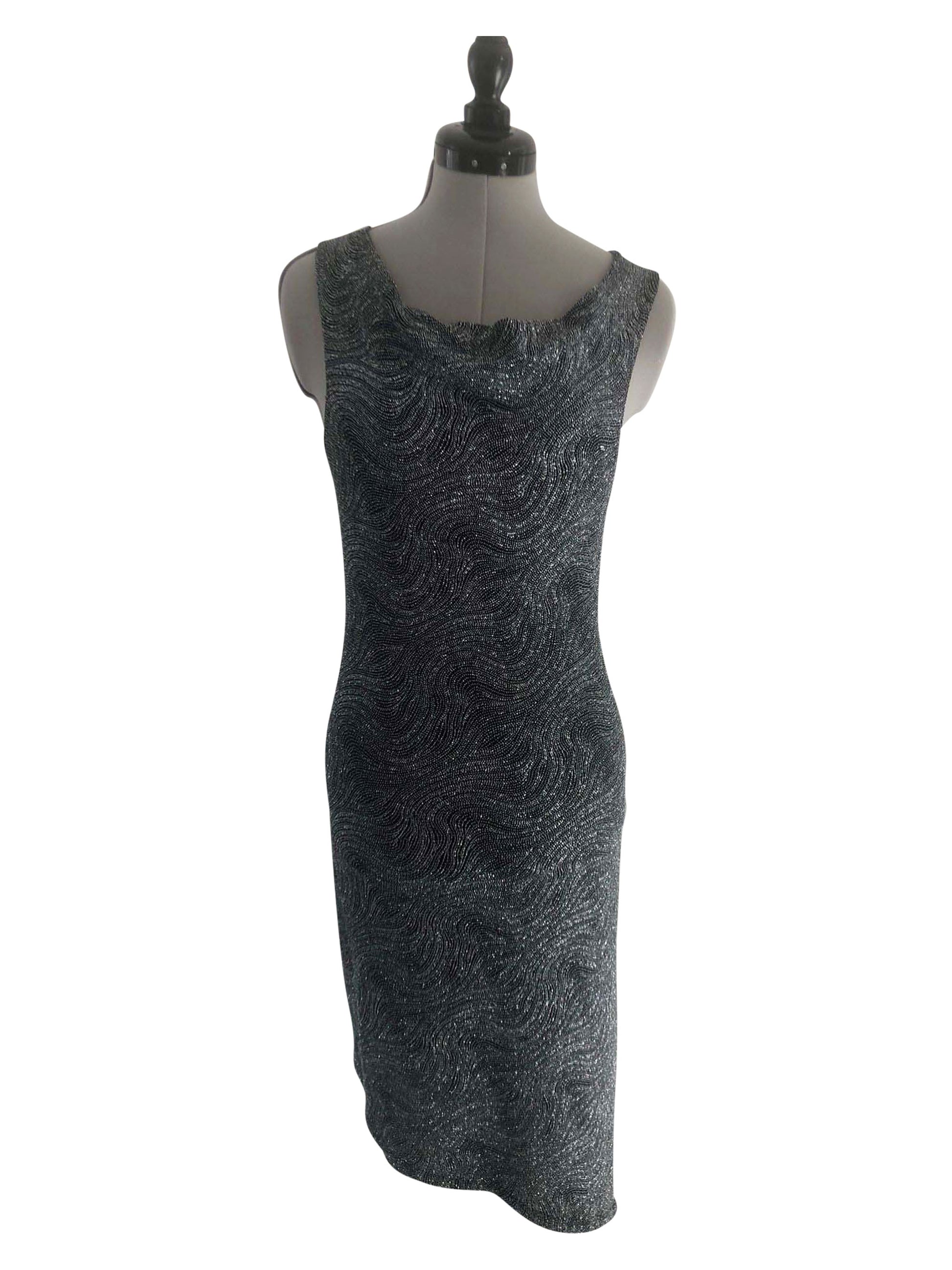 Erstrahle in unserem figurbetonten, ärmellosen Cocktailkleid in schimmerndem Silber. Der Rock dieses Kleides beeindruckt mit seinem schrägen Abschluss, wobei die längere Seite einen spielerischen, asymmetrischen Look verleiht. Ein eleganter Wasserfallausschnitt ergänzt die eng anliegende Passform, perfekt für Grössen 36-38. Aus dehnbarem Stretch-Stoff gefertigt, verspricht dieses einteilige Kleid Komfort und Bewegungsfreiheit bei jeder Gelegenheit.