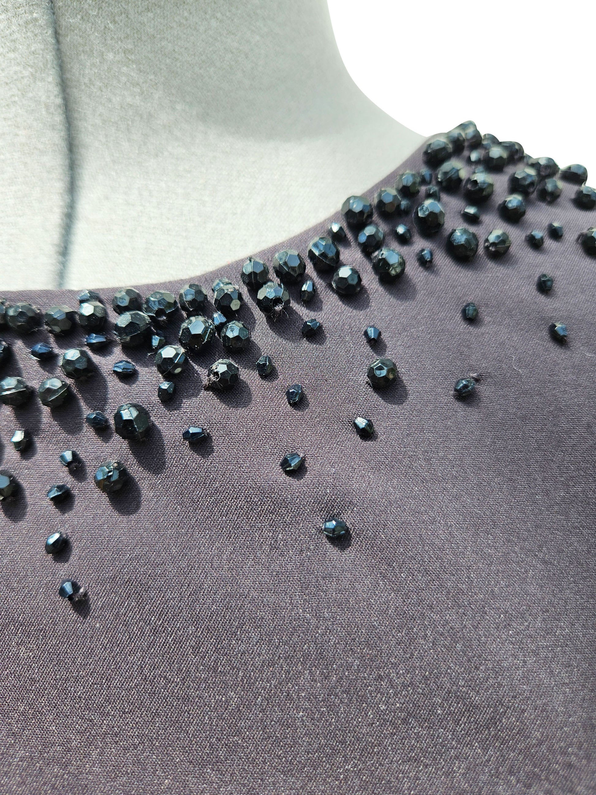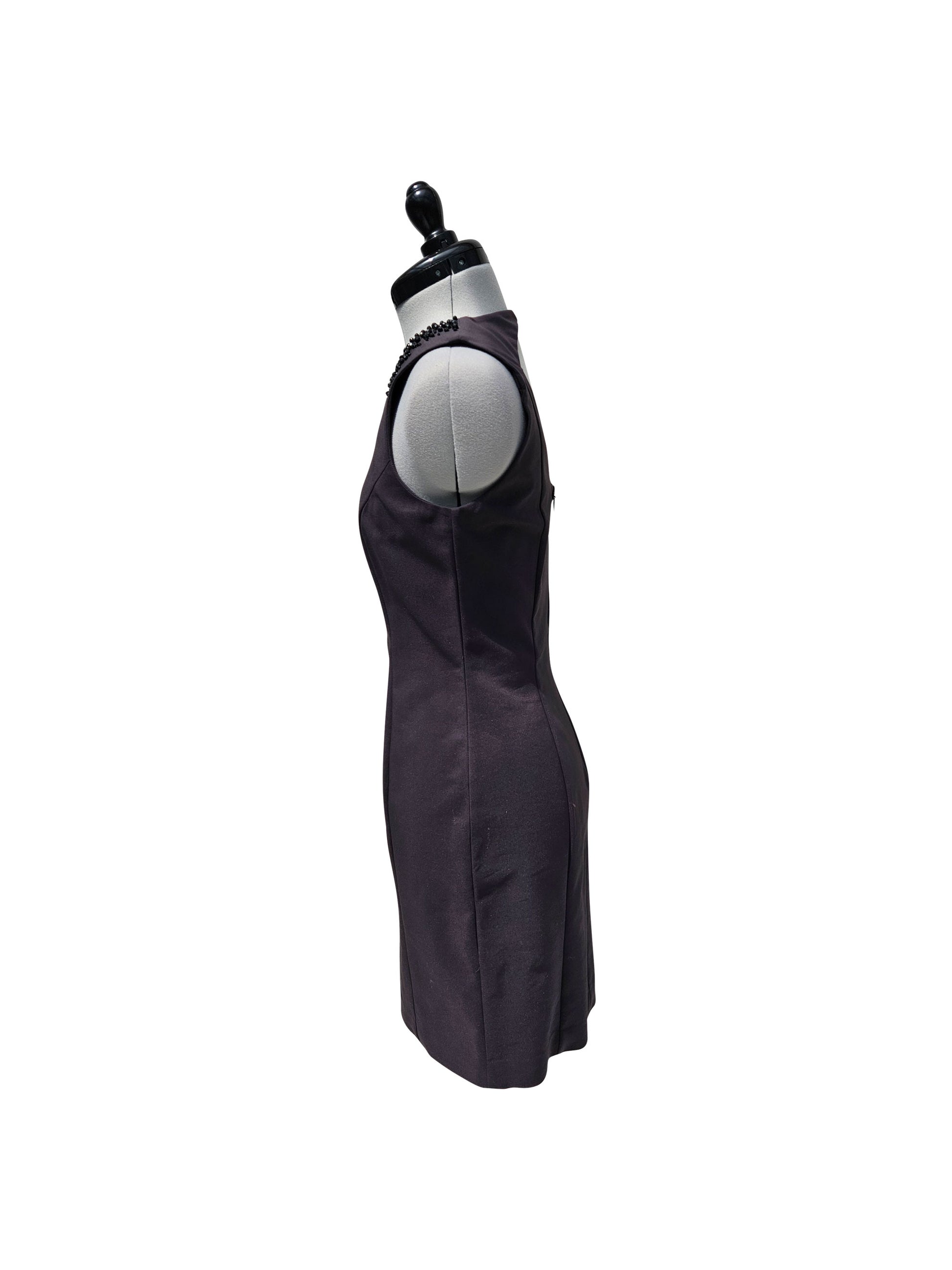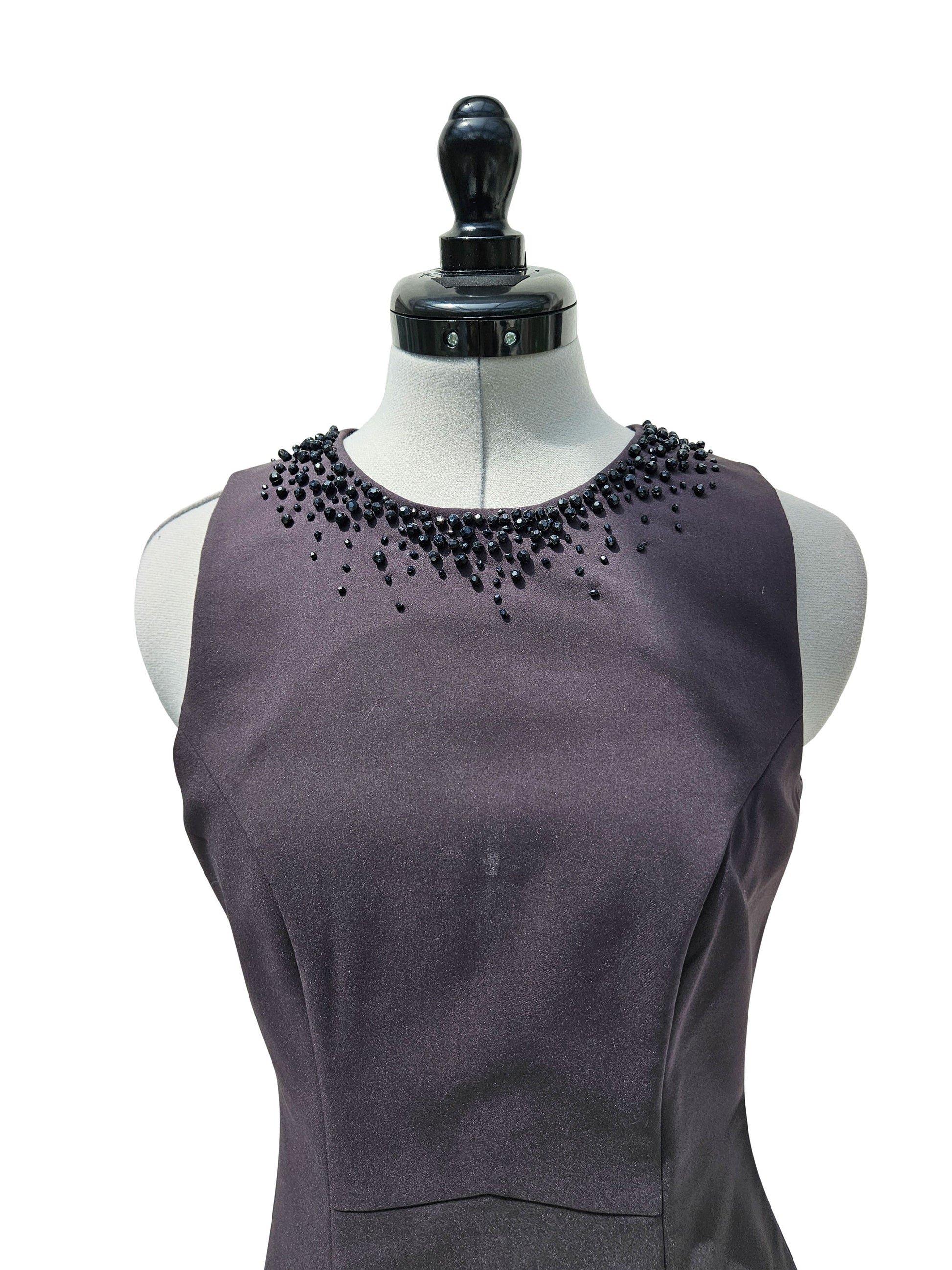 Verkörpere Eleganz und Stil mit unserem ärmellosen Etuikleid, das sich durch eine exquisite Verzierung aus braunen Perlen rund um den runden Ausschnitt auszeichnet. Dieses Kleid in klassischem Braun ist ideal für Grösse 36 und bietet eine perfekt taillierte, gerade Passform,
