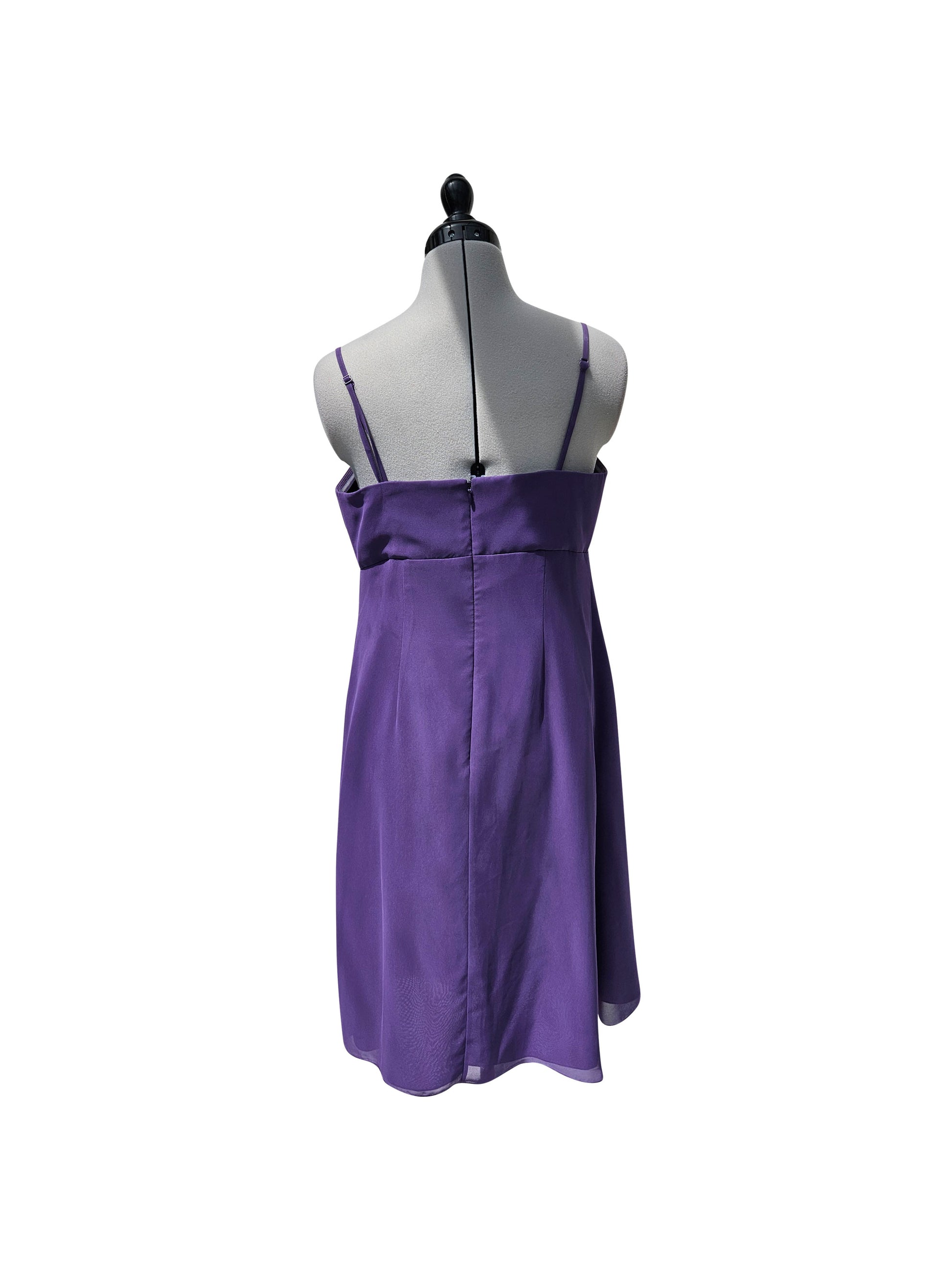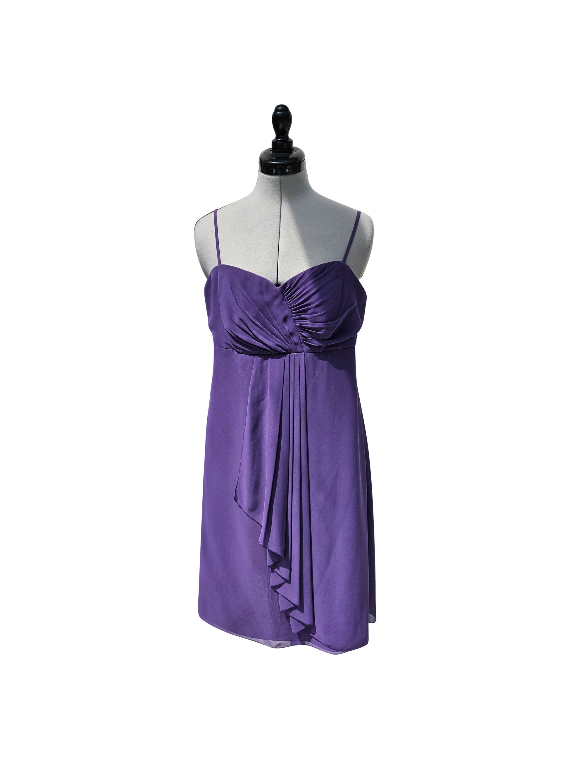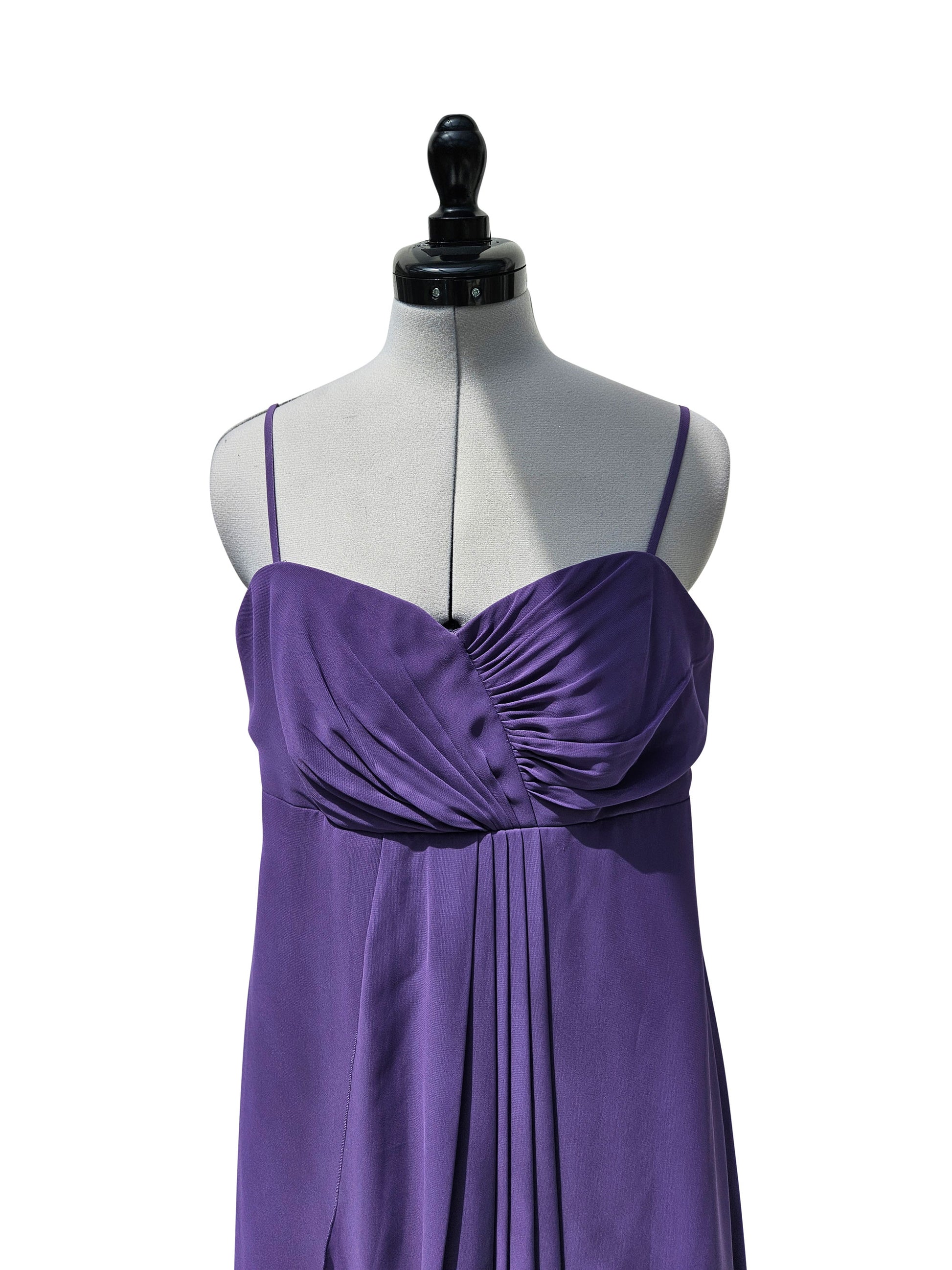 Tauche ein in die Eleganz dieses Spaghettiträgerkleides im Empirestil, gefertigt in einem tiefen Pflaumenton. Dieses Kleid in Grösse 42 kombiniert einen herzförmigen Ausschnitt mit einem kunstvoll drapierten, locker hängenden Oberteil.