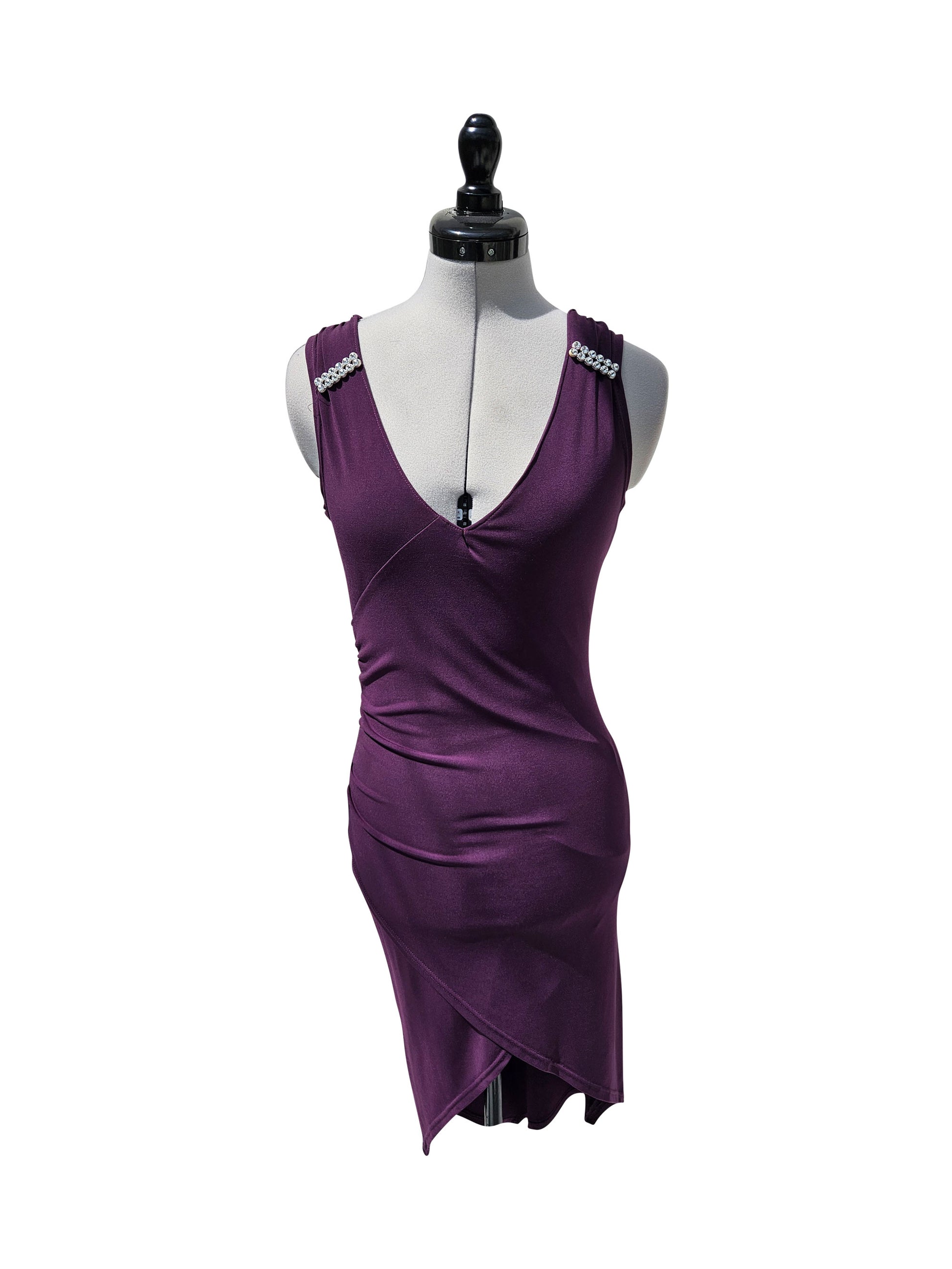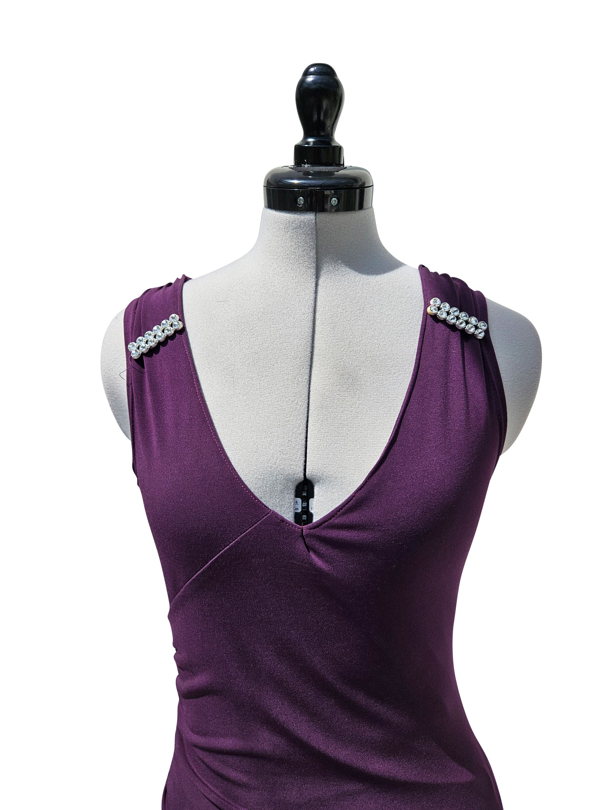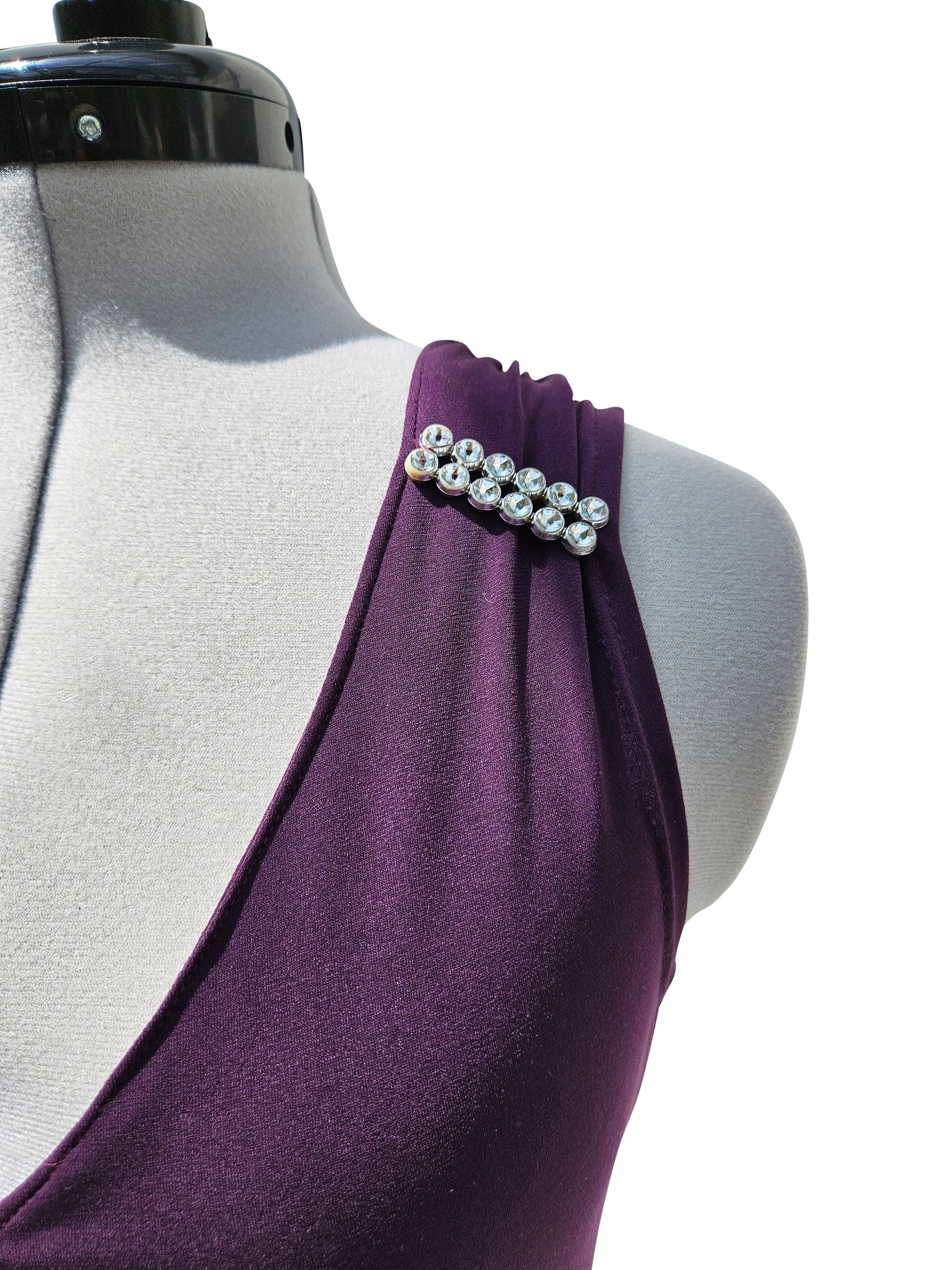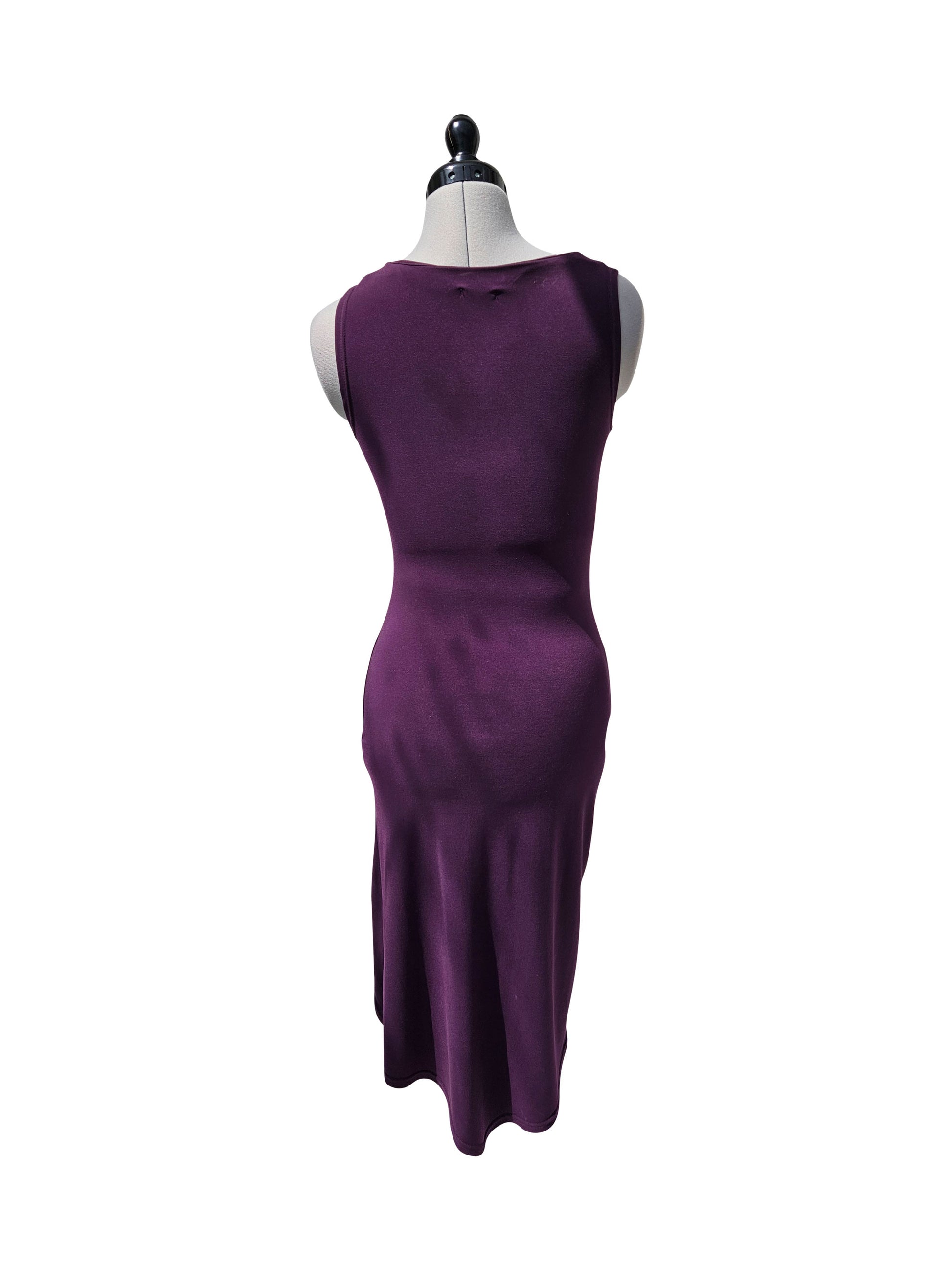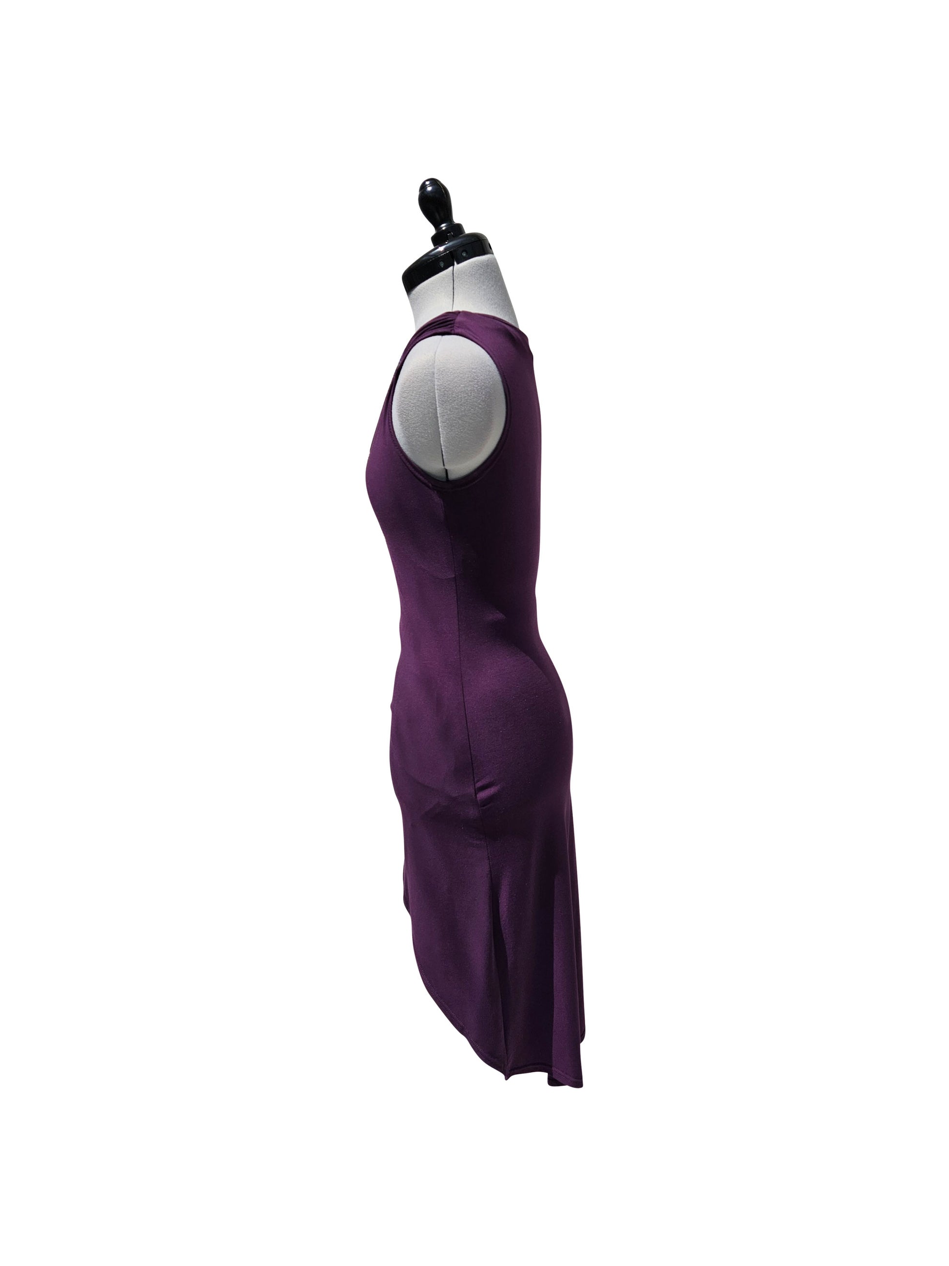 Dieses ärmellose, figurbetonte Cocktailkleid in der edlen Farbe Aubergine zeichnet sich durch sein körpernahes Design aus, das die weibliche Silhouette elegant zur Geltung bringt. Der gewickelte Rock verleiht dem Kleid Dynamik, während der V-Ausschnitt das Dekolleté stilvoll betont. Gefertigt aus Jersey-Stretch-Material, bietet das einteilige Kleid einen angenehmen Tragekomfort, ohne die Form zu verlieren.