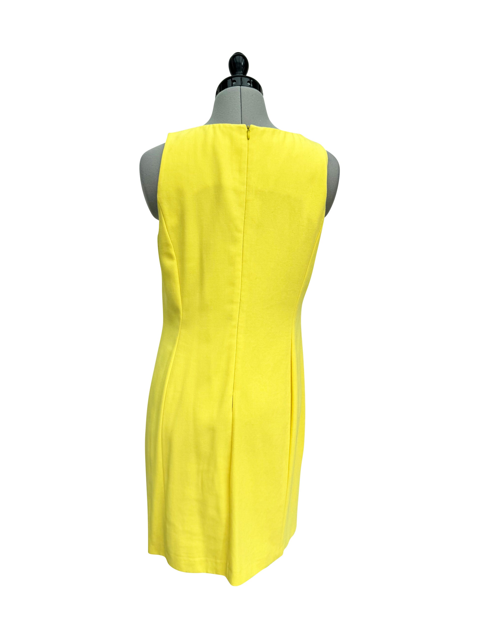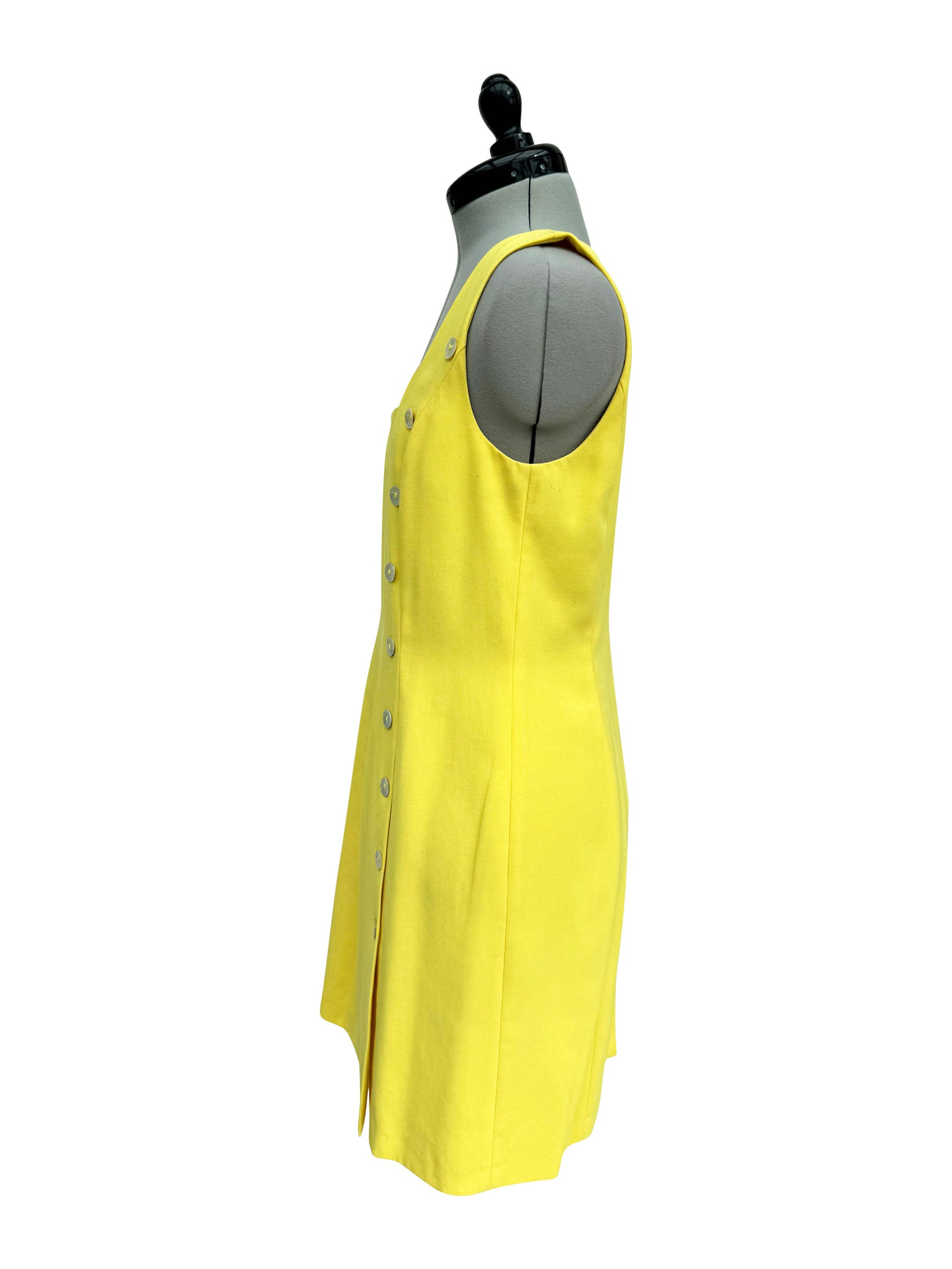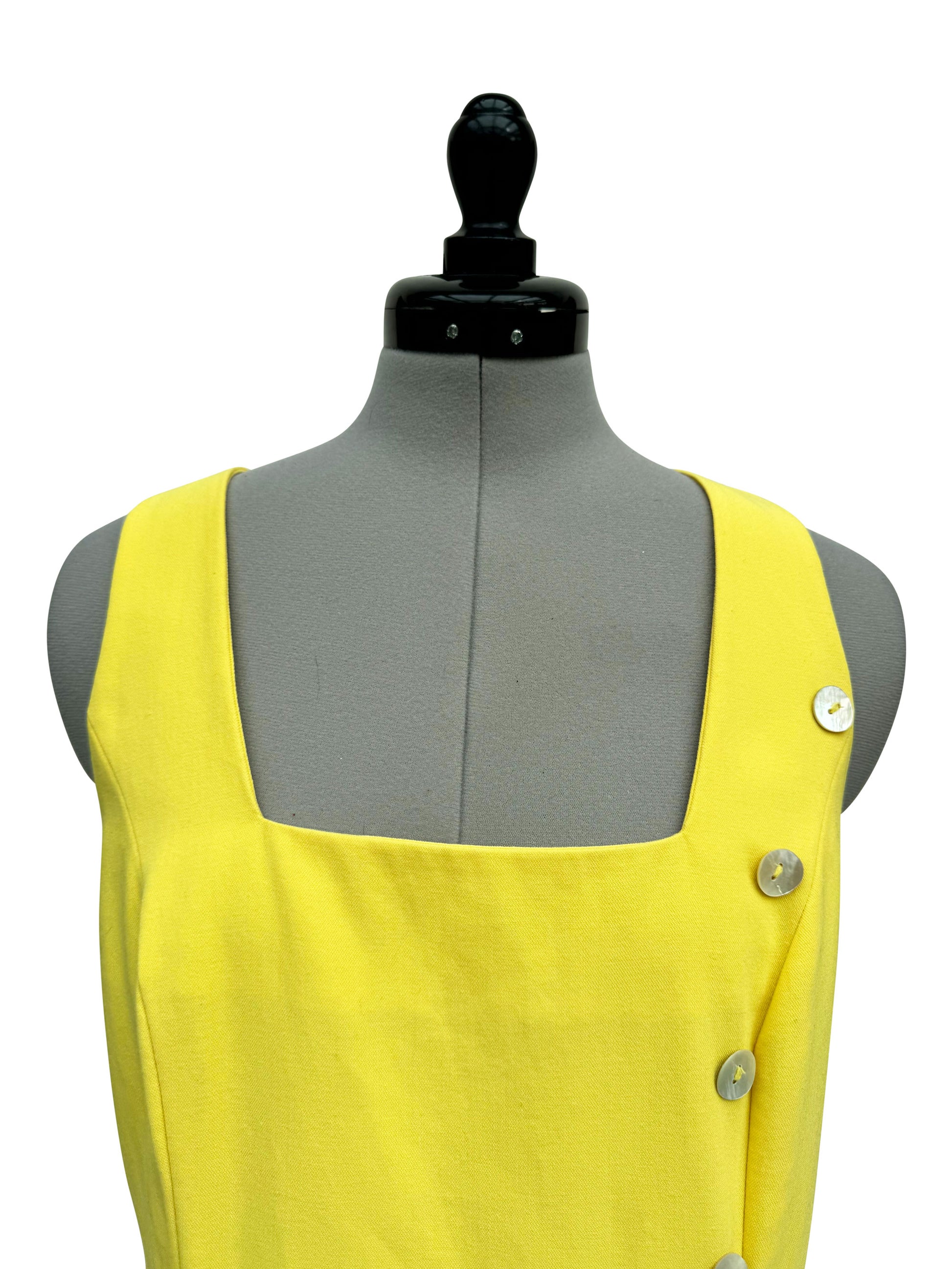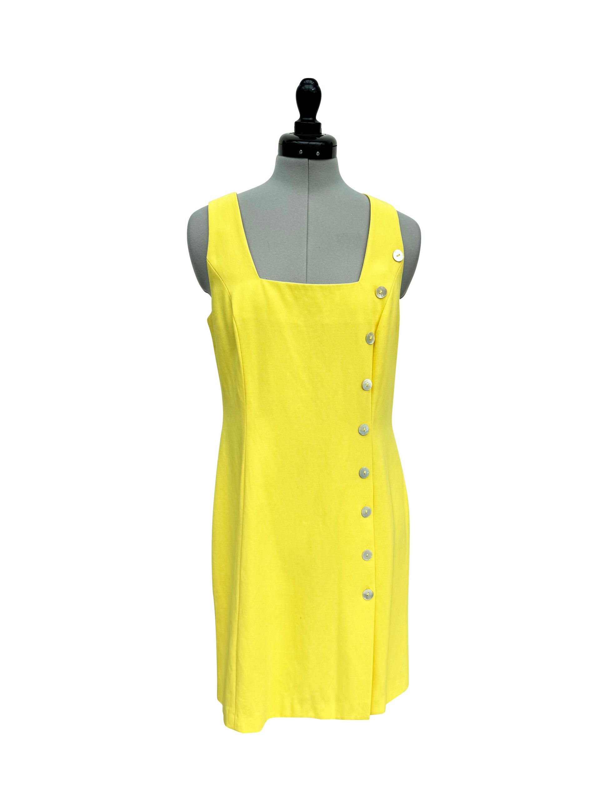 Dieses charmante Trägerkleid in leuchtendem Gelb besticht durch seinen geraden Schnitt im Etui-Stil und ist mit dekorativen Knöpfen auf der rechten Vorderseite versehen, die dem Outfit eine spielerische Note verleihen. Das Kleid präsentiert sich mit einem geraden Ausschnitt und bietet dank der nicht verstellbaren Träger eine nahtlose Silhouette.