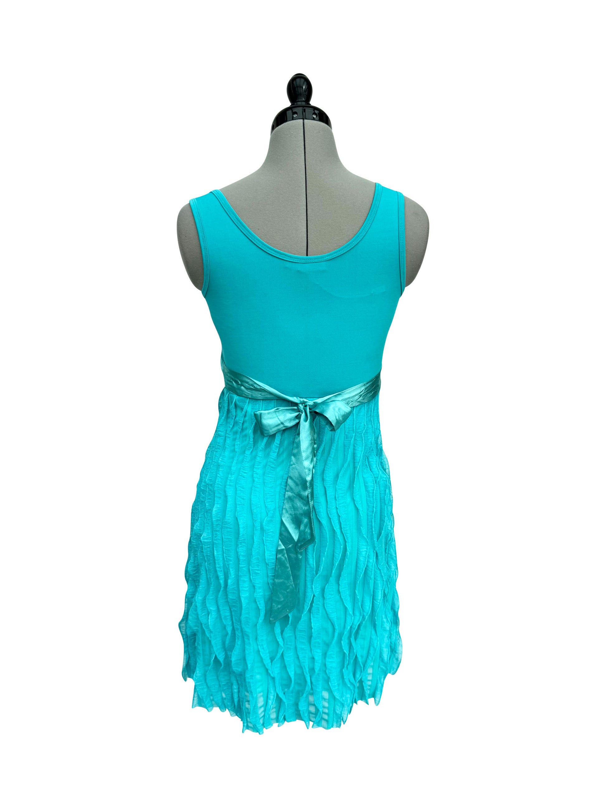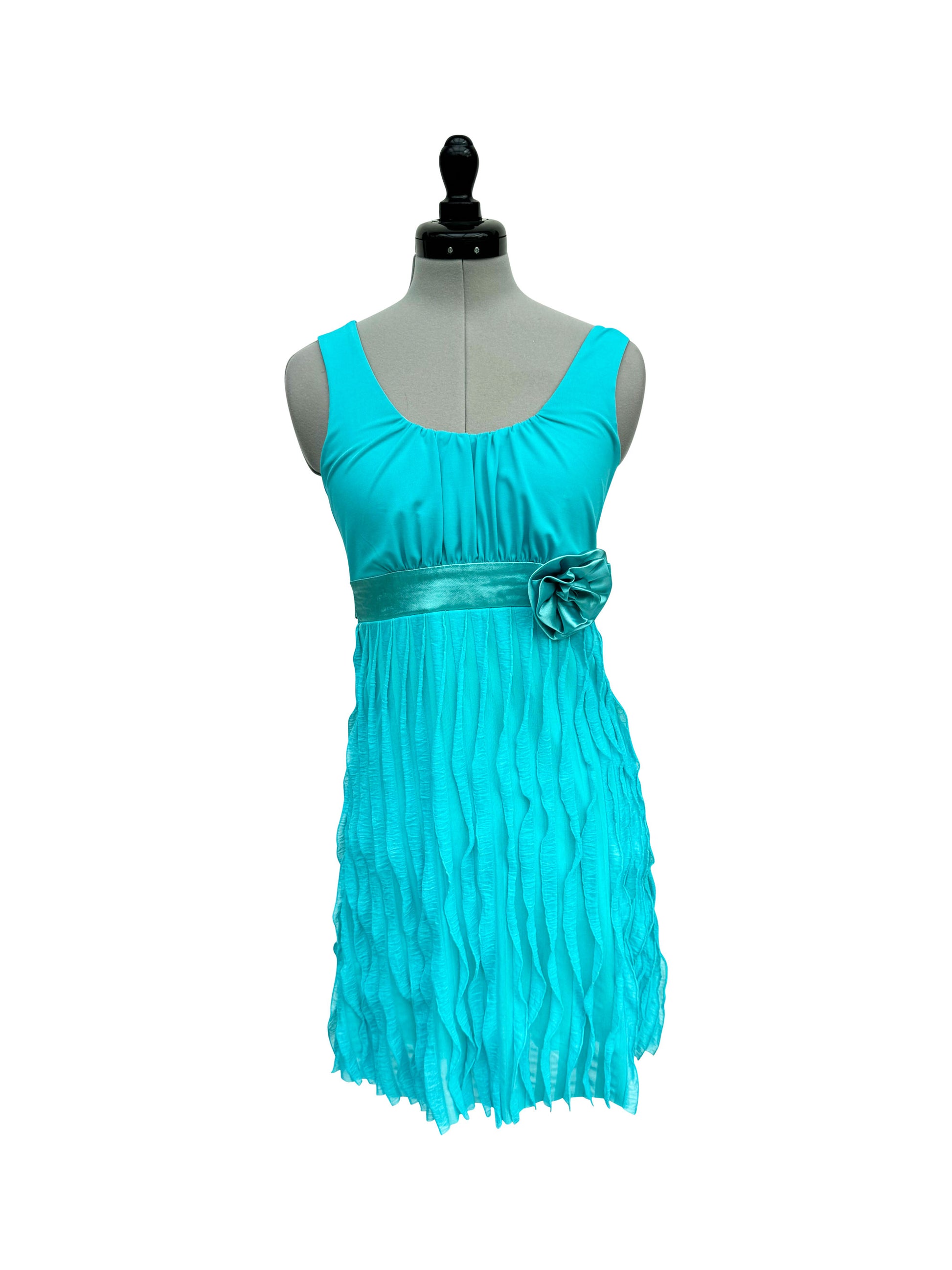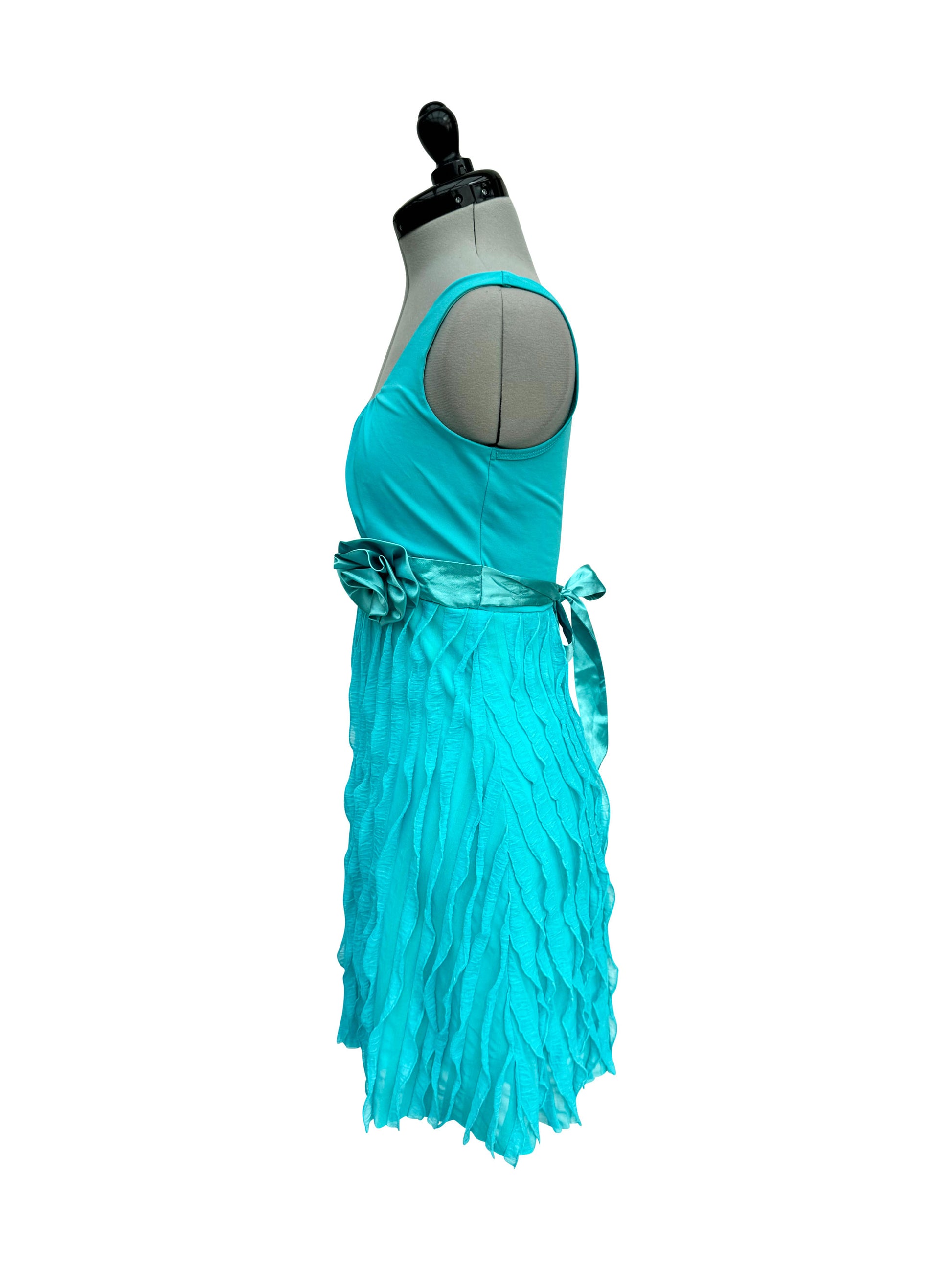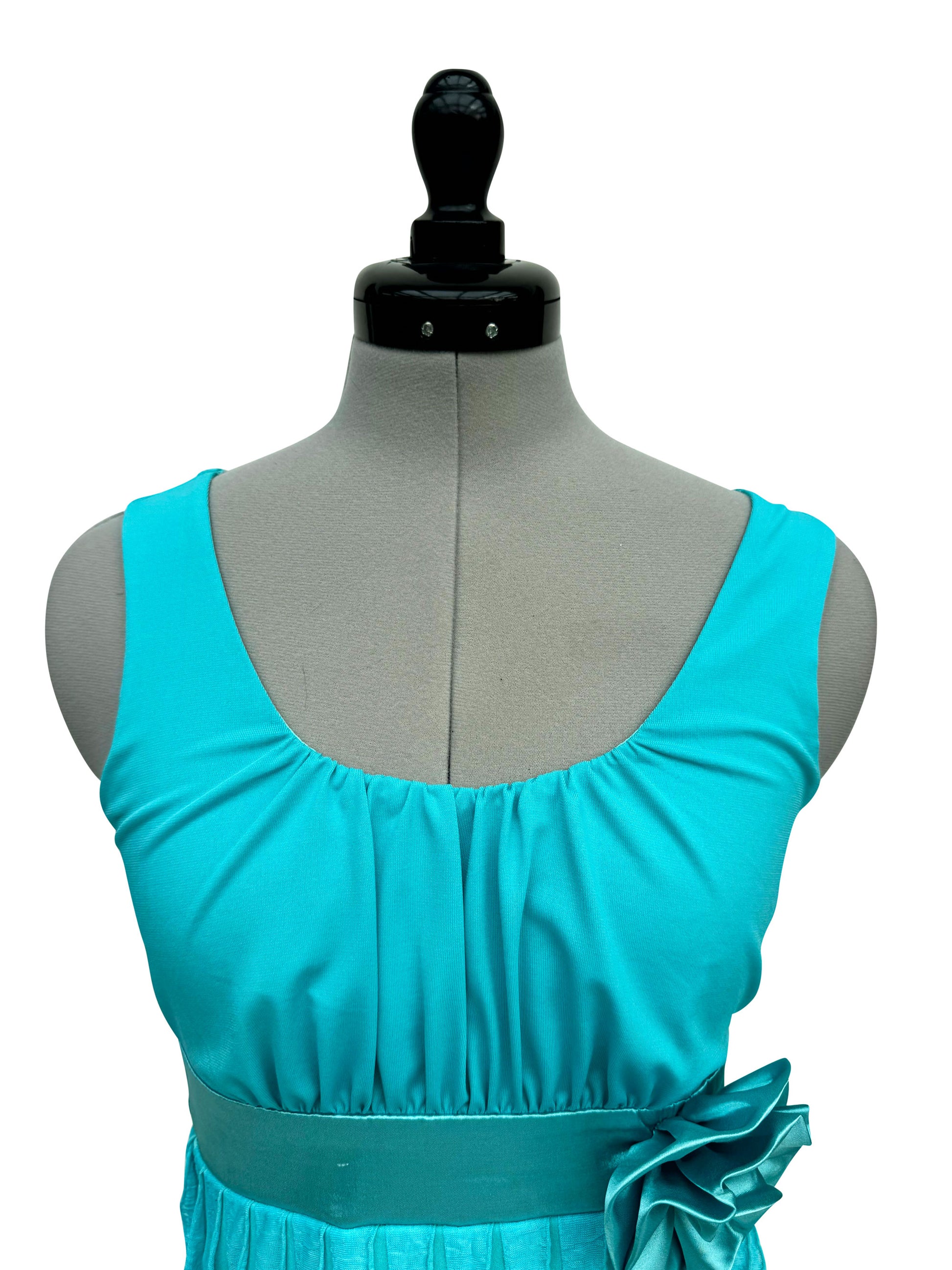 Dieses ärmellose Cocktailkleid in leuchtendem Türkis vereint Eleganz und Komfort. Das leicht drapierte Oberteil wird durch einen schmalen Satingürtel auf Taillenhöhe unterteilt, der eine schöne Silhouette formt. Der Rock fällt sanft in einer A-Linie und ist mit einem Plisseeeffekt versehen, der ihm eine zusätzliche Textur und Bewegung verleiht.