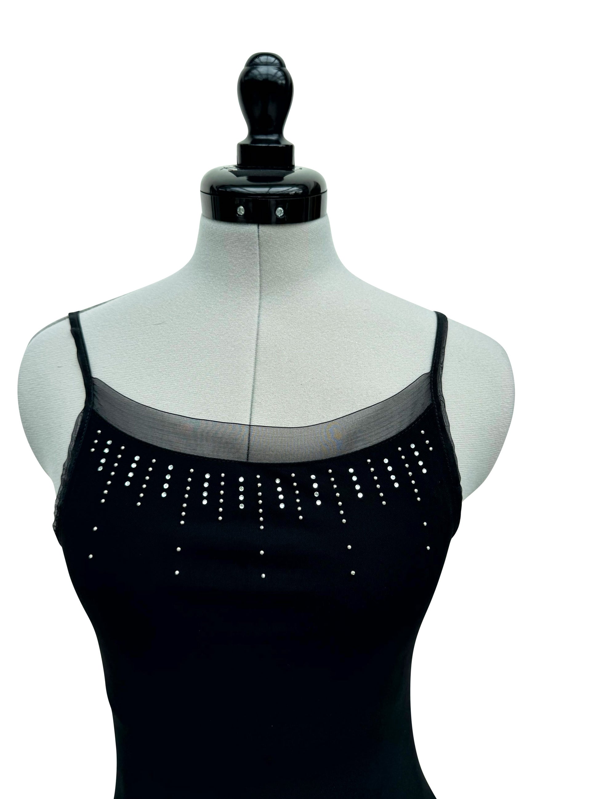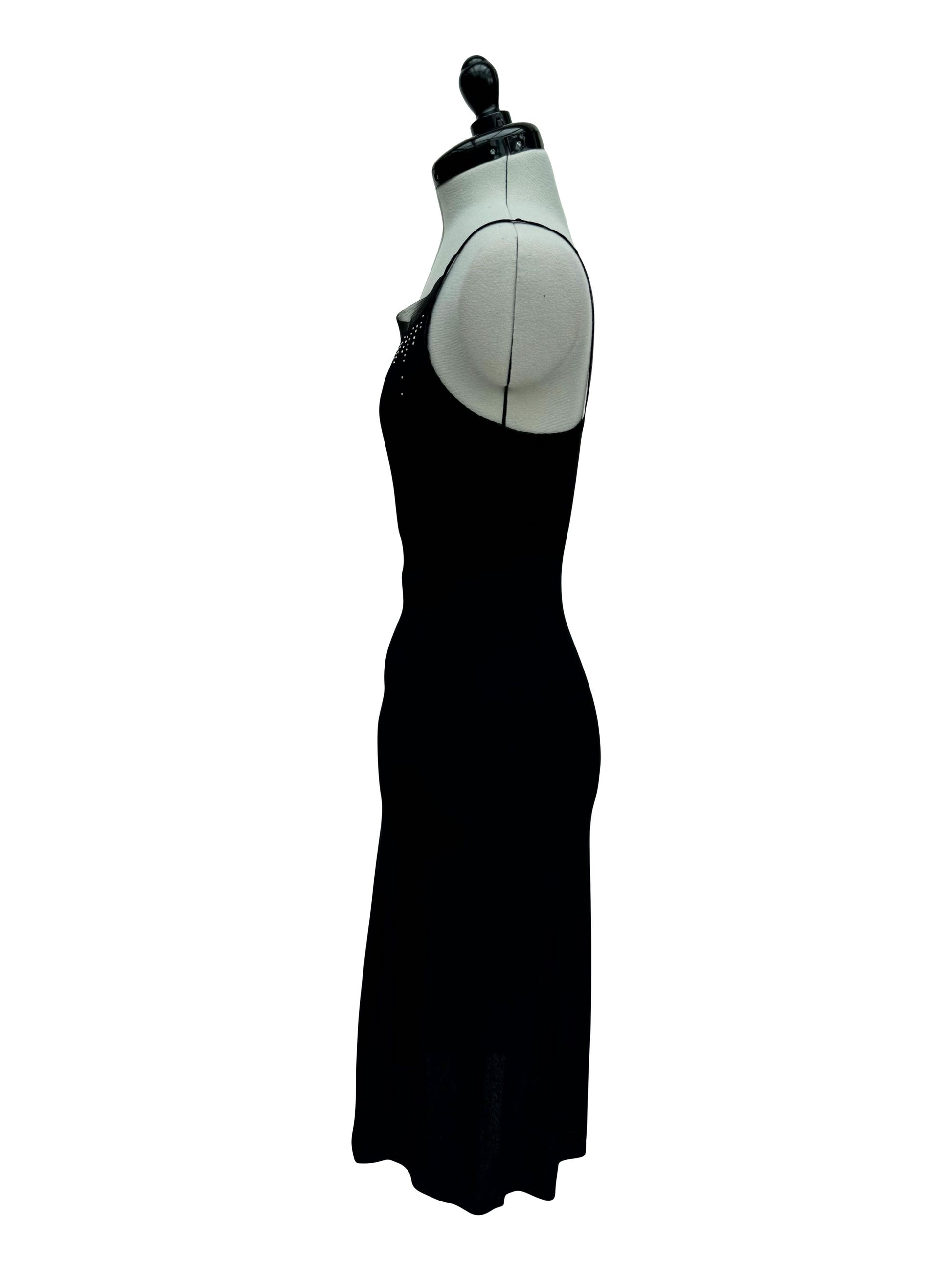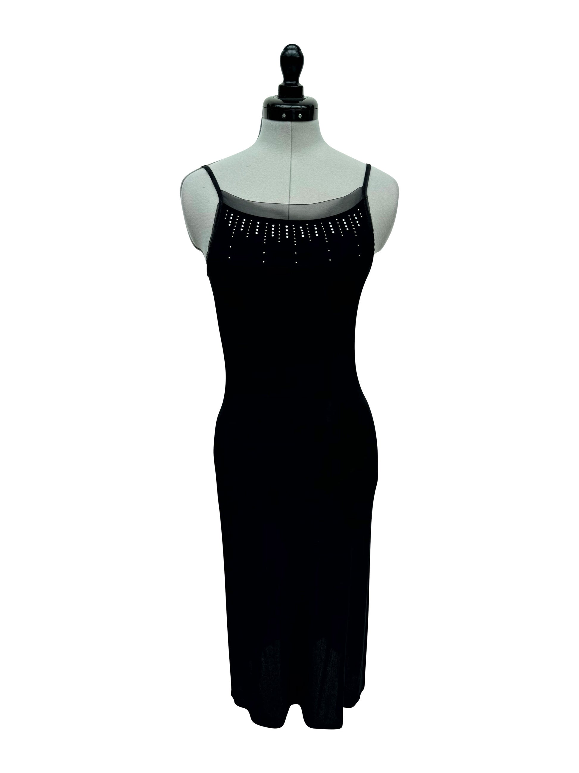 Dieses elegante Spaghettiträgerkleid in klassischem Schwarz besticht durch seine funkelnden Strasssteinchen, die rund um den Ausschnitt angebracht sind und für einen glamourösen Look sorgen. Das Kleid zeichnet sich durch einen geraden Schnitt aus, der figurbetont sitzt und eine schlanke Silhouette schafft.
