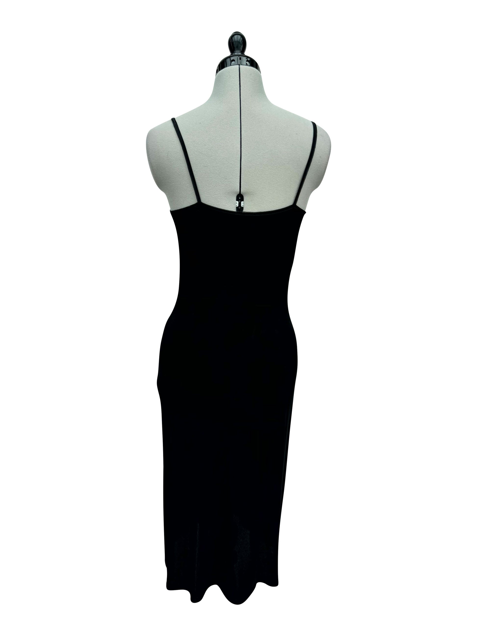 Die Träger des Kleides sind fest eingestellt, um eine durchgehende, nahtlose Passform zu gewährleisten. Der runde Ausschnitt ergänzt das schlichte, doch schicke Design. Da das Kleid einlagig ist, bleibt es leicht und angenehm zu tragen, ohne auf Stil zu verzichten.