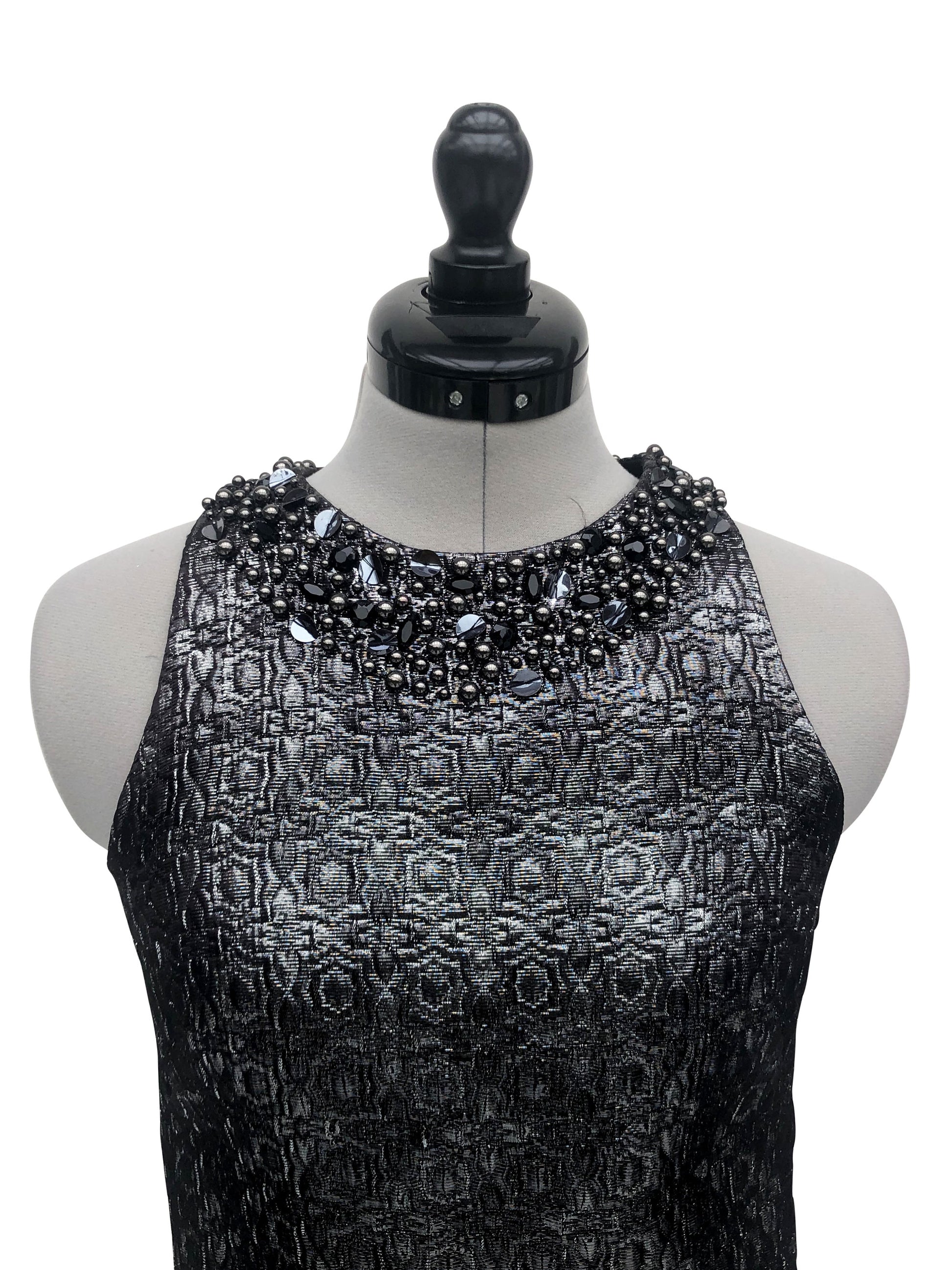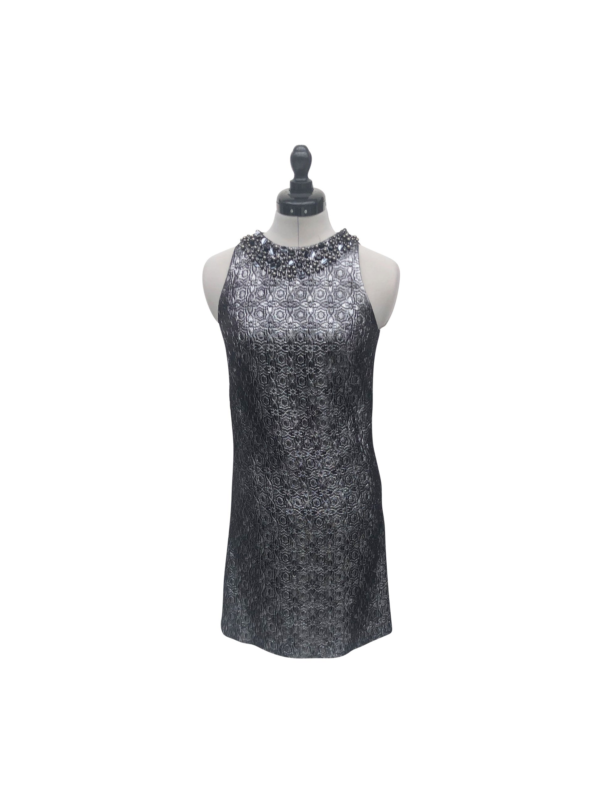 Dieses ärmellose, eng anliegende Cocktailkleid in Silbergrau strahlt Eleganz und Raffinesse aus. Besonderer Blickfang sind die sorgfältig angebrachten silbernen Perlen und Pailletten, die den runden Halsausschnitt umrahmen und dem Kleid einen funkelnden Akzent verleihen.