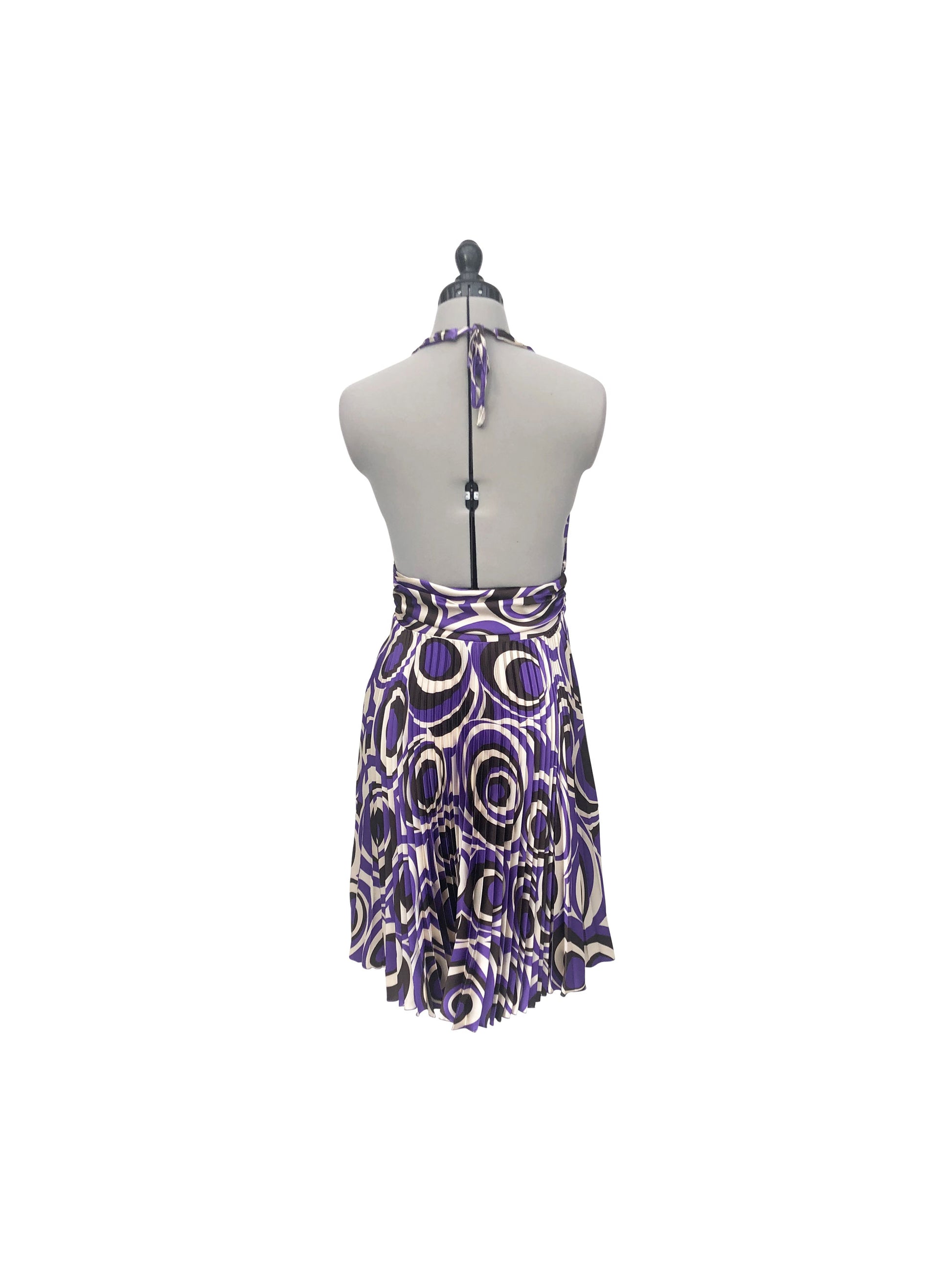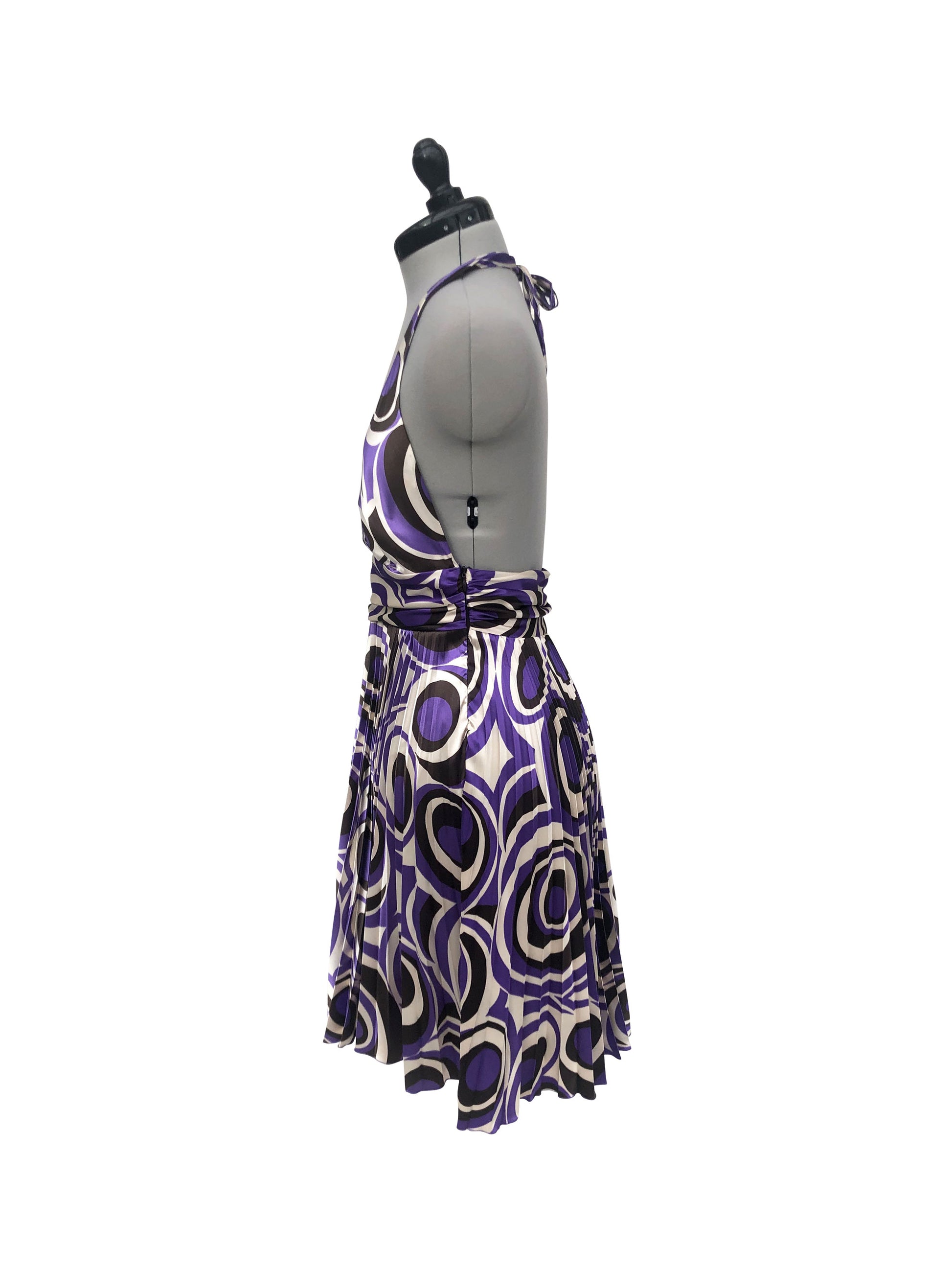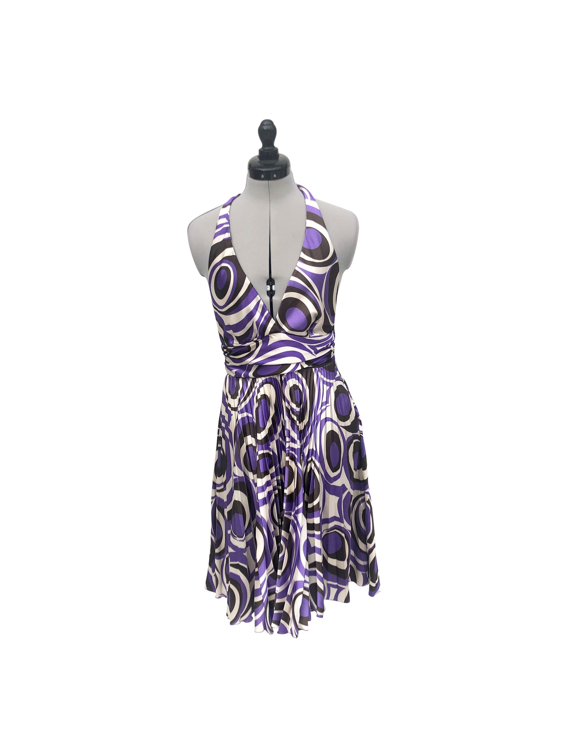 Dieses elegante Neckholderkleid verzaubert mit einem rückenfreien Design und einem fliessend fallenden Plisseejupe, der seine Trägerin bei jedem Schritt sanft umspielt. Gefertigt aus hochwertigem Satin in einem tiefen Violett, bietet das Kleid einen angenehmen Tragekomfort.