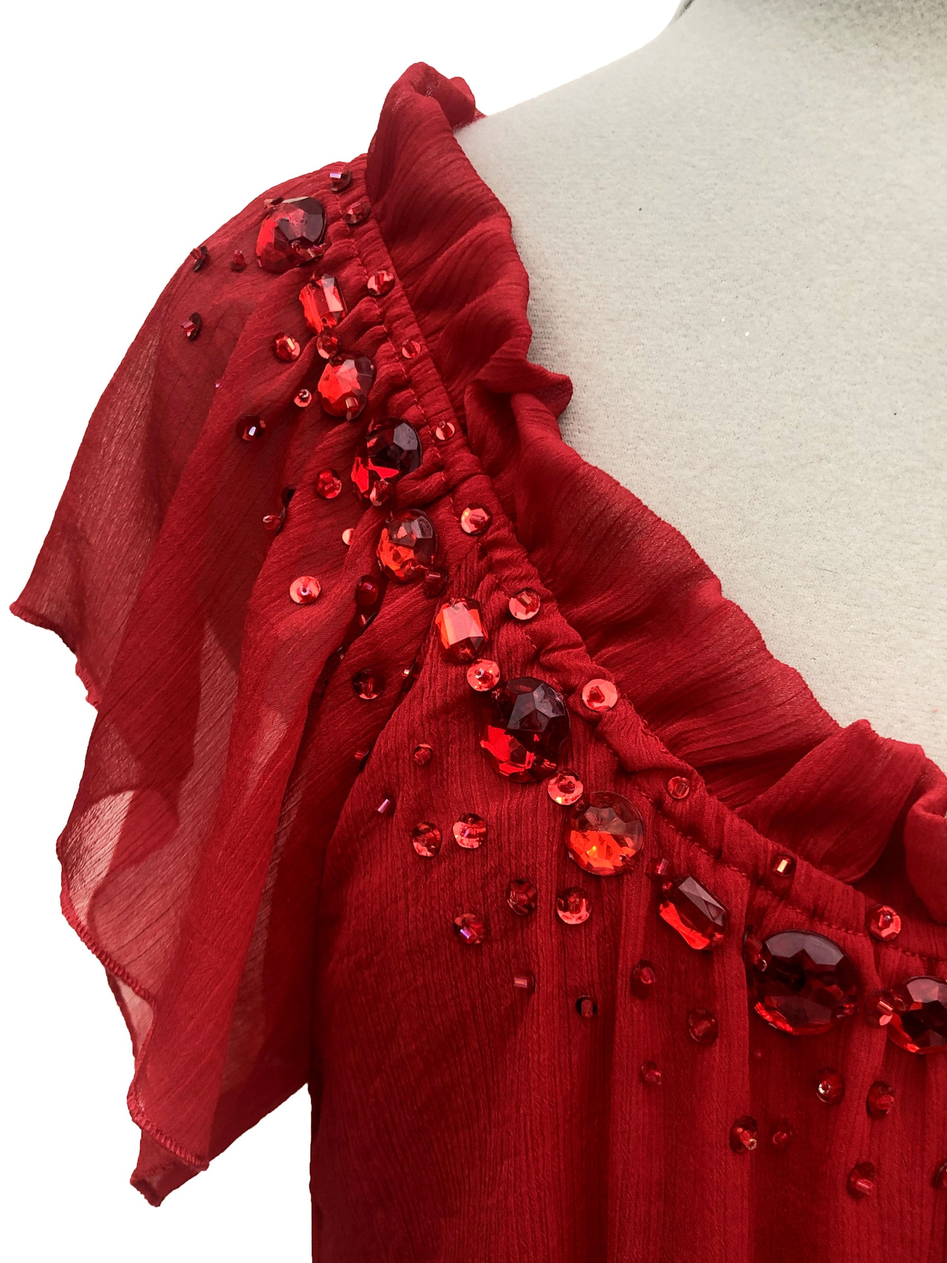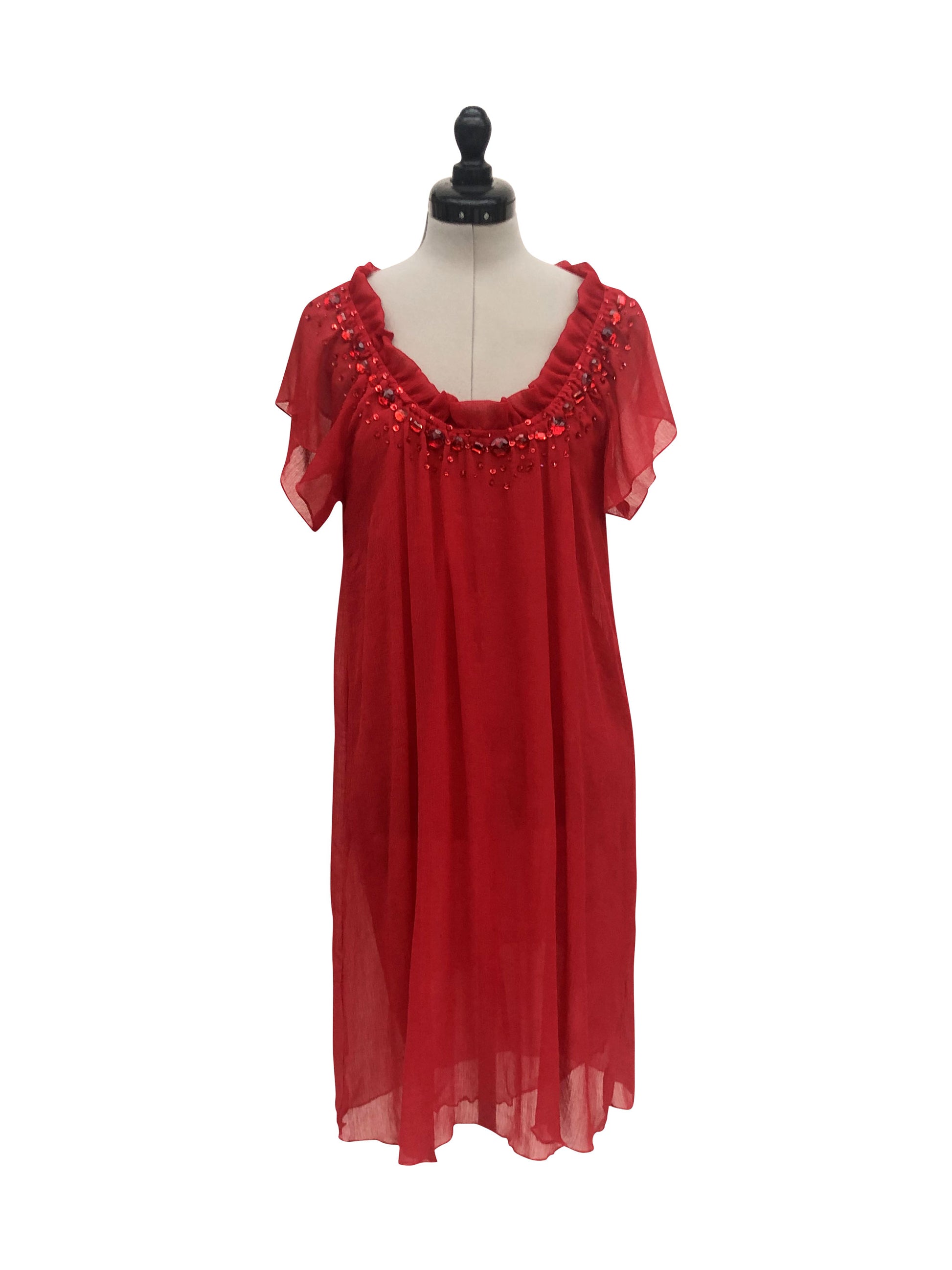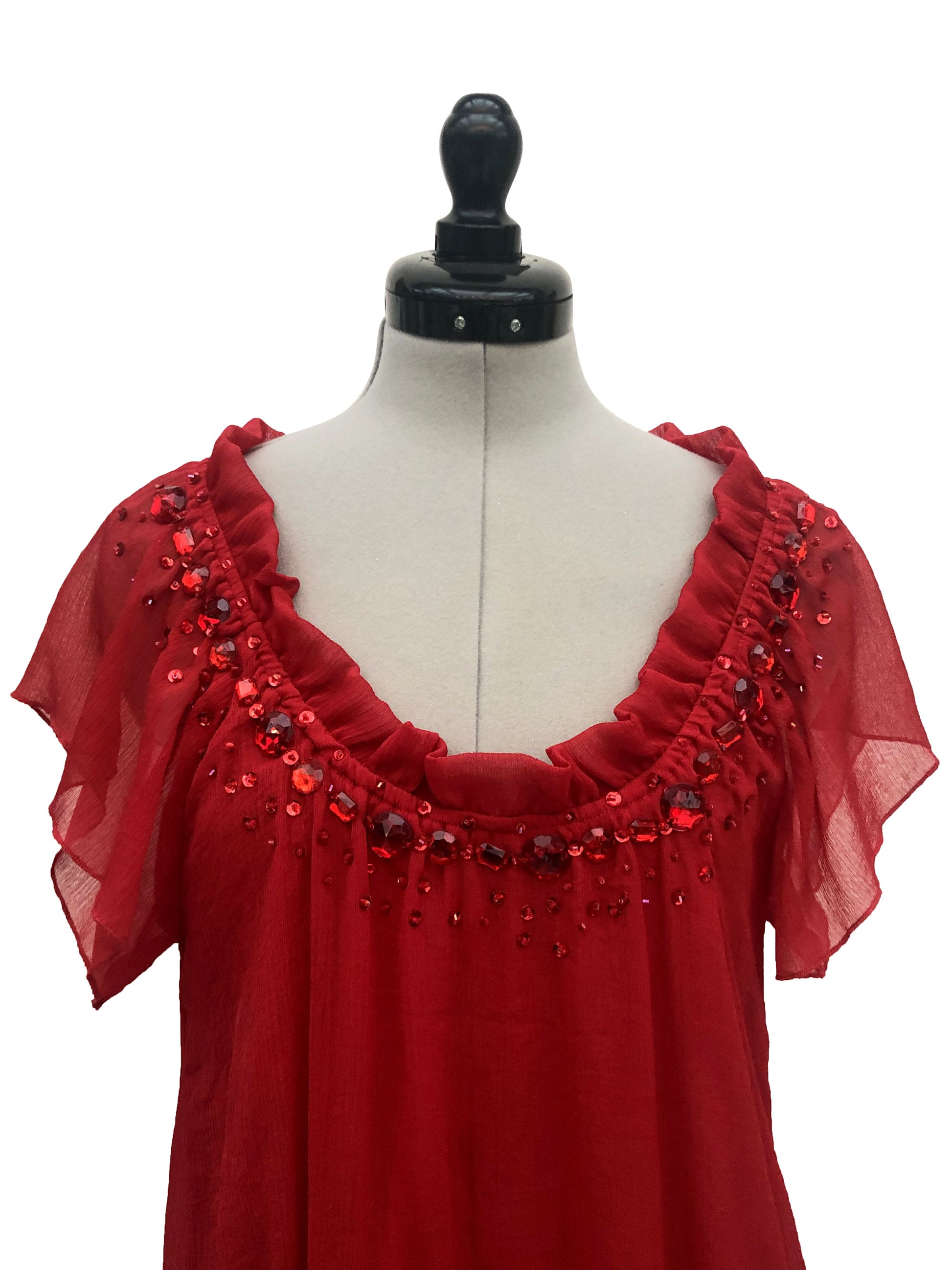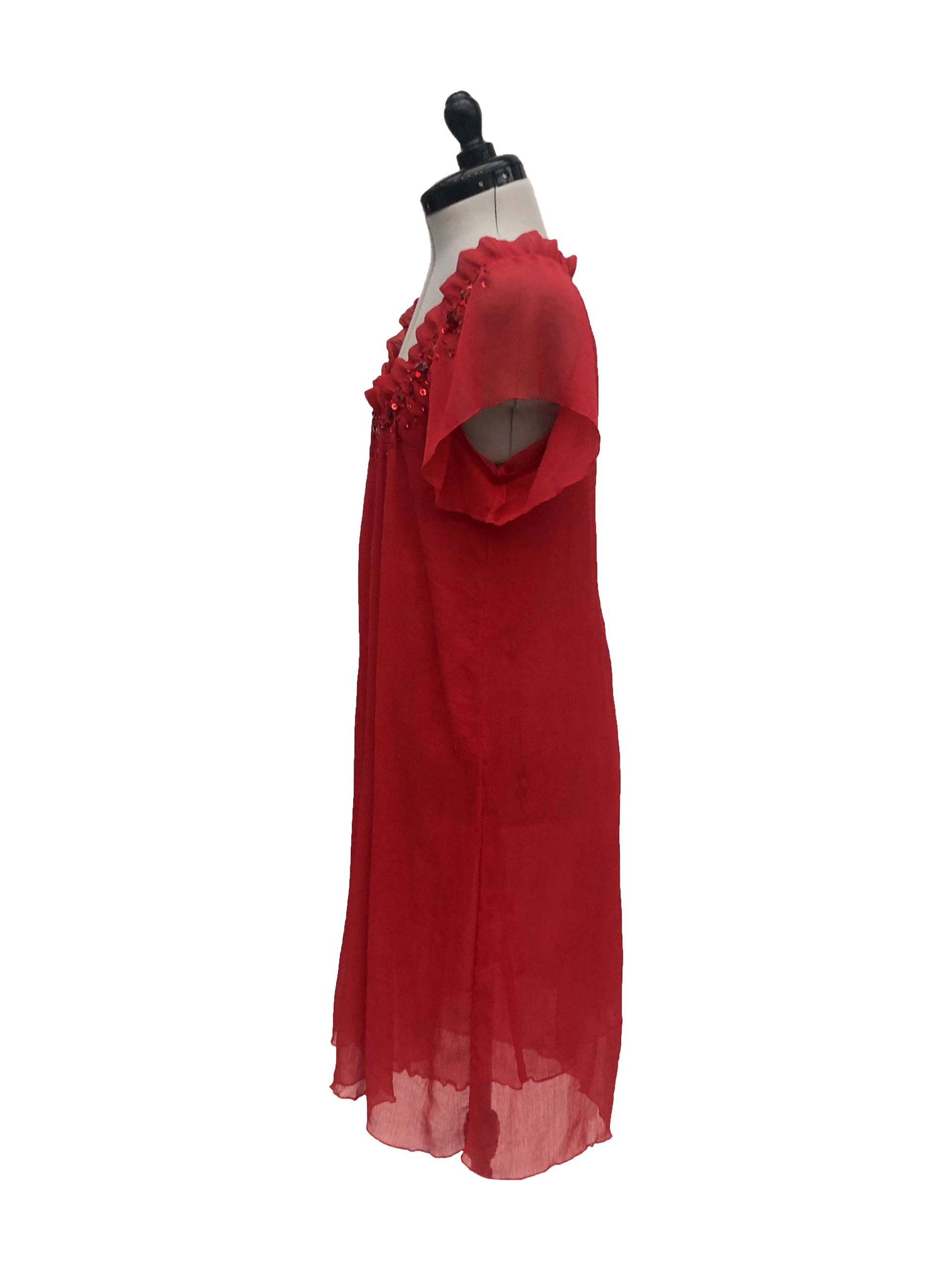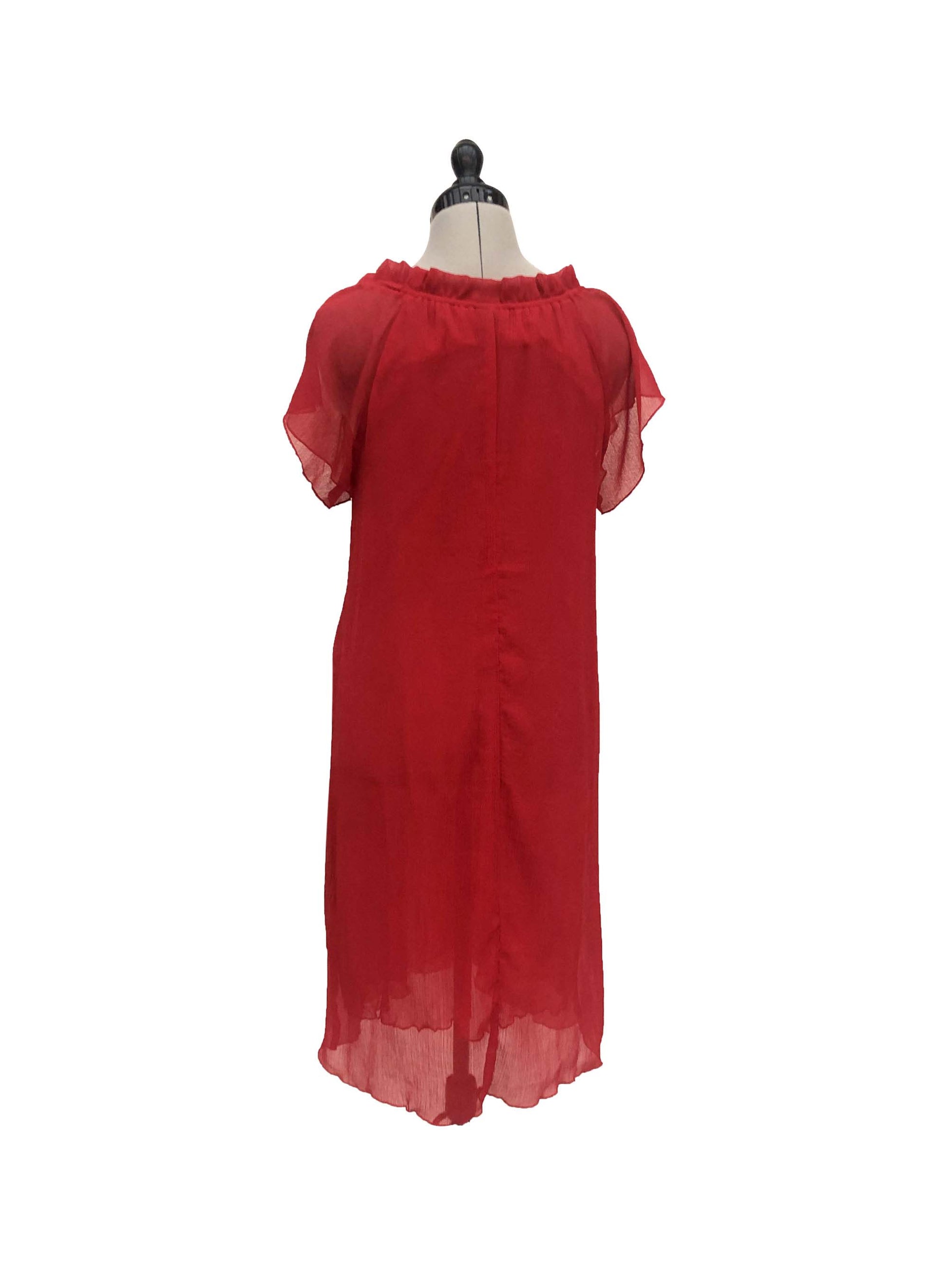 Dieses charmante A-Linien-Kleid in leuchtendem Rot fällt durch seinen femininen Schnitt und die sorgfältige Verarbeitung auf. Die Kombination aus zweilagigem Voile-Stoff und dezenter Verzierung mit Swarovski-Steinen am runden Ausschnitt verleiht dem Kleid einen Hauch von Eleganz und Glamour.