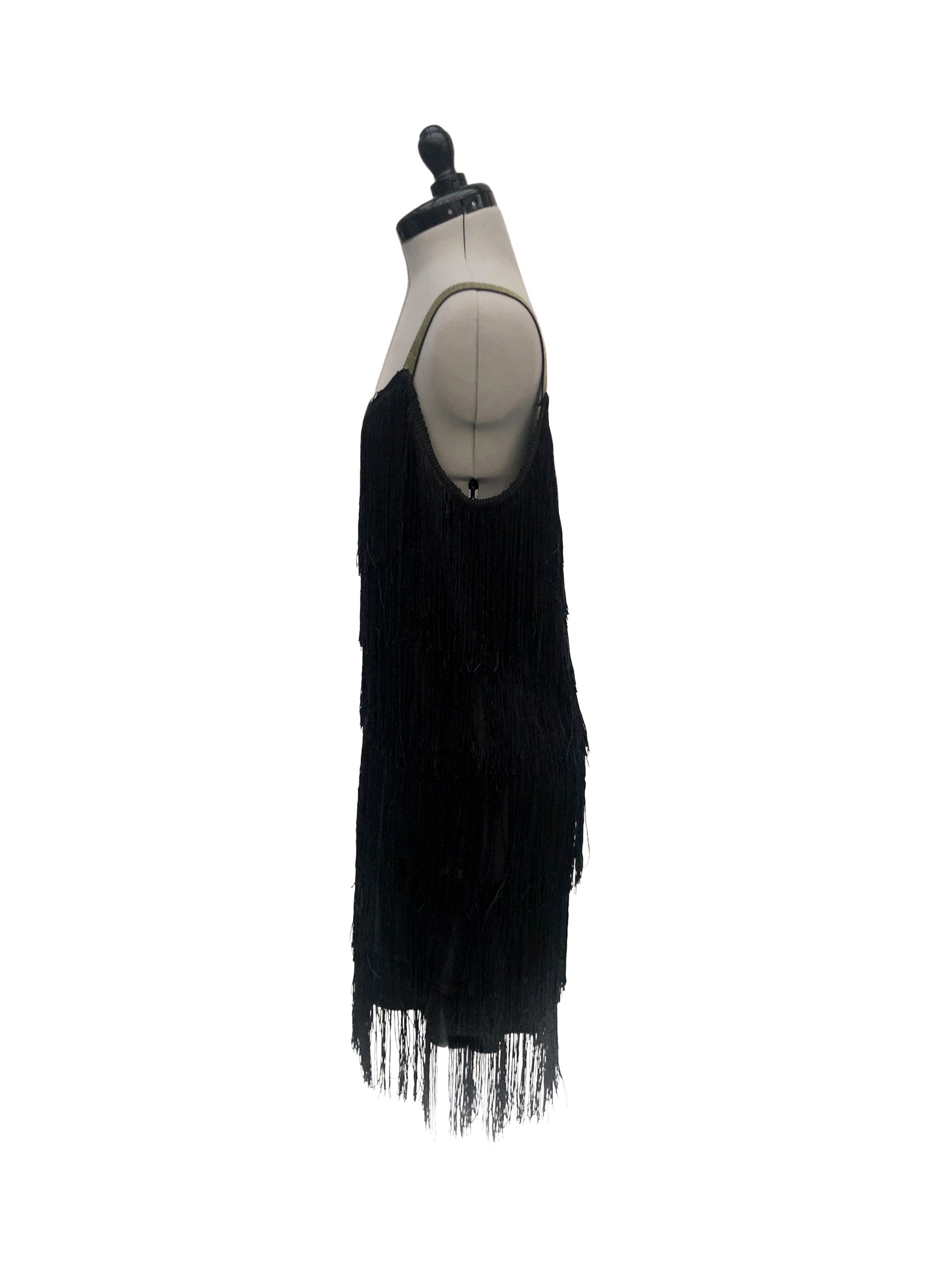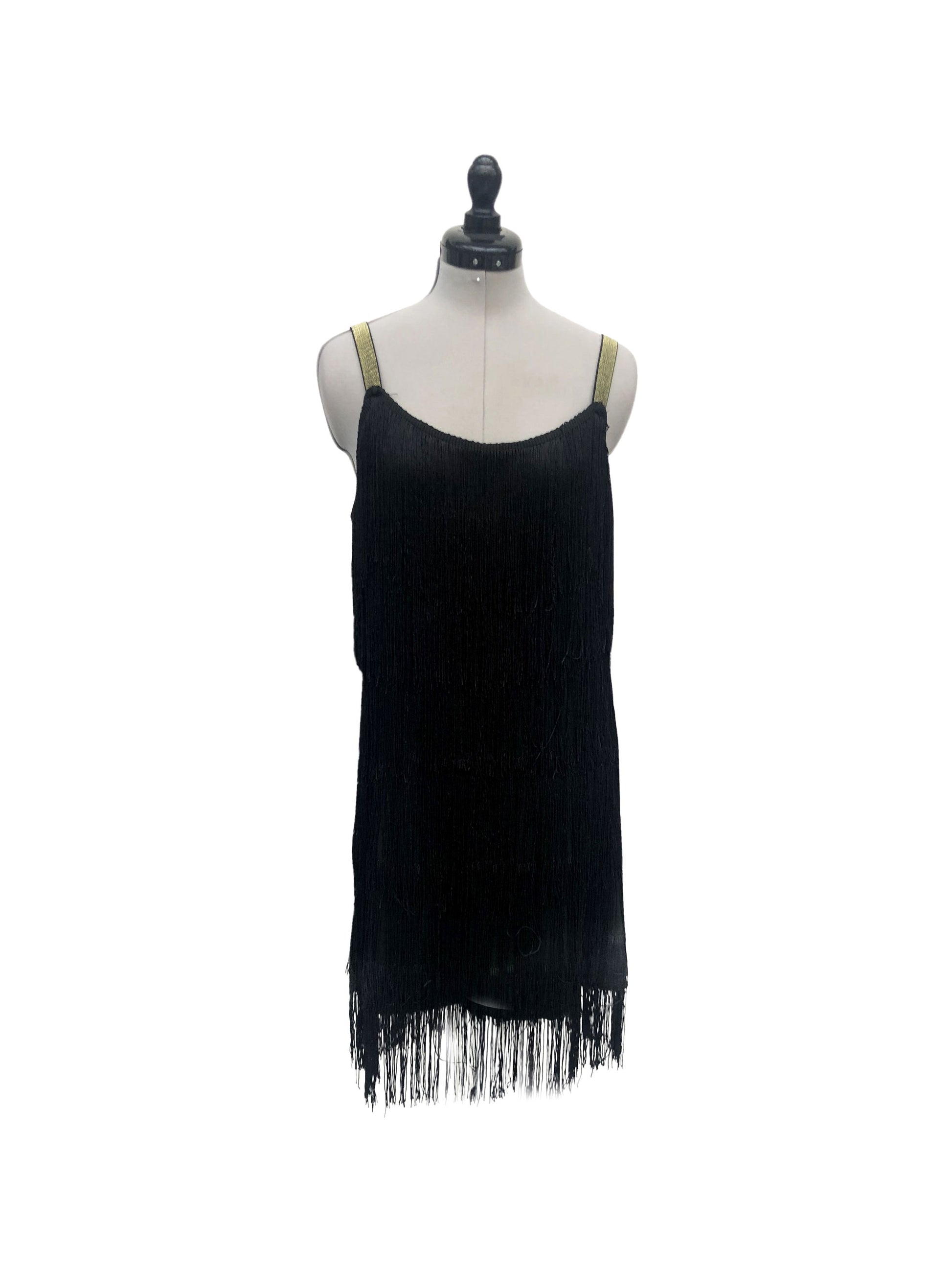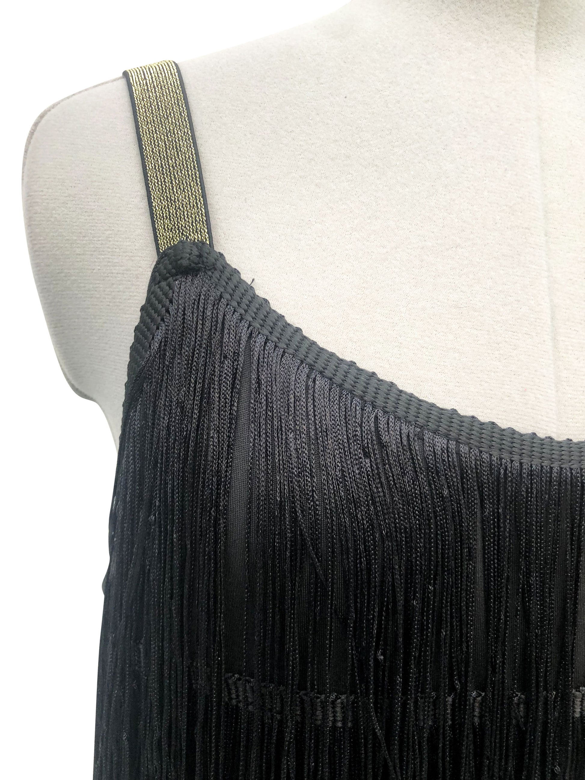 Entdecke unser charismatisches Charleston-Trägerkleid, das Retro-Charme mit modernem Flair vereint. Dieses Kleid in klassischem Schwarz ist mit auffälligen goldfarbenen, elastischen Trägern ausgestattet, die einen stilvollen Akzent setzen und gleichzeitig Flexibilität bieten. Besonders auffällig sind die charakteristischen Fransen, die bei jeder Bewegung mitschwingen und so das lebhafte Flair der 1920er Jahre einfangen.