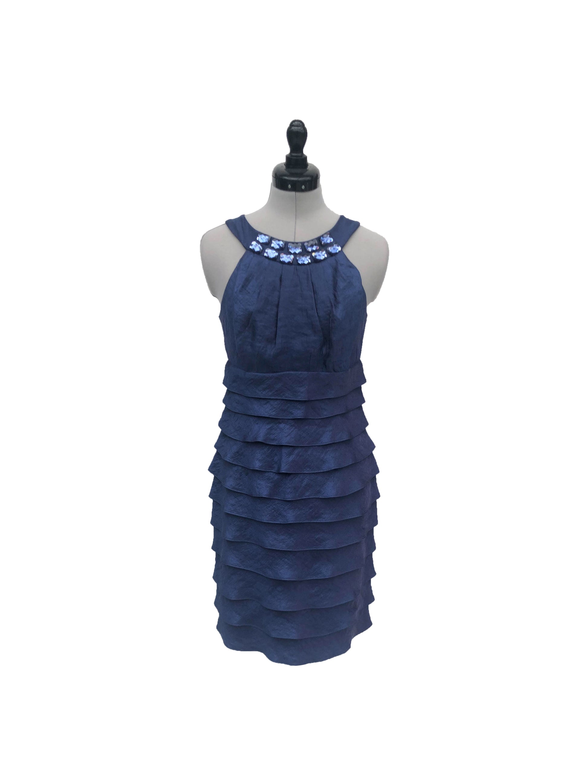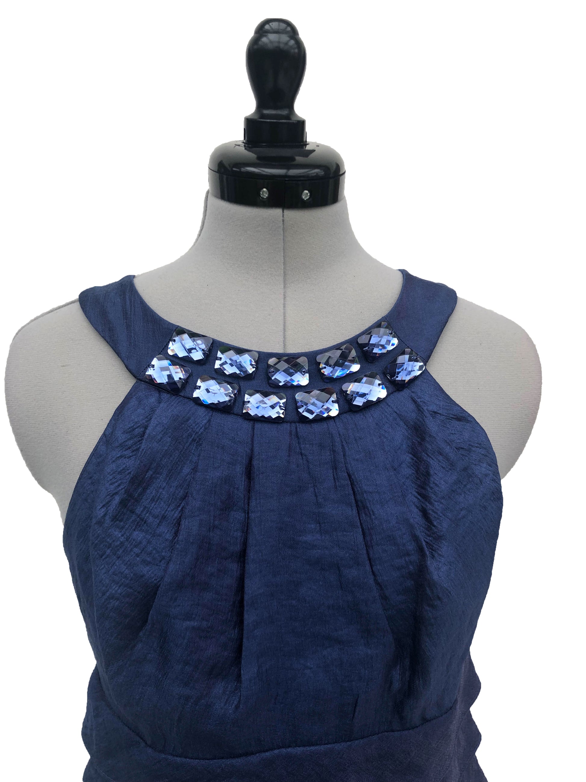 Dieses ärmellose Kleid in strahlendem Blau ist der perfekte Begleiter für festliche Anlässe. Der elegante Kragen, besetzt mit funkelnden blauen Steinen, setzt ein glamouröses Highlight und verleiht dem Kleid eine besondere Note. Der Rock aus Lamellenstoff fällt wunderschön in einer A-Linie und sorgt für eine anmutige Bewegung. ✨