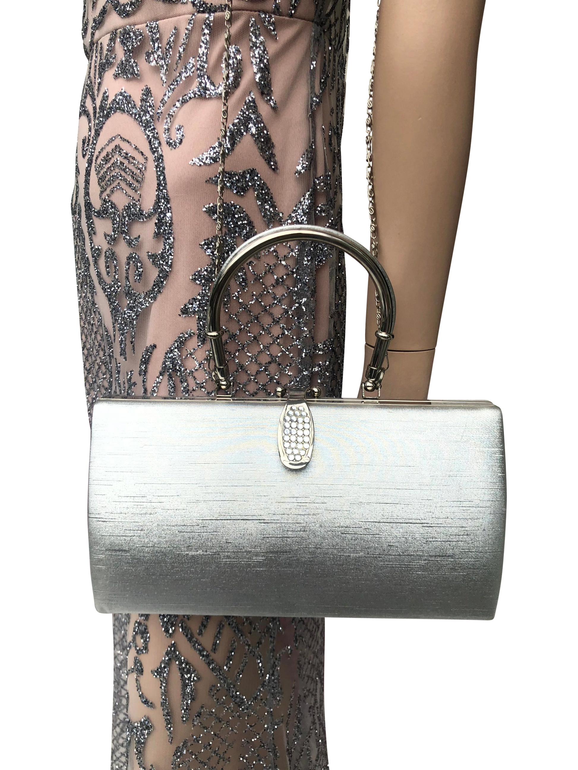Kompakt und elegant ✨ – diese silberne Bügeltasche aus Kunststoff ist ein stilvolles Accessoire für festliche Anlässe. Mit ihrem kurzen Bügel und dem langen Metallkettchen kannst du sie vielseitig tragen – ob in der Hand oder über der Schulter. 💫