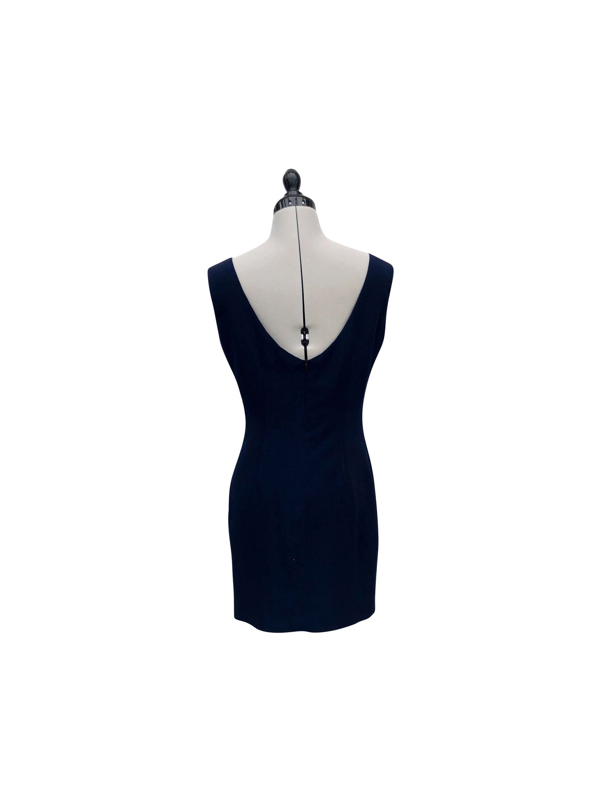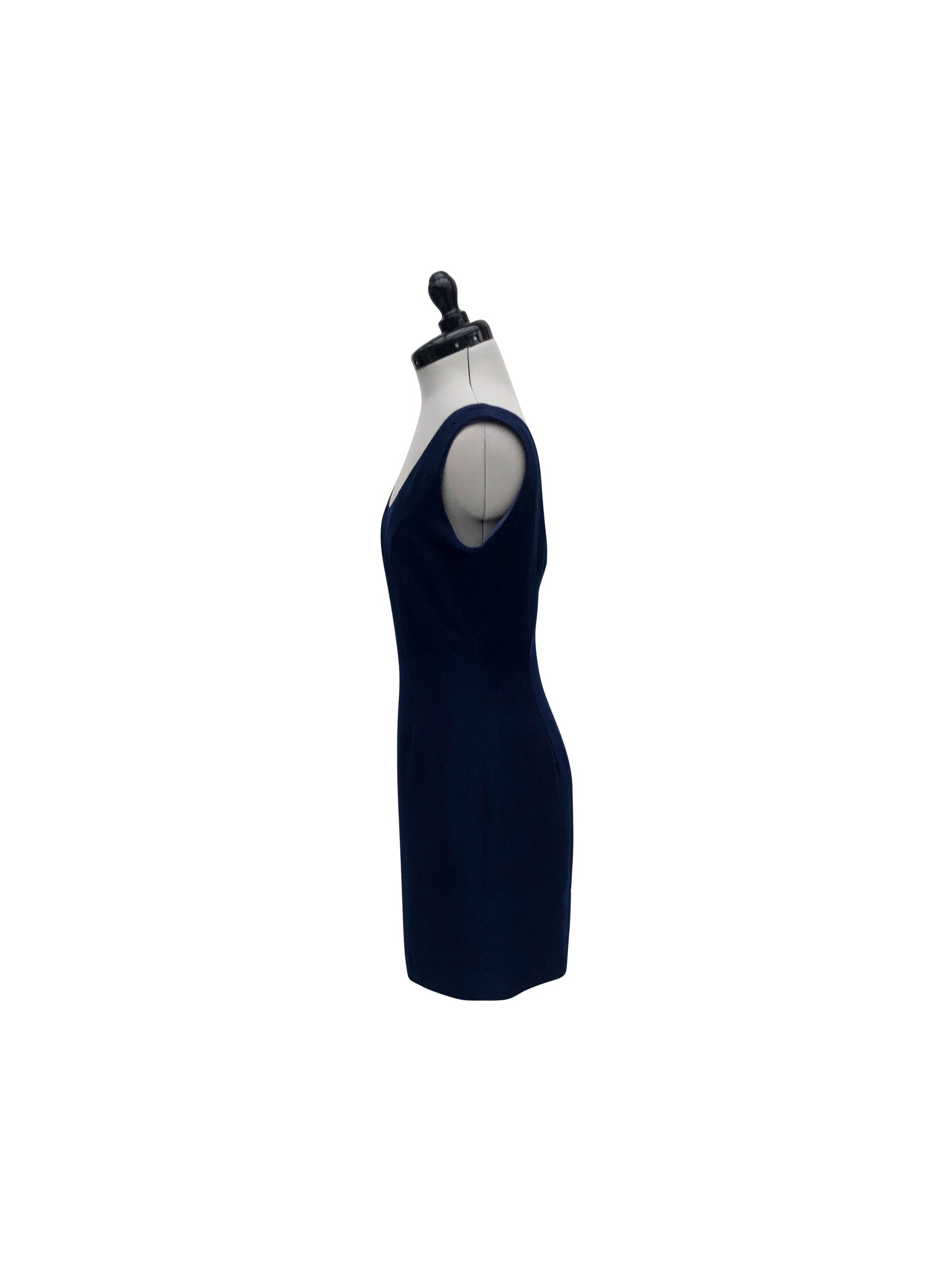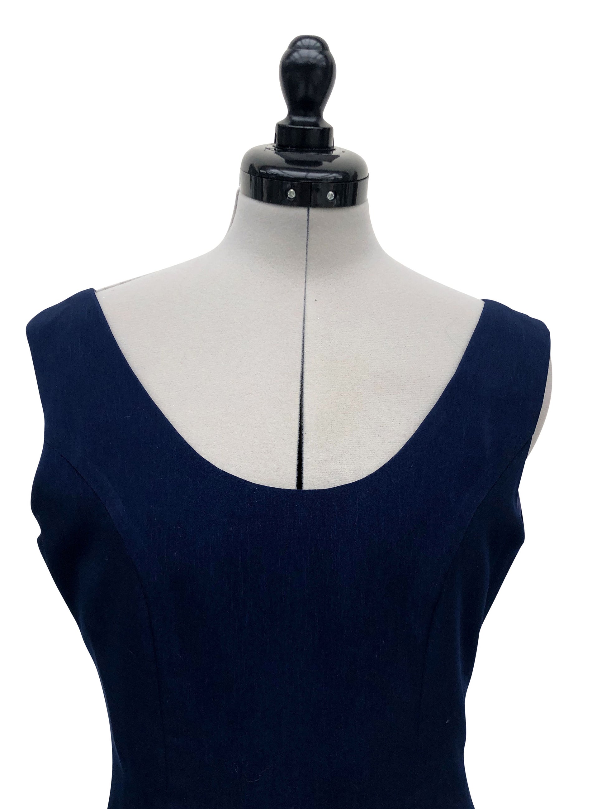 Entdecke unser schickes ärmelloses Etuikleid in einem schönen dunklen Blauton. Es überzeugt mit einem klassischen runden Ausschnitt und einer schlichten, aber wirkungsvollen Silhouette. Dank seiner zweilagigen Konstruktion bietet das Kleid sowohl Stil als auch Komfort. Der feste Stoff im Etui-Schnitt formt und stützt.
