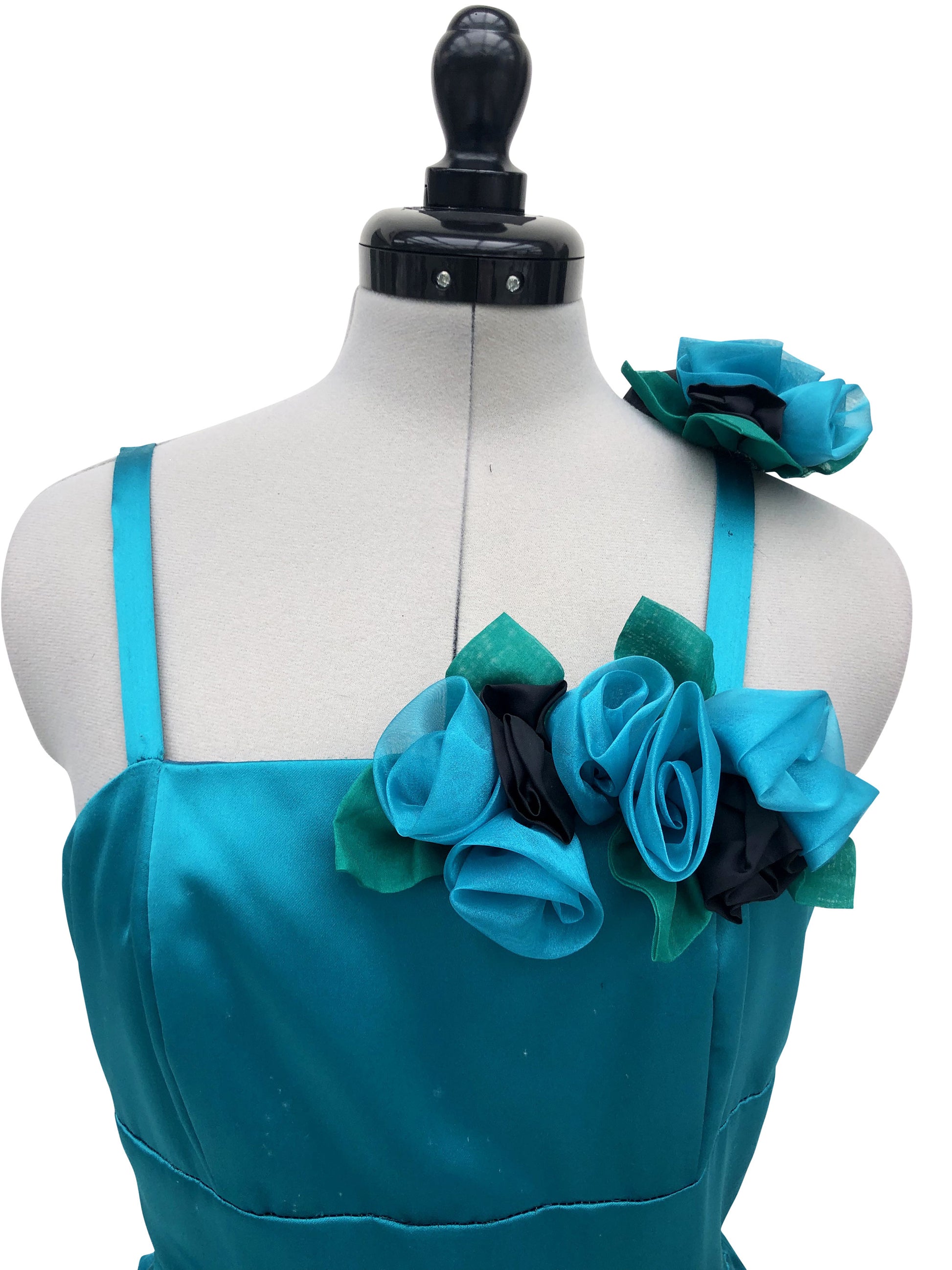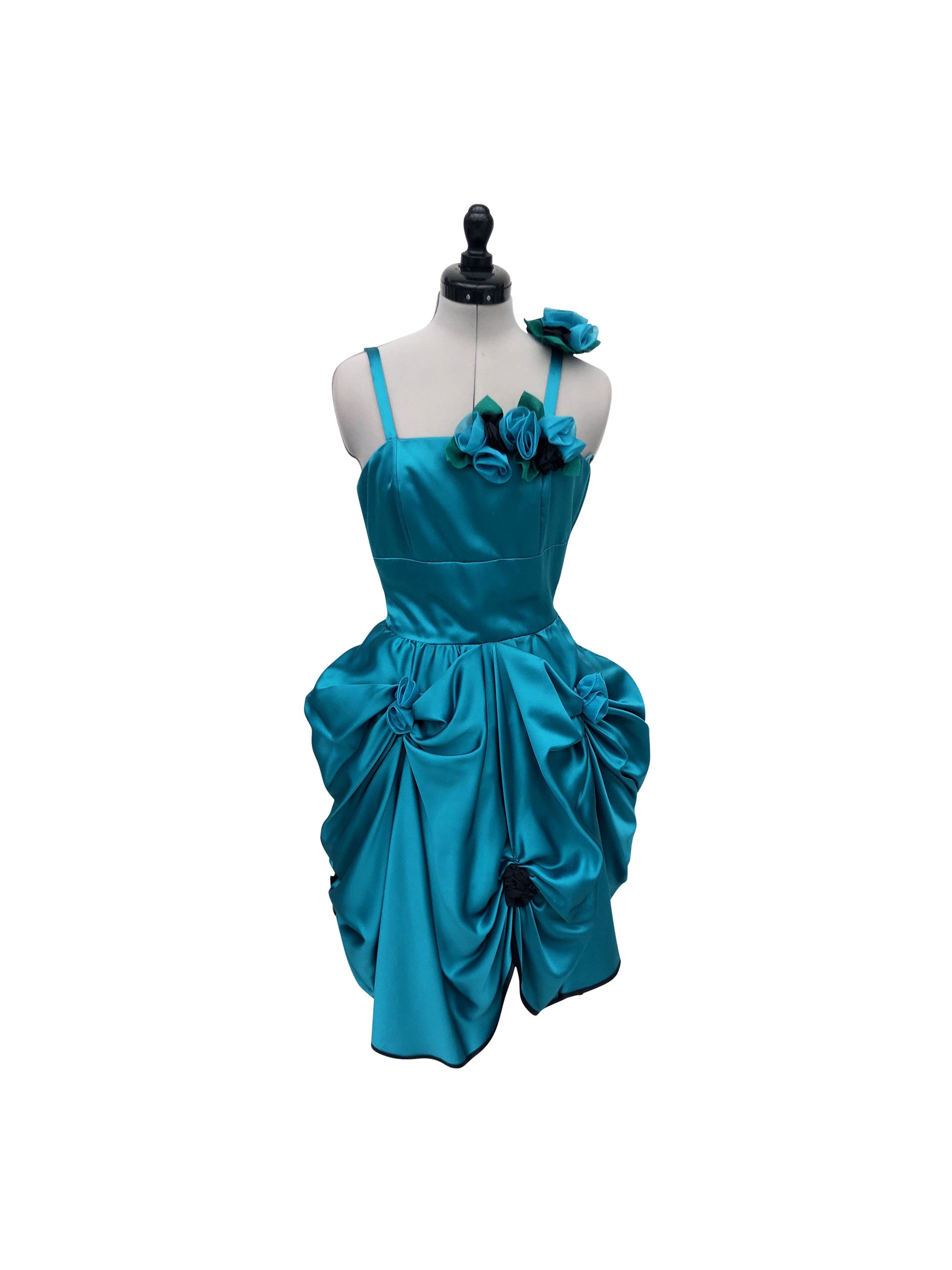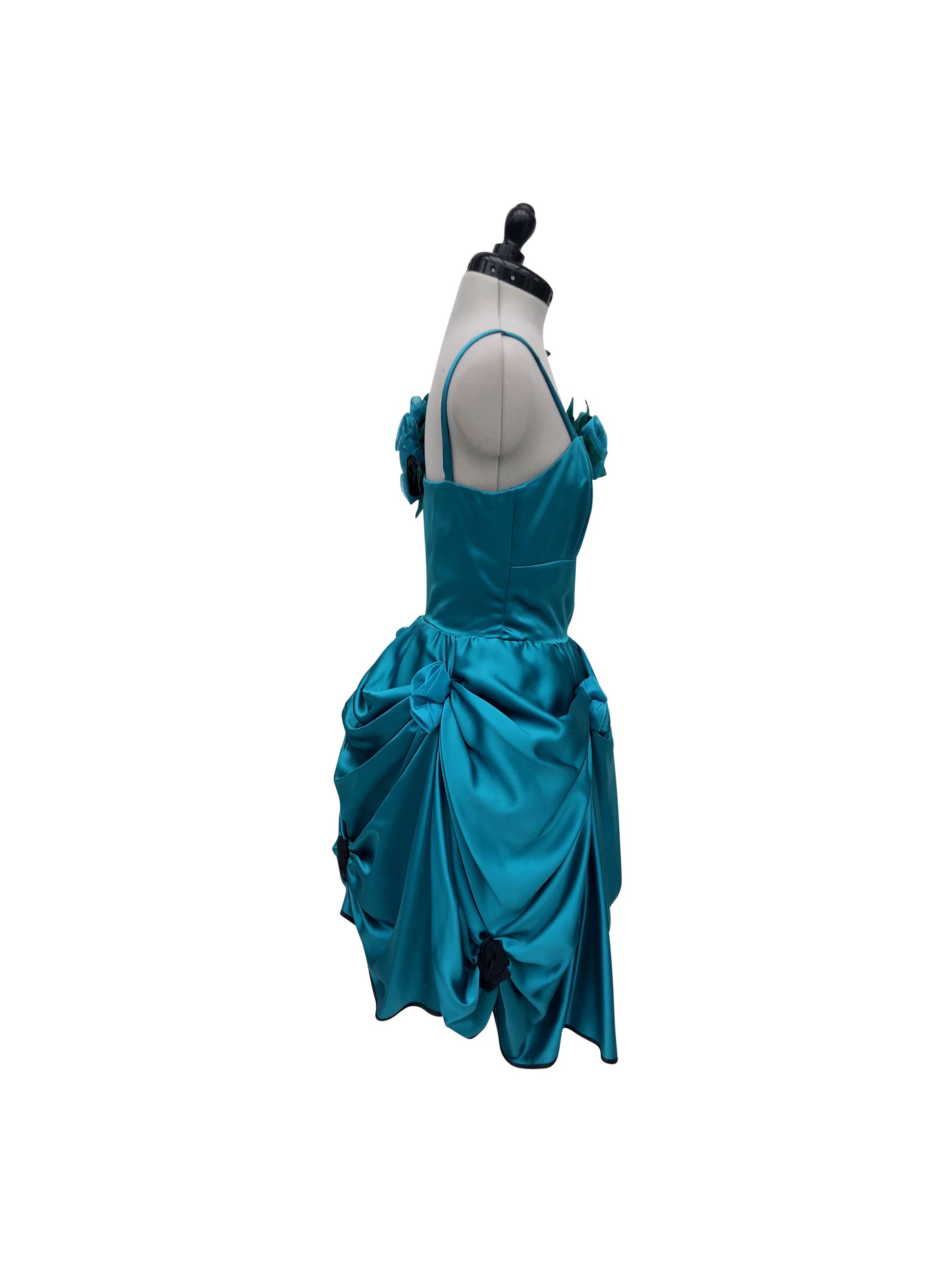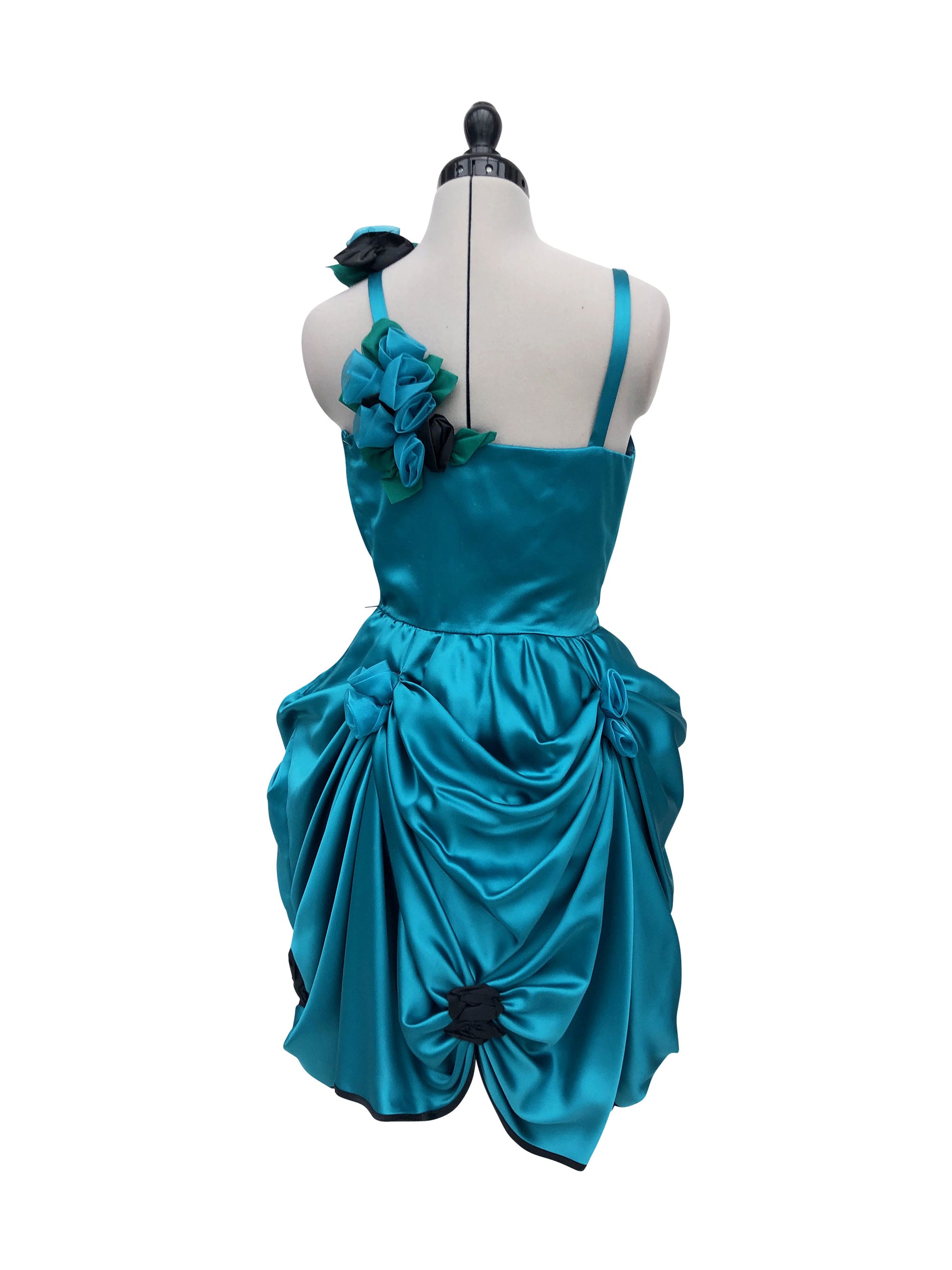 Dieses Cocktailkleid ist einfach ein Traum. Das eng anliegende Oberteil ist mit zarten Tüllblumen geschmückt, die einen Hauch von Romantik verleihen. Der drapierte Rock fällt balonartig und wird durch einen steifen Unterrock in den Hüften perfekt in Szene gesetzt.
