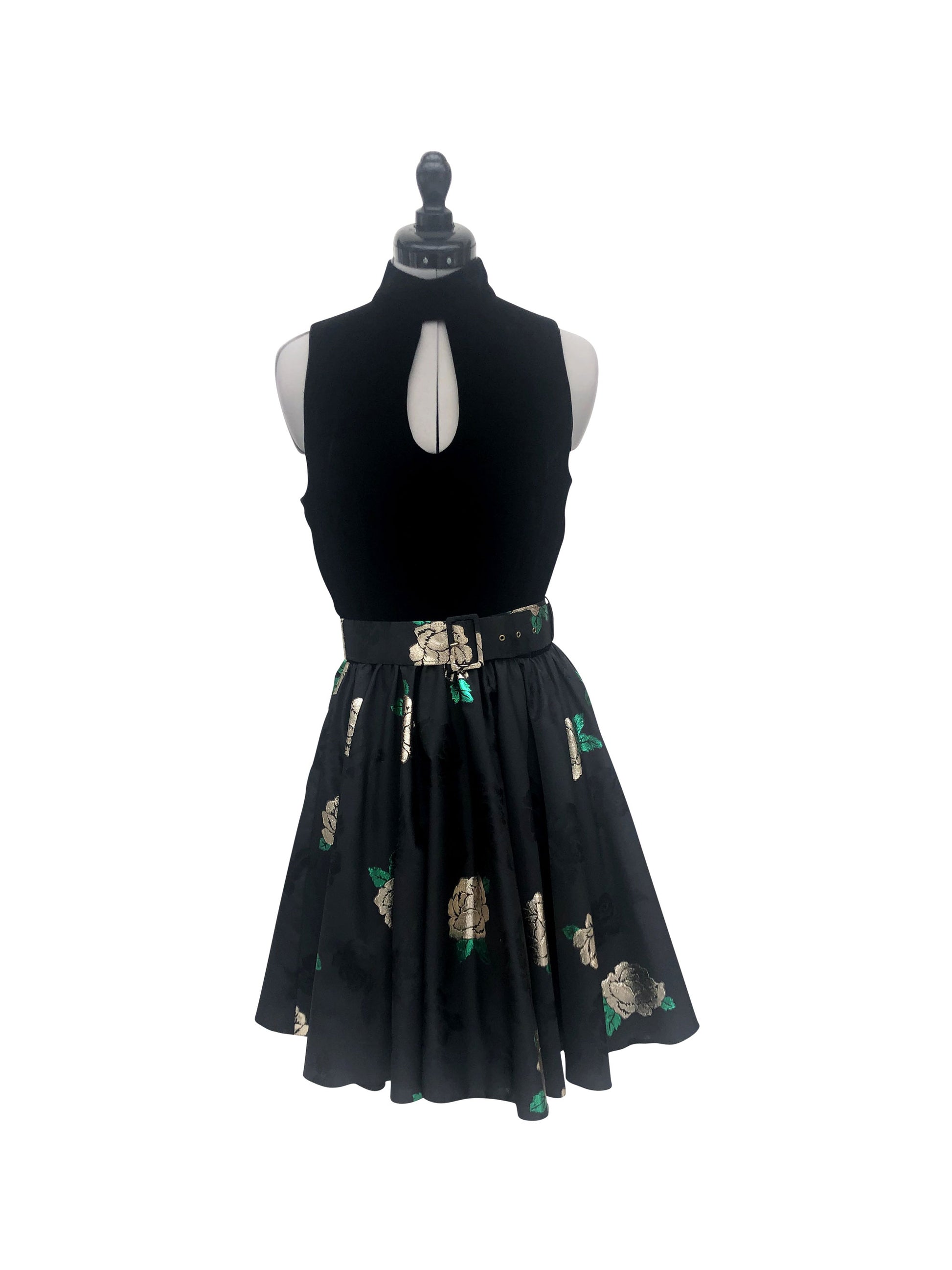 Das Oberteil dieses Neckholder-Cocktailkleider ist aus edlem Samt gefertigt, was ihm eine herrlich weiche Textur verleiht. Der weite, gebauschte Rock aus Satin ist mit einem goldenen Blumenmuster verziert und gibt dem Kleid das gewisse Etwas. Das Kleid ist zweilagig und bietet dank der Kombination aus Samt und Satin einen sehr angenehmen Tragekomfort.