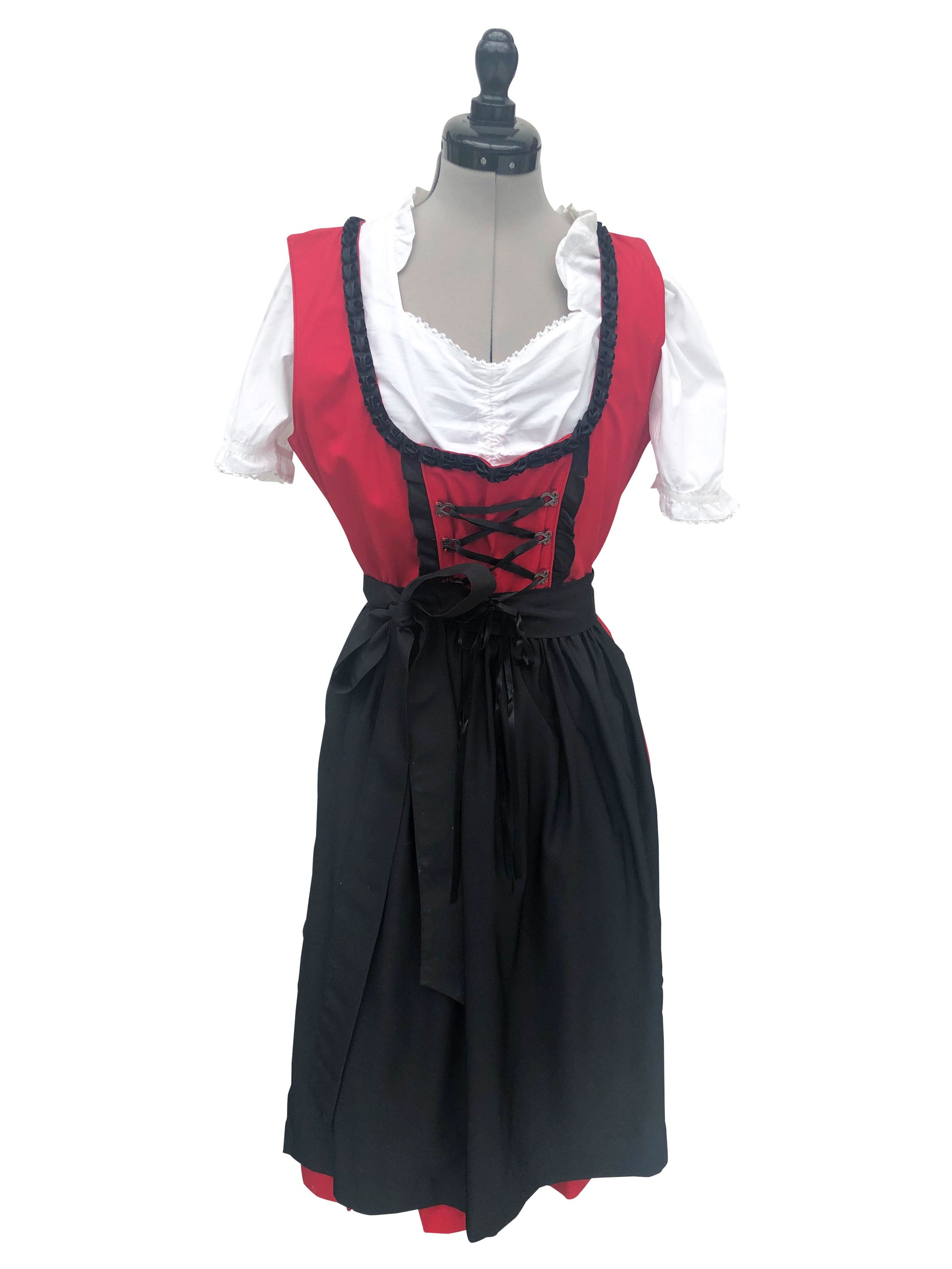 Dieses Dirndl vereint kräftiges Rot und klassisches Schwarz zu einem markanten Look. Das rot eingefasste Oberteil mit schwarzer Umrahmung setzt einen schönen Kontrast zur schlichten schwarzen Schürze. Ein traditionelles Outfit mit modernem Touch, perfekt für jeden Anlass! 🔴⚫