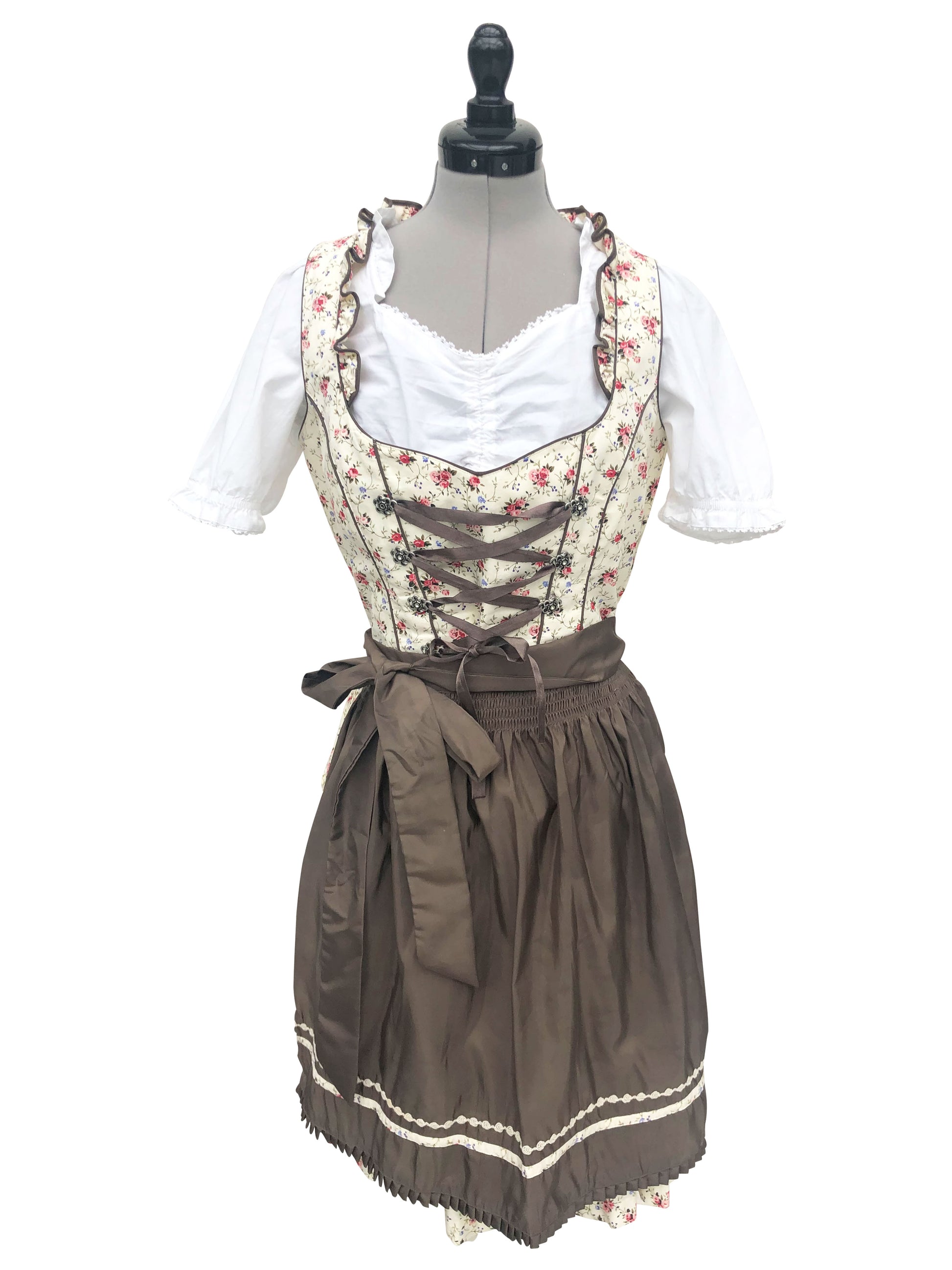 Sanftes Dirndl in Beige mit zartem Blumenmuster, kombiniert mit einer schlichten braunen Schürze. Der eckige Ausschnitt und der klassische Schnitt machen es zum perfekten Begleiter für traditionelle Feste. 🌸🤎