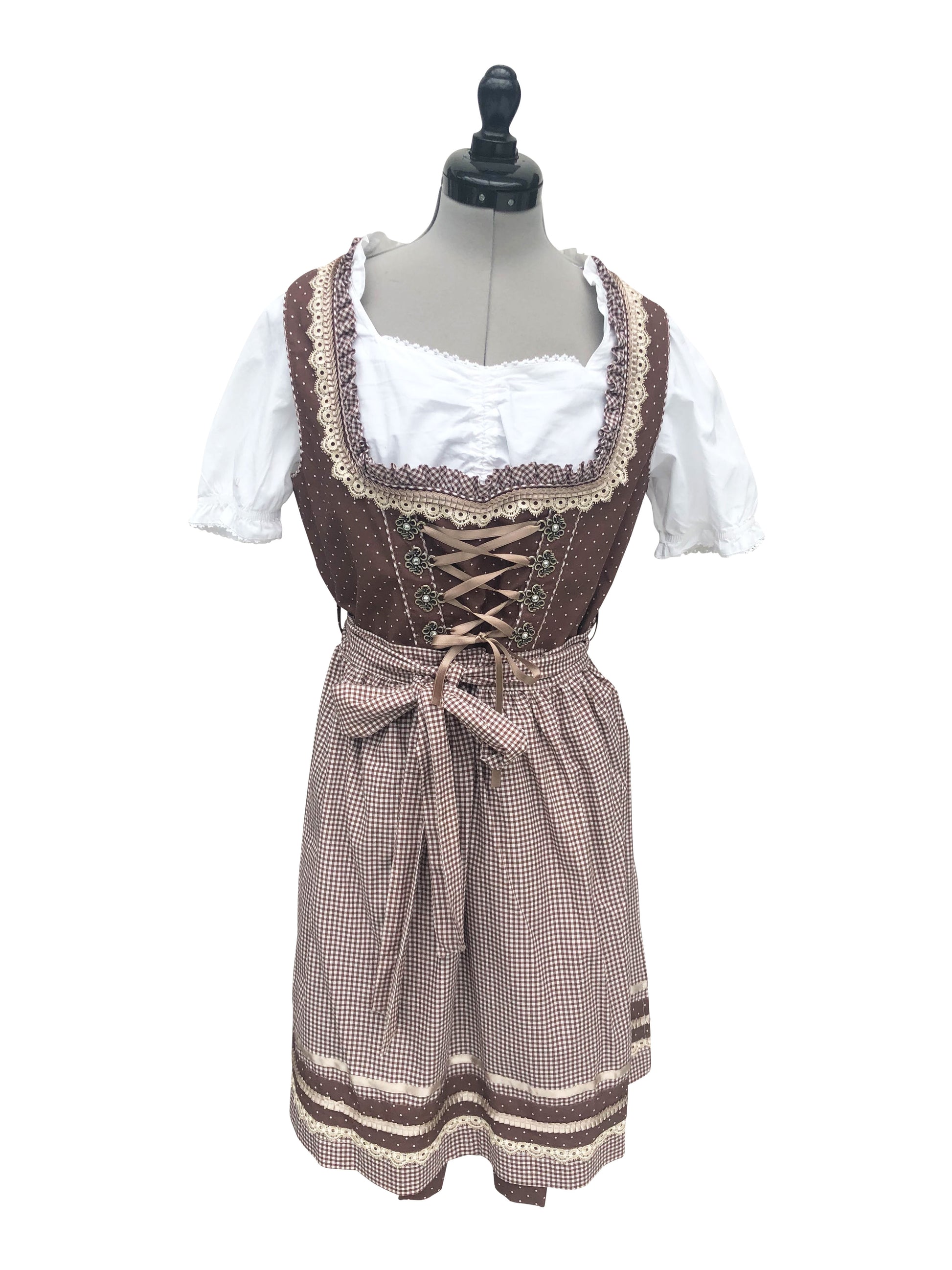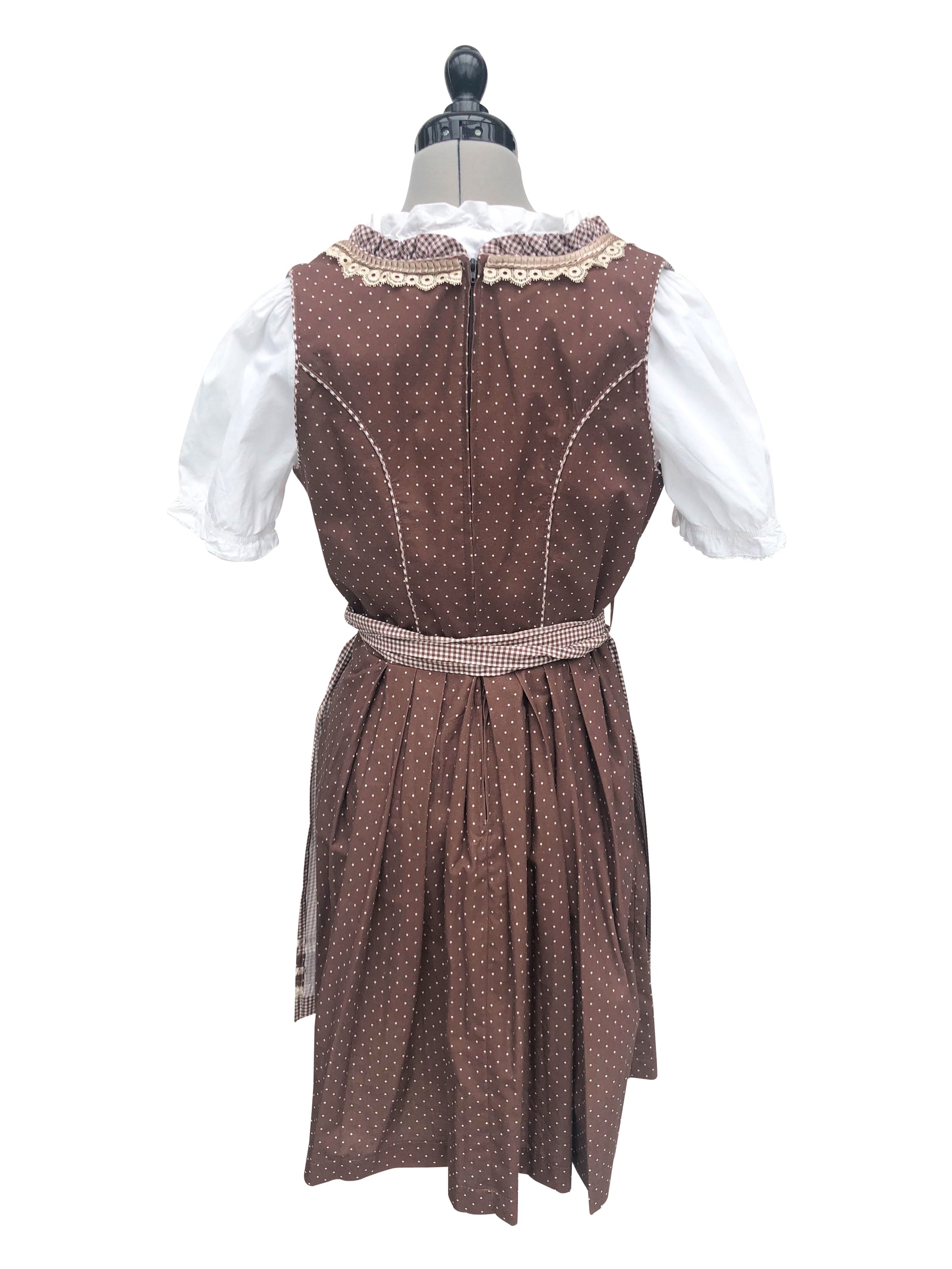 Dieses charmante Dirndl besticht durch seine braune Tupfenoptik und ein edel eingefasstes Oberteil mit Brokat und Spitze. Die karierte Schürze ergänzt das traditionelle Design perfekt. Ein zeitloser Klassiker mit feinen Details! 🤎✨
