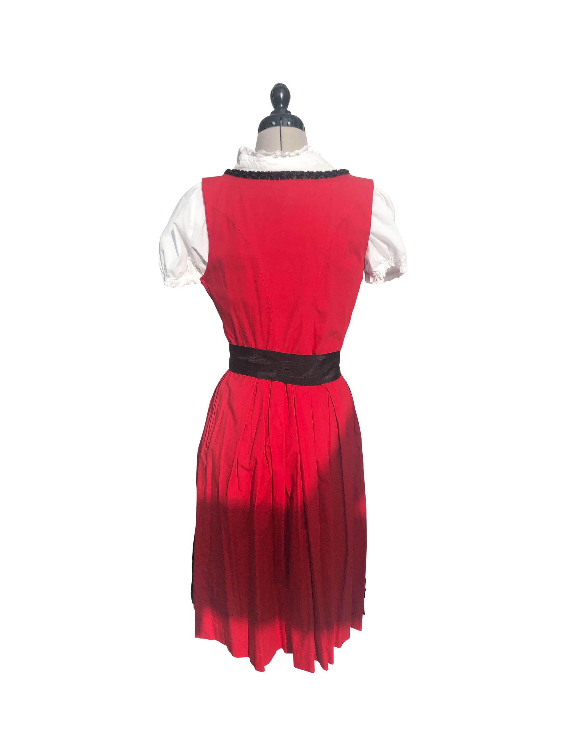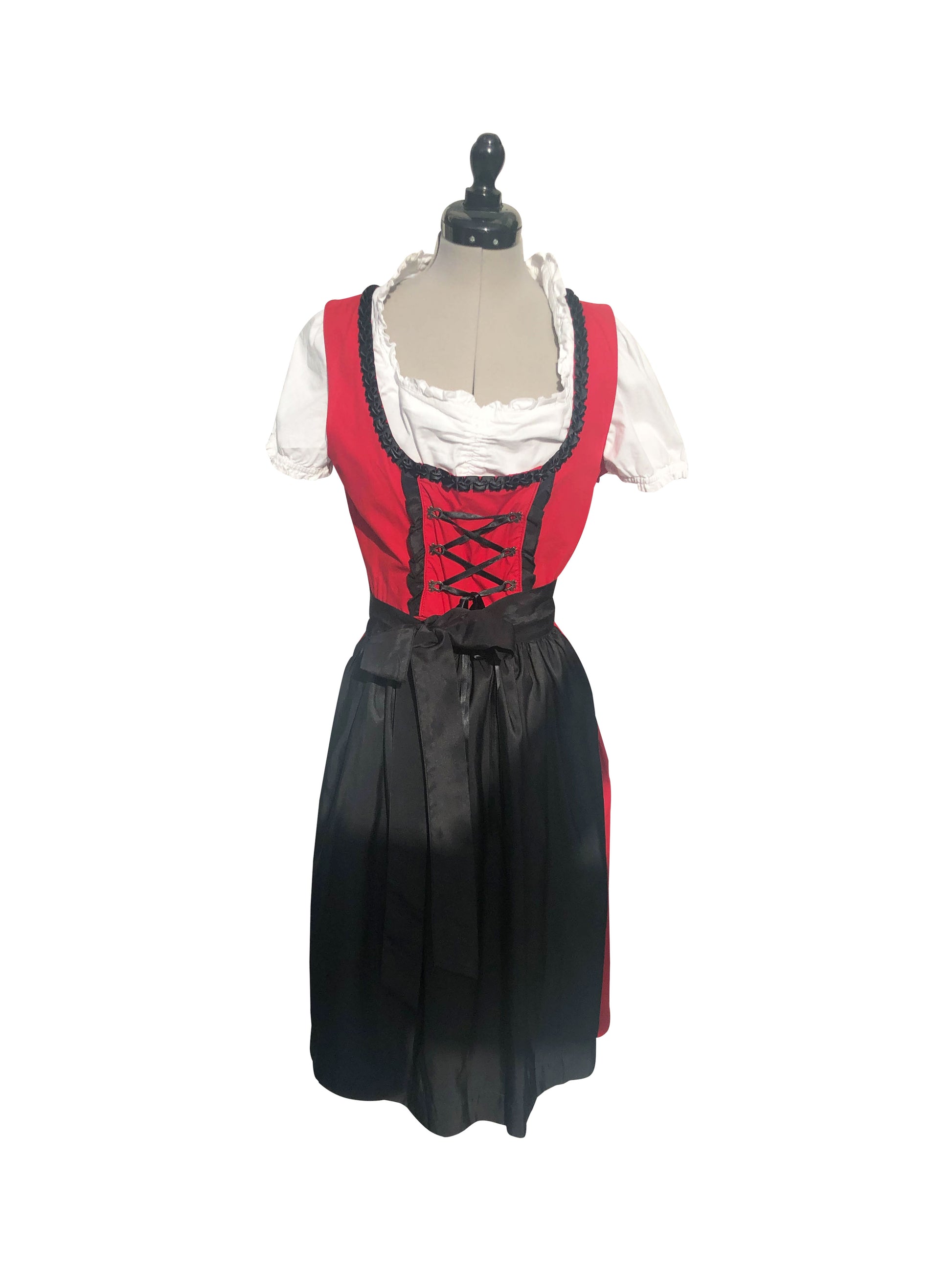 Leuchtendes Dirndl mit rotem Oberteil, schwarz umrandet, dazu eine schlichte schwarze Schürze – ein klassischer Look für jedes Fest! 🔴⚫