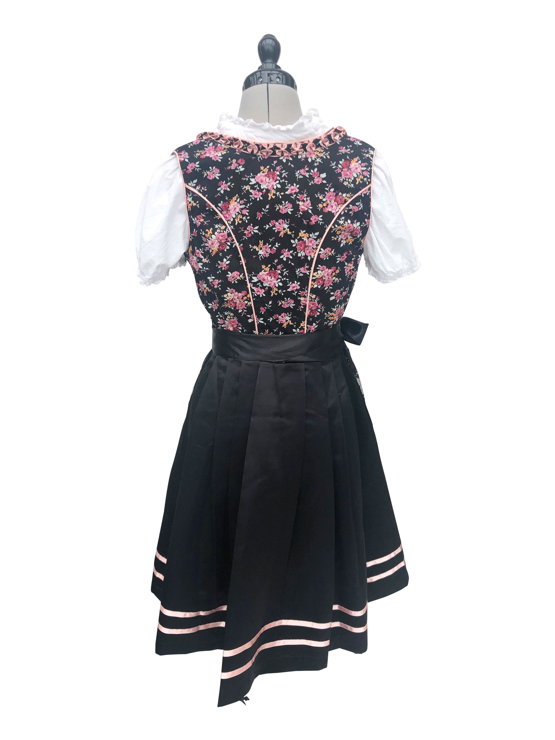 Romantisch und edel 🖤🌹 – dieses Dirndl überzeugt mit einem schwarzen Oberteil, das mit zarten rosa Rosen gemustert ist. Der schwarze Rock sorgt für schlichte Eleganz, während die Schürze aus feiner schwarzer Spitze einen femininen Akzent setzt. Mit dem runden Ausschnitt wirkt das Dirndl klassisch und zeitlos – perfekt für festliche Anlässe und Trachtenevents, bei denen du stilvoll auffallen möchtest. ✨