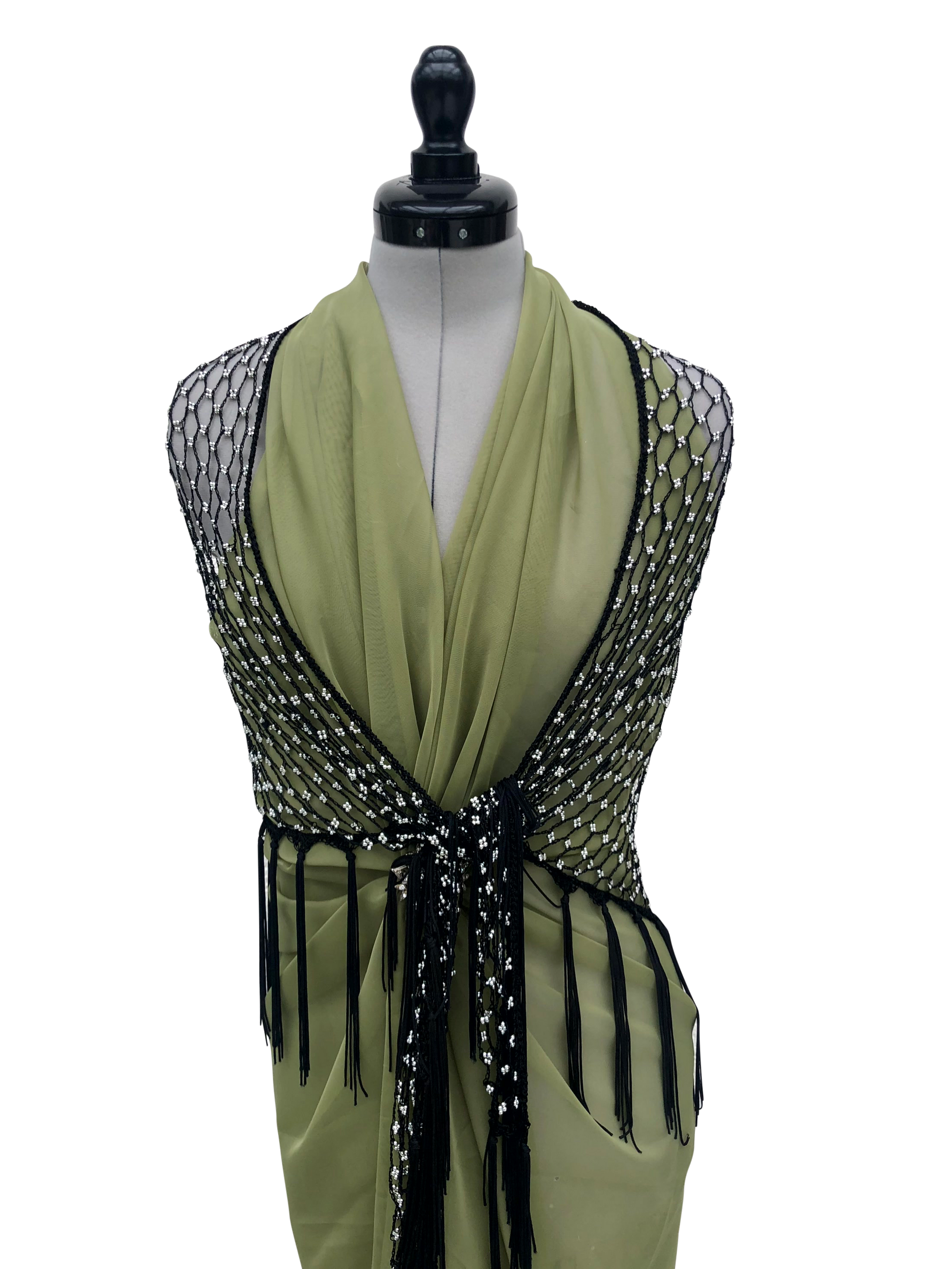 Dieses edle Dreiecktuch in Schwarz überzeugt mit seinem gehäkelten Netzdesign und funkelnden silbernen Kügelchen. ✨ Die Fransen verleihen dem Tuch eine verspielte Note, während das dezente Glitzern für einen Hauch von Eleganz sorgt – perfekt als Accessoire zu Abendkleidern oder festlichen Outfits. 🖤