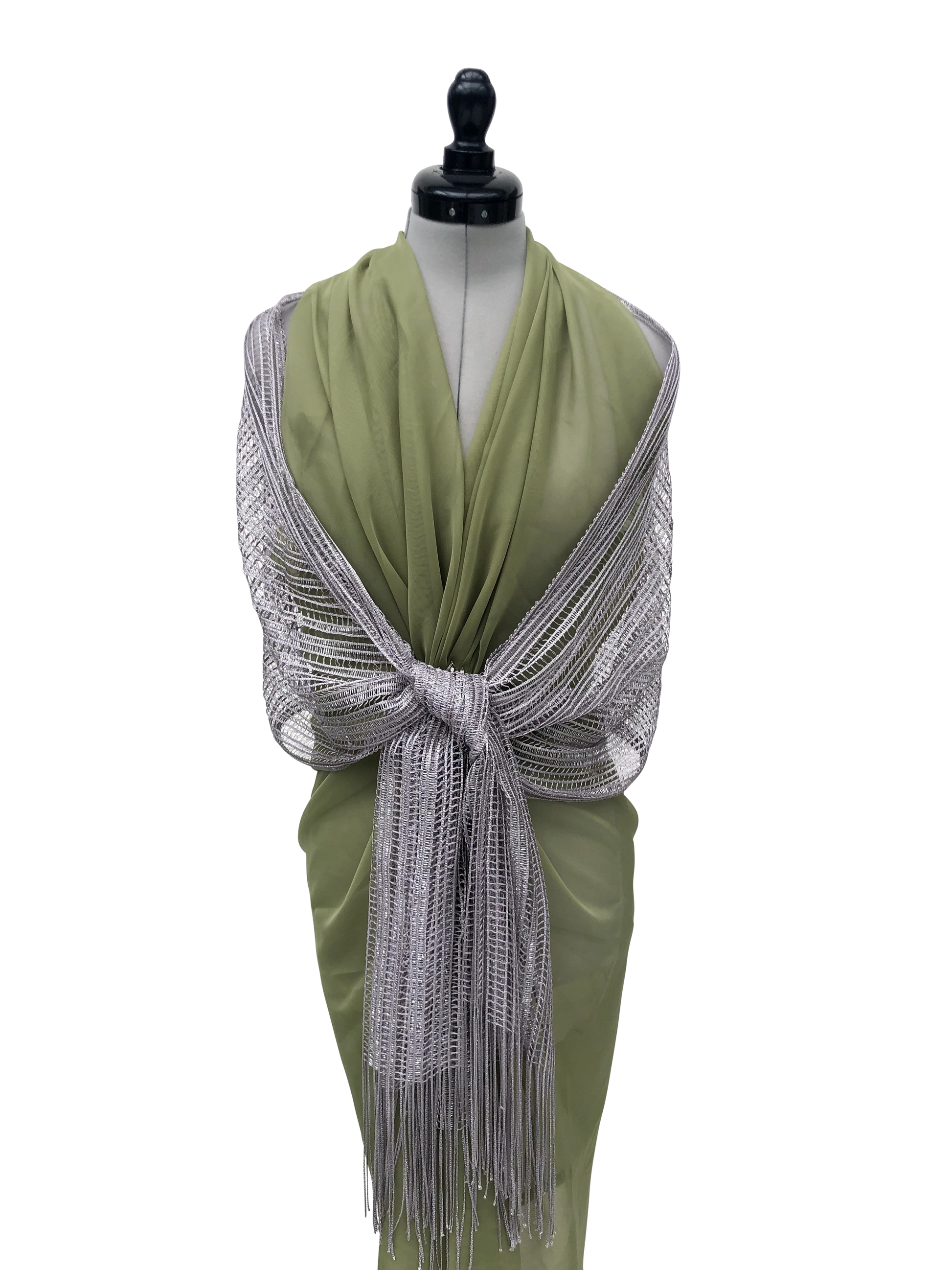 Leichtes Umhängetuch ✨ – aus silbergrauem, gelochtem Häkelstoff mit verspielten Fransen. Ein eleganter Begleiter, der deinem Outfit Textur und einen stilvollen, festlichen Akzent verleiht. 💫